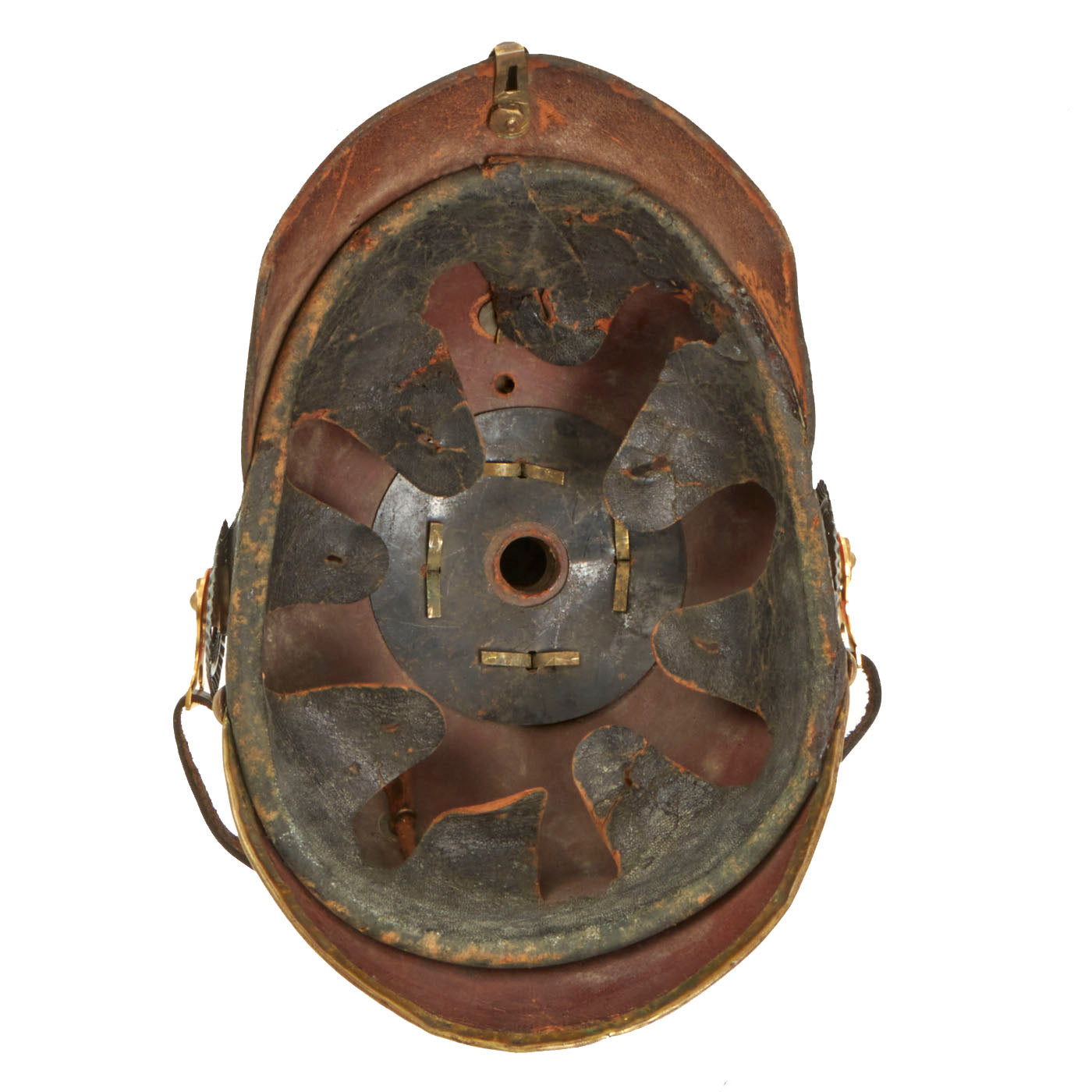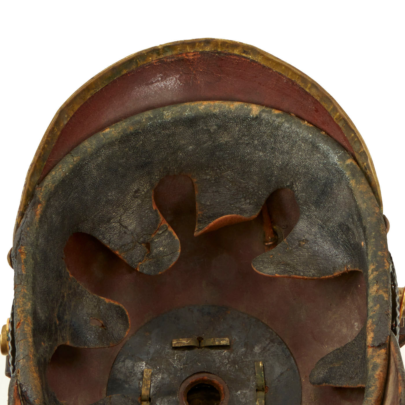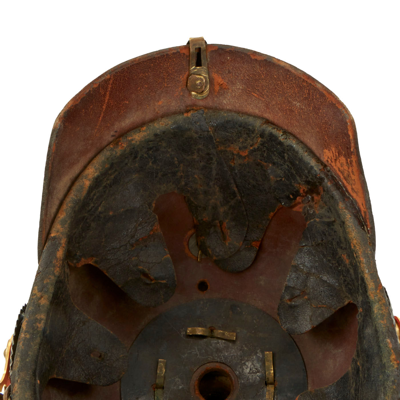 The leather liner is still in good shape with 2 small holes and some wear present, but is missing the top leather tie, and seems to be around a size 56cm. The lacquer finished leather is in good condition, with the usual age cracking and some areas of finish loss. The shape of this pickelhaube is preserved excellently, without the usual sagging that is often seen. The front and rear visor stitching looks to be fully intact, and hasn't rotted out as many do. There seems to have been minimal leather shrinkage on this example, and it displays great.