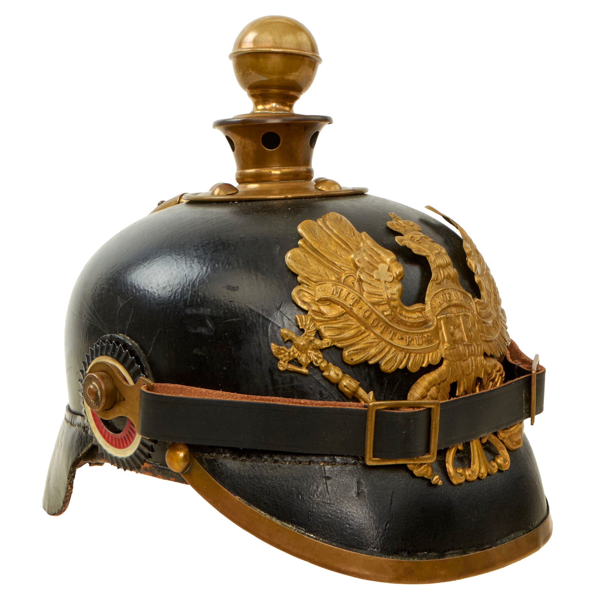 Original Item: Only One Available. This is a very good condition Imperial Prussian Artillery enlisted man's Mannschaften (other ranks) pickelhaube, which has a very interesting history! On this version of the Pickelhaube, a ball representing a cannon ball replaced the usual spike, leading this to be referred to as an Artillerie Kugelhelm (Artillery Ball-Top Helm). The M1895 was the final pre-1914 evolution in a long series of pickelhaube helmets. It displays a lovely condition brass Prussian spread eagle helmet plate and comes complete with partial original leather liner, chinstrap, and both the Prussian and National Cockades! The helmet retains the correct all brass alloy fittings, which still show some of the original gilding. This helmet started out life as a Pickelhaube, worn by a soldier of Infantry Regiment 69, before being sent back to a depot and being refitted as a Kugelhelm for issue to an Artilleryman.