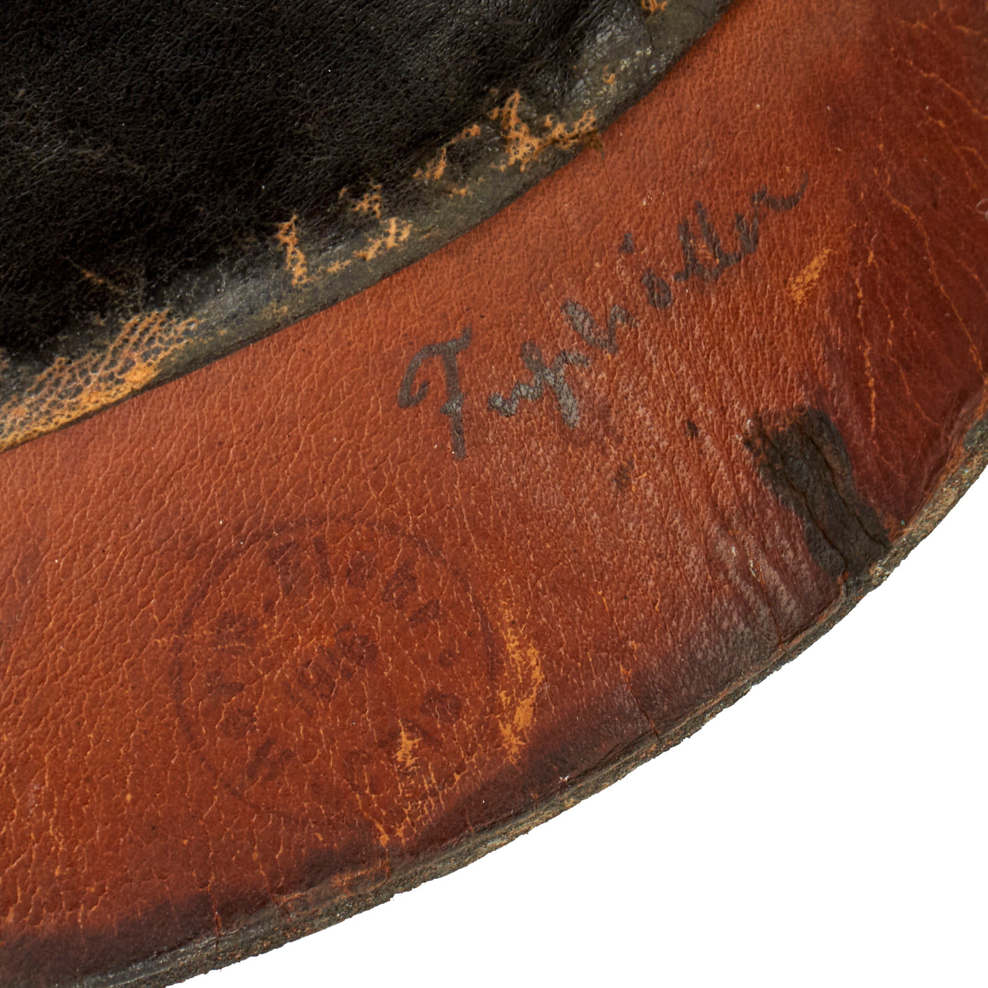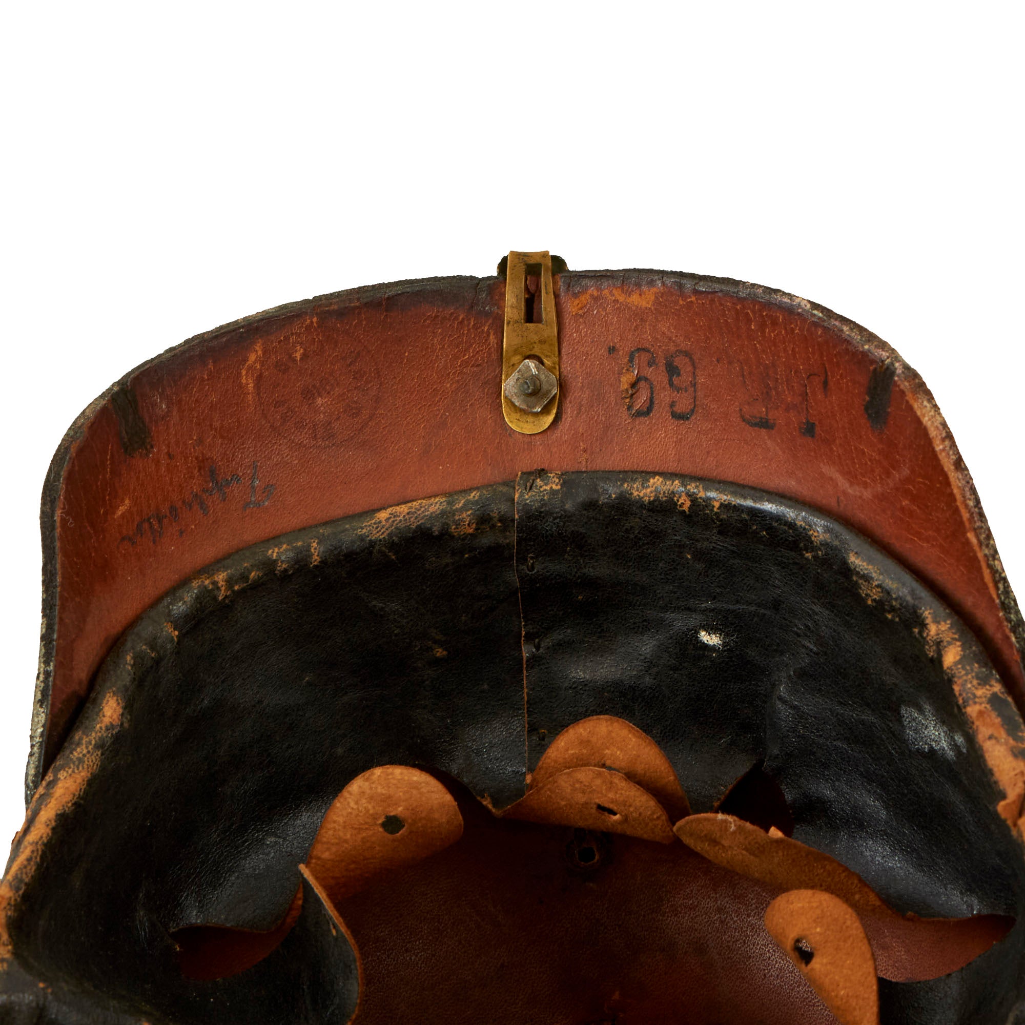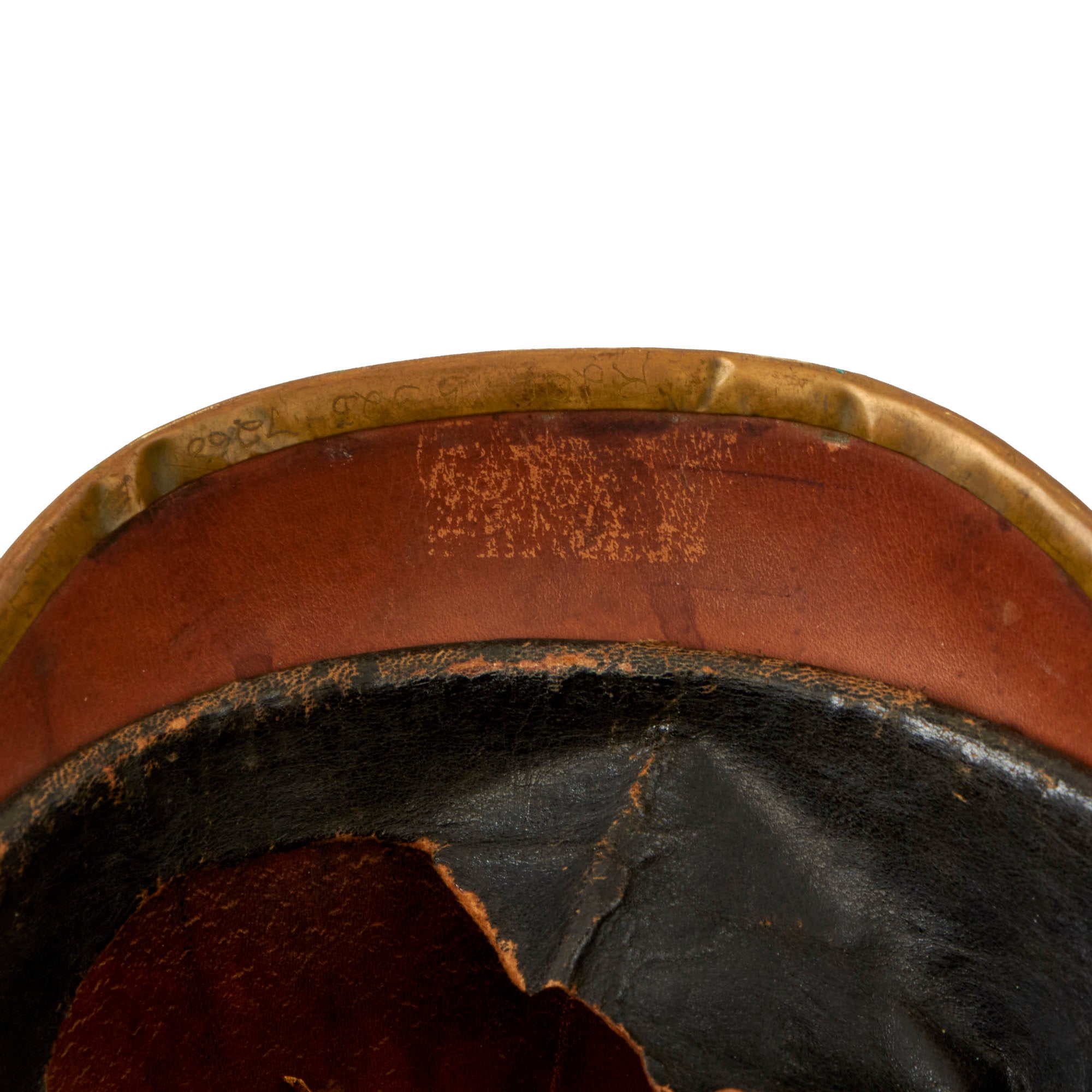 The leather lining is missing one of the tongues, but is otherwise in good condition. The rear visor is marked with J.R.69 for Infantry Regiment 69, a 1916 maker’s stamp, and a soldier’s written name, Fuphöller? There is no size stamp, but it’s roughly a size 56.