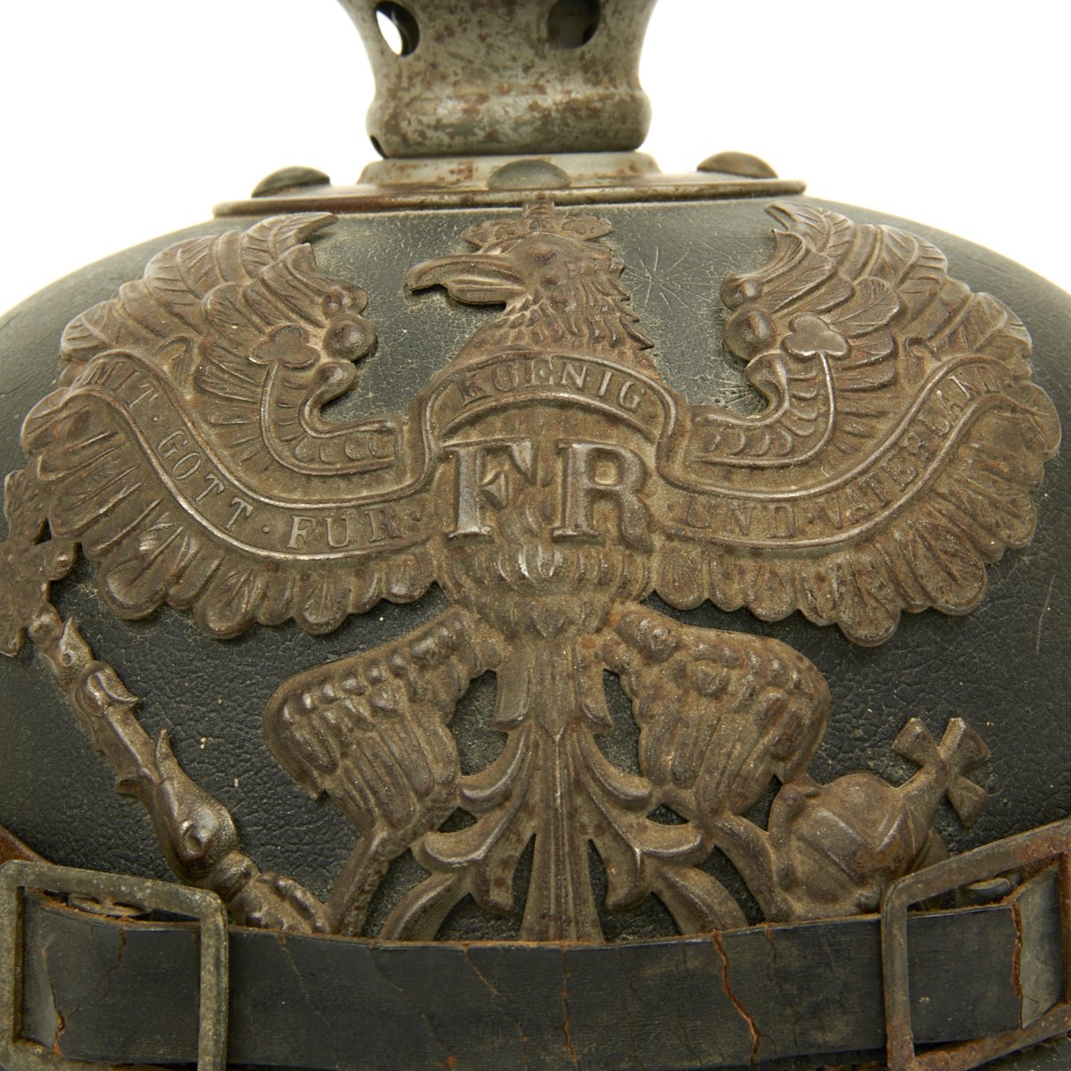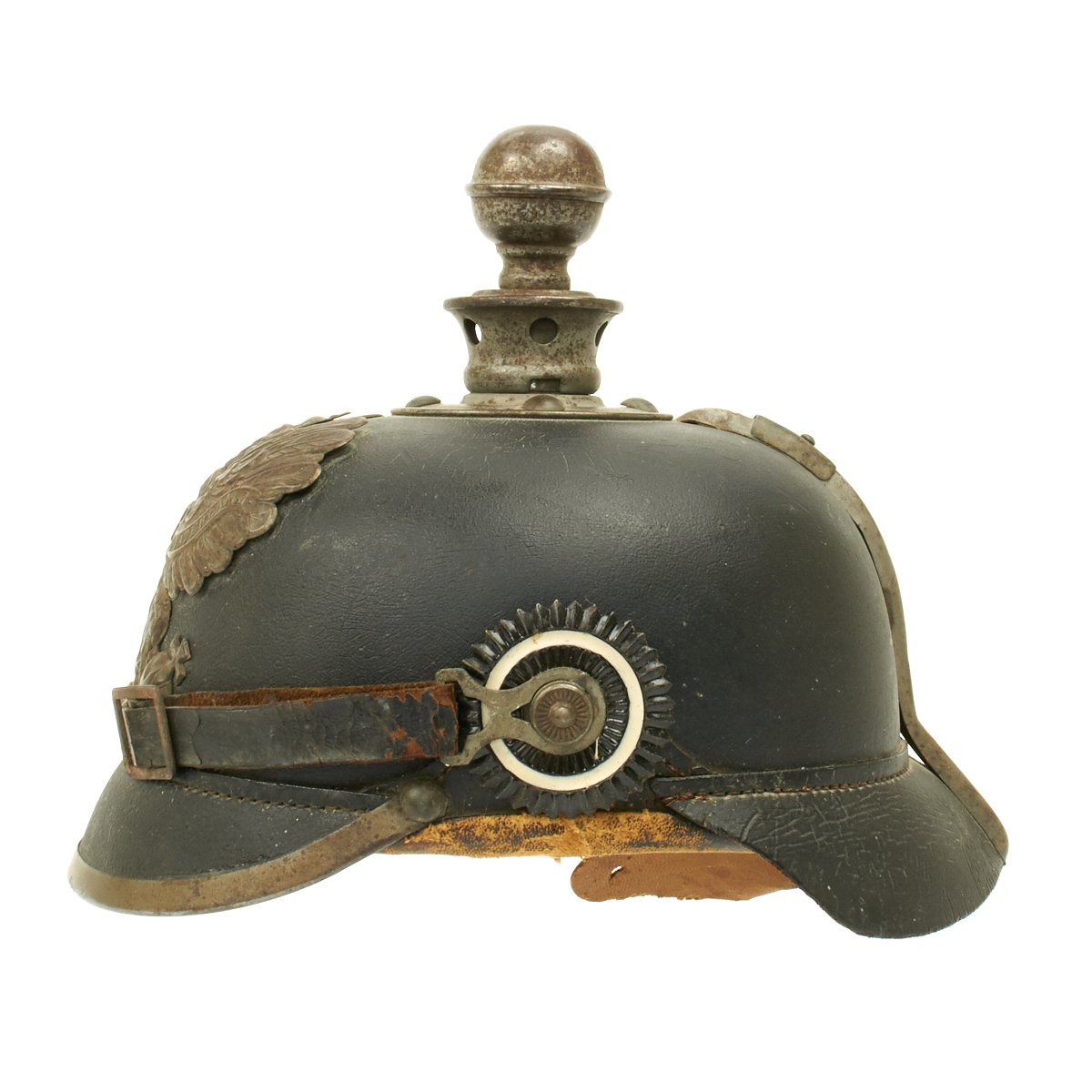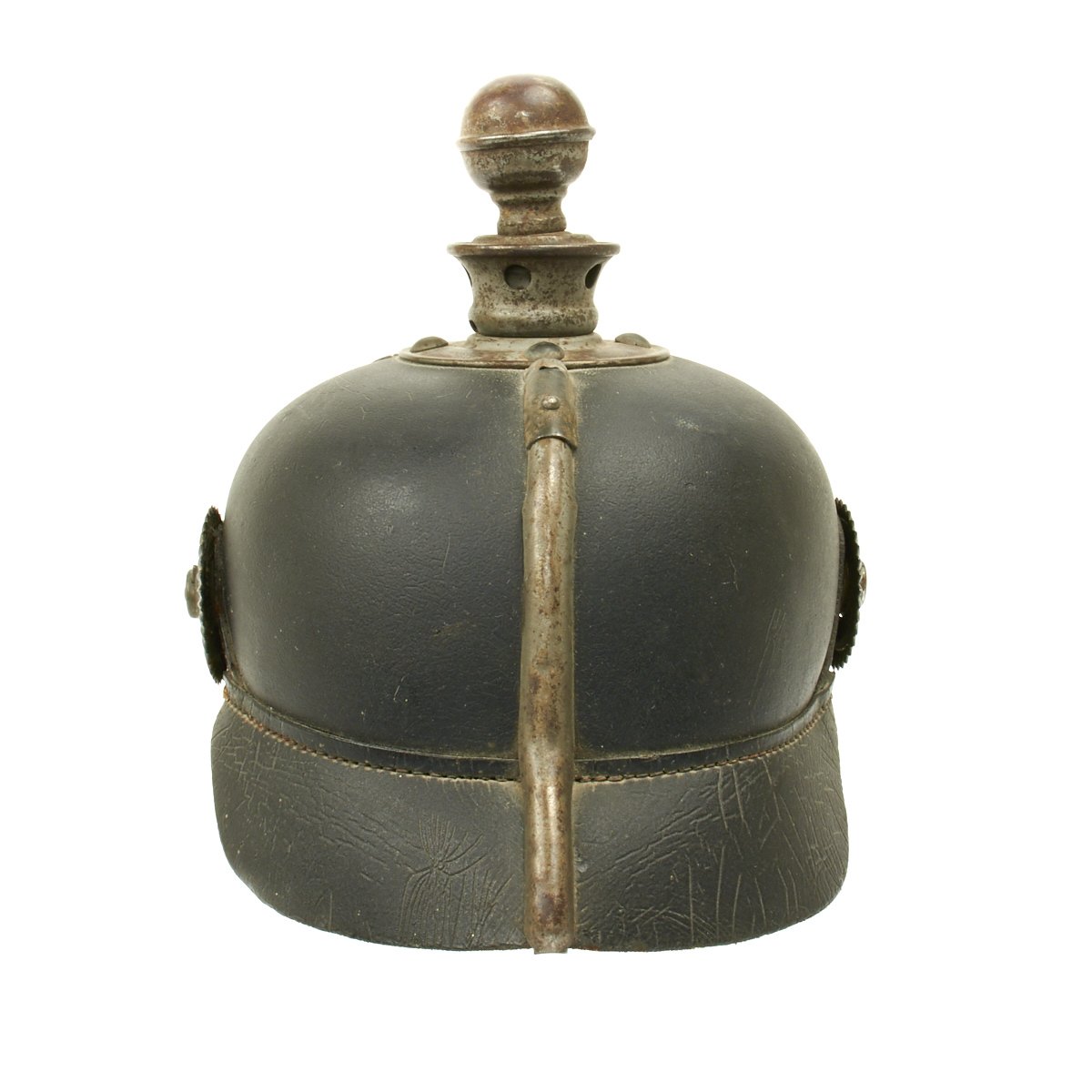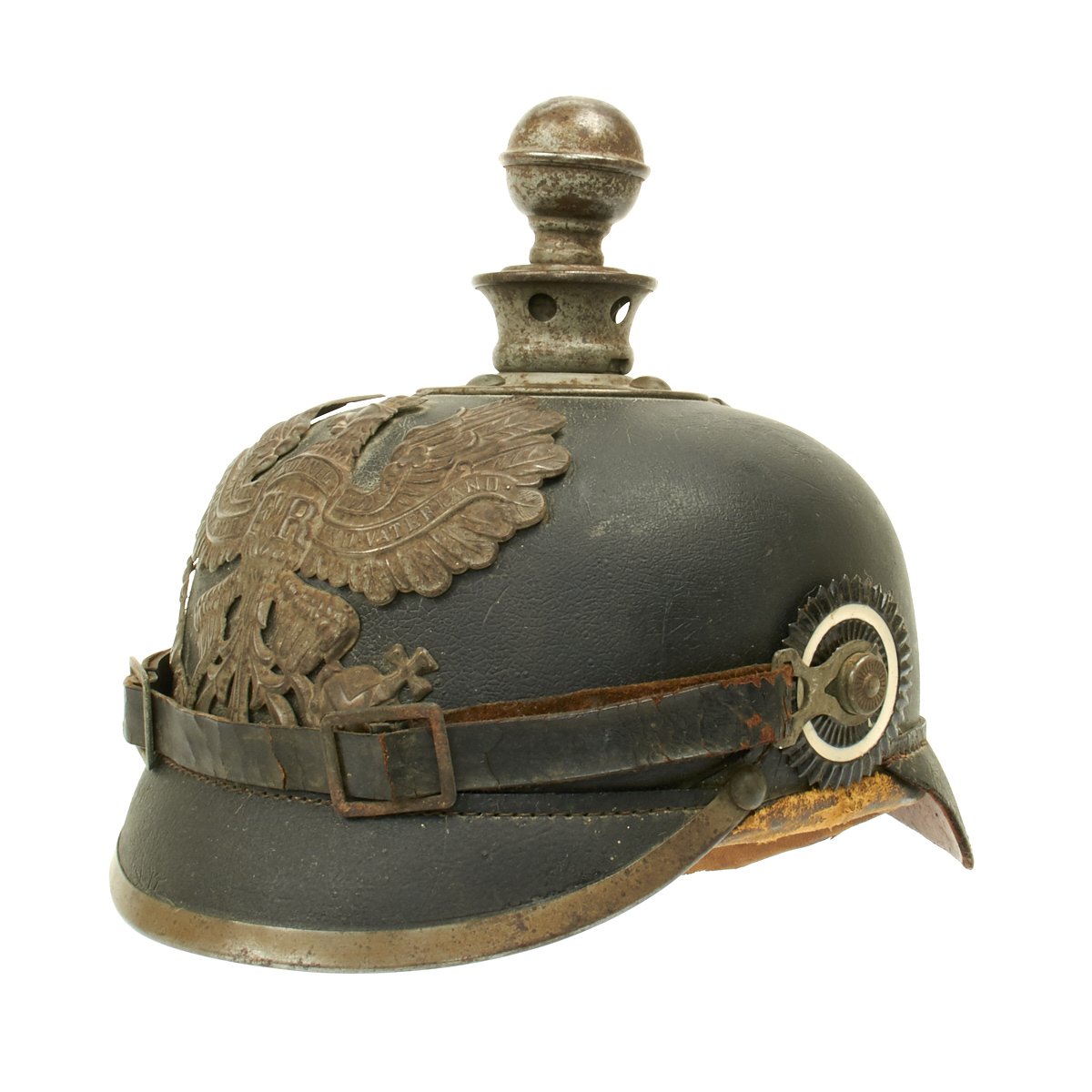 Original Item: Only One Available. A rare nice example of an Model 1915 Prussian Artillery other ranks pickelhaube, with economy grey fittings. In 1915-1916 it was decided, as a way of economizing and aiding the war effort, that pickelhaube fittings would no longer be of brass, silver or tombac. Instead they were replaced with the cheaper and less visible oxidized grey steel fittings.
