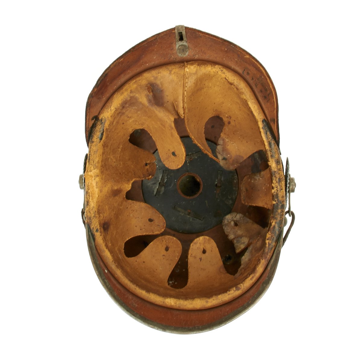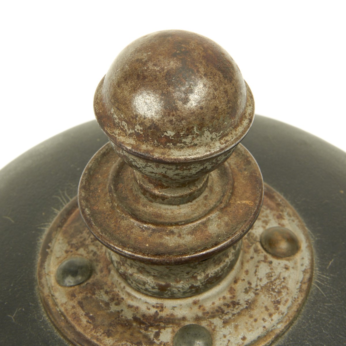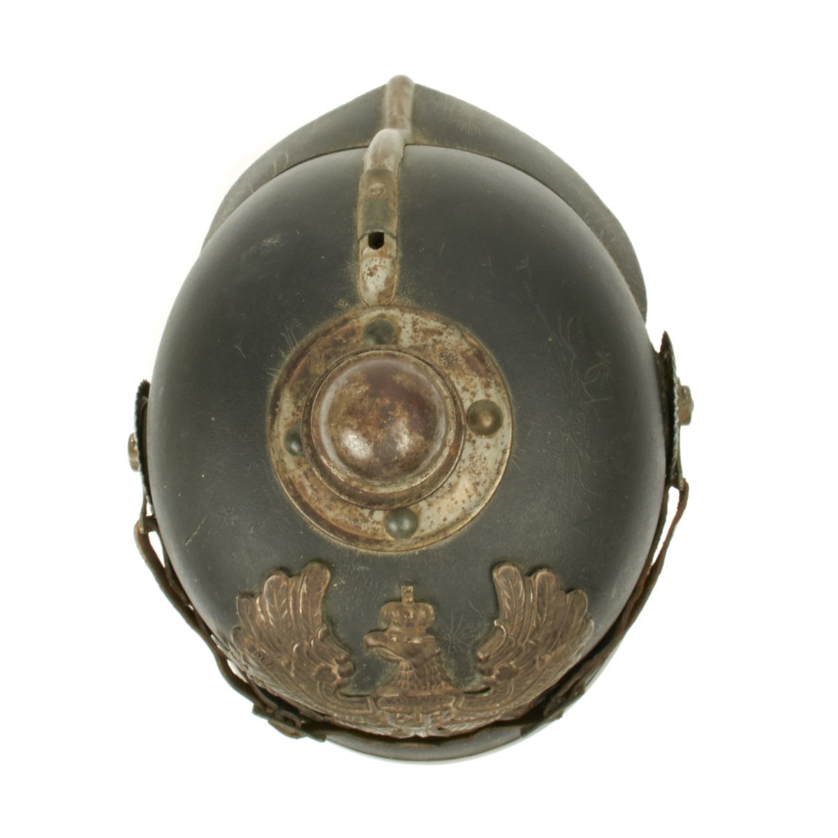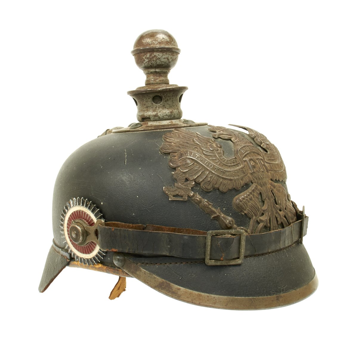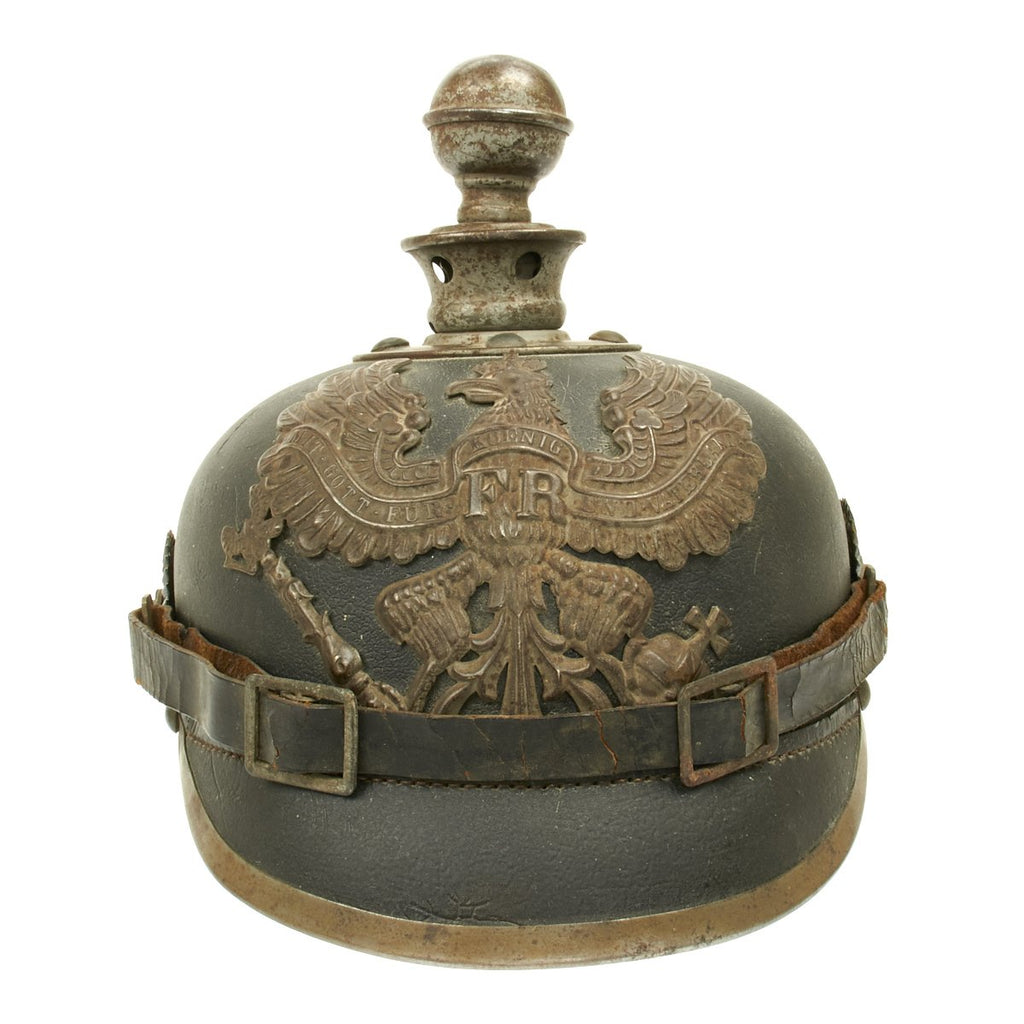 Original Item: Only One Available. A rare nice example of an Model 1915 Prussian Artillery other ranks pickelhaube, with economy grey fittings. In 1915-1916 it was decided, as a way of economizing and aiding the war effort, that pickelhaube fittings would no longer be of brass, silver or tombac. Instead they were replaced with the cheaper and less visible oxidized grey steel fittings.