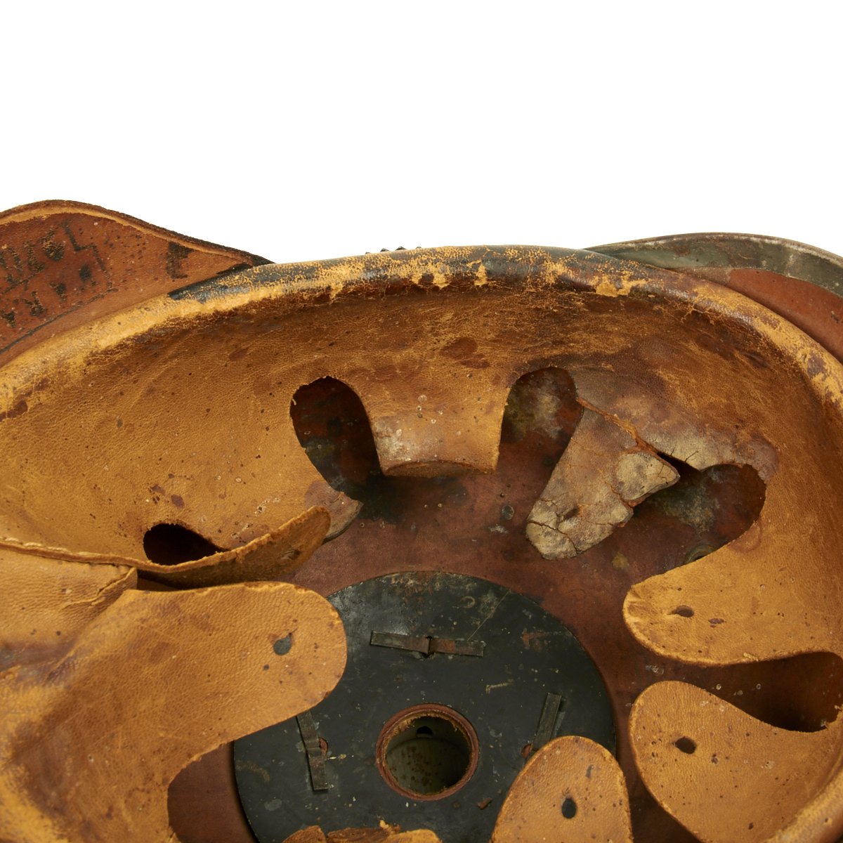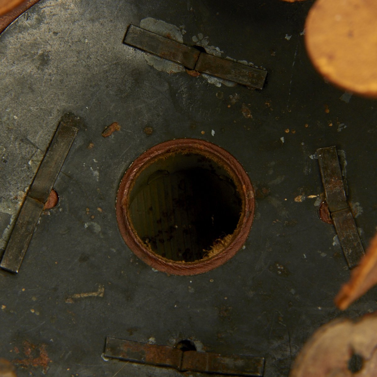 The black leather shell shows normal age crazing and wear. The smooth finished leather is in good condition having no serious defects. The front leather visor has a steel trim in very good condition. The metal spine that descends from the spike's baseplate to the edge of the rear visor is in good condition and is the style with vent slide.