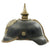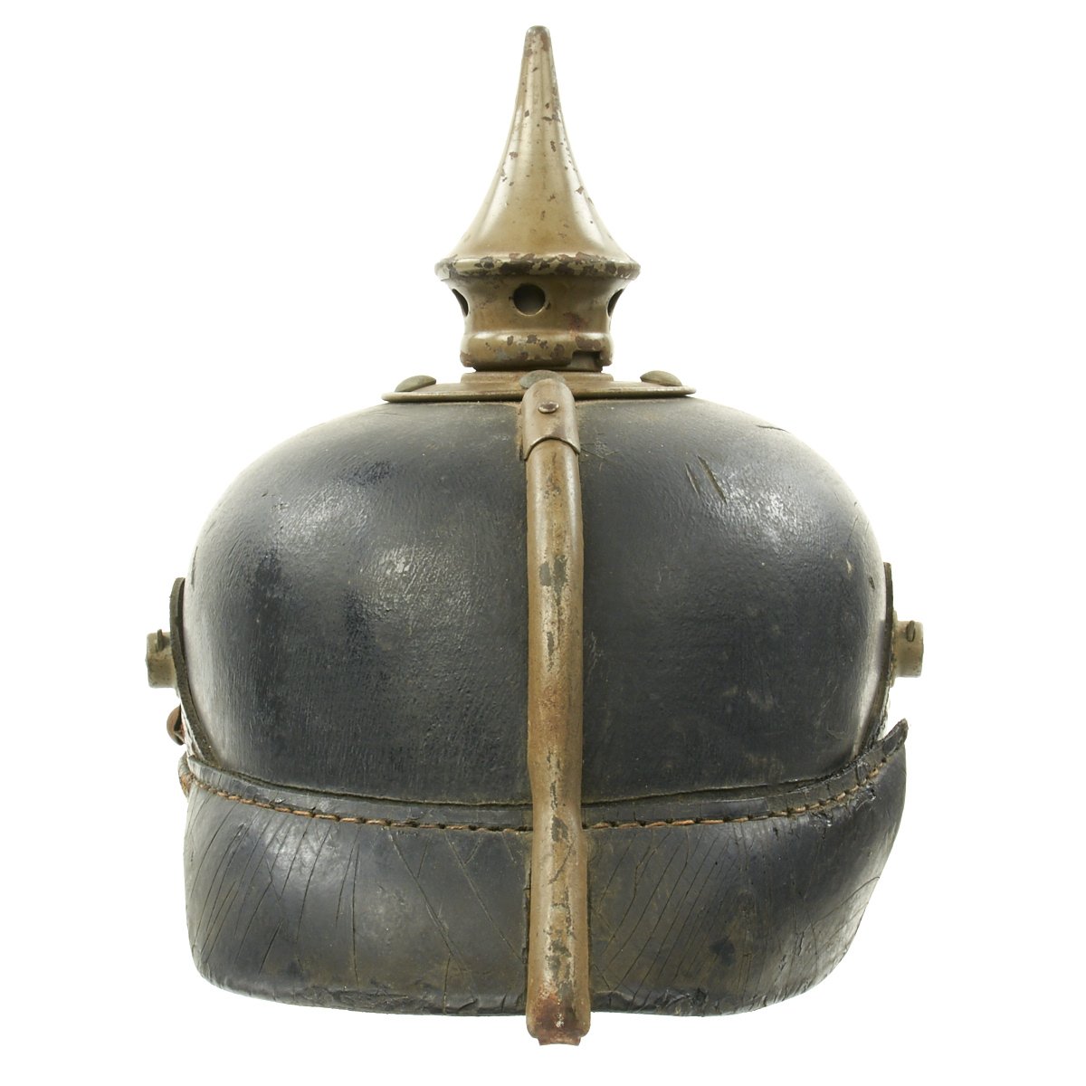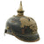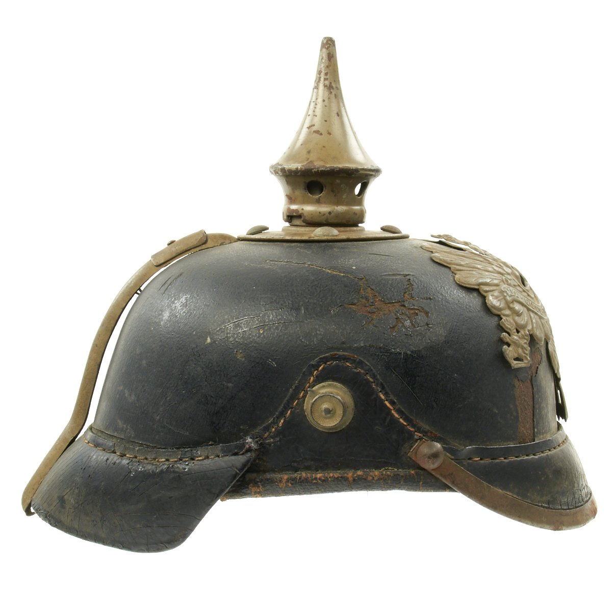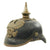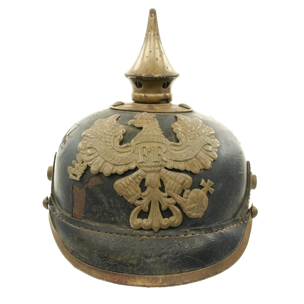 Original Item: Only One Available. This is a good condition Imperial Prussian enlisted man's pickelhaube. The M1915 was the last model of Pickelhaube issued prior to the move to steel helmets. In accordance with the 1915 regulations these helmets would no longer would use brass, silver, or Tombak as the M1895 did. All issued Pickelhaube would now use grey oxidized steel fittings for all Regiments. This helmet features a steel frontplate (wappen), and the crown of this leather helmet displays a vented enlisted removable spike mounted on a brass baseplate, though the spike has oxidized in place.