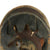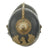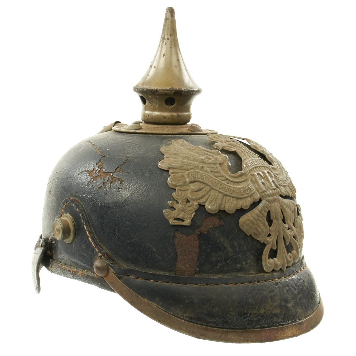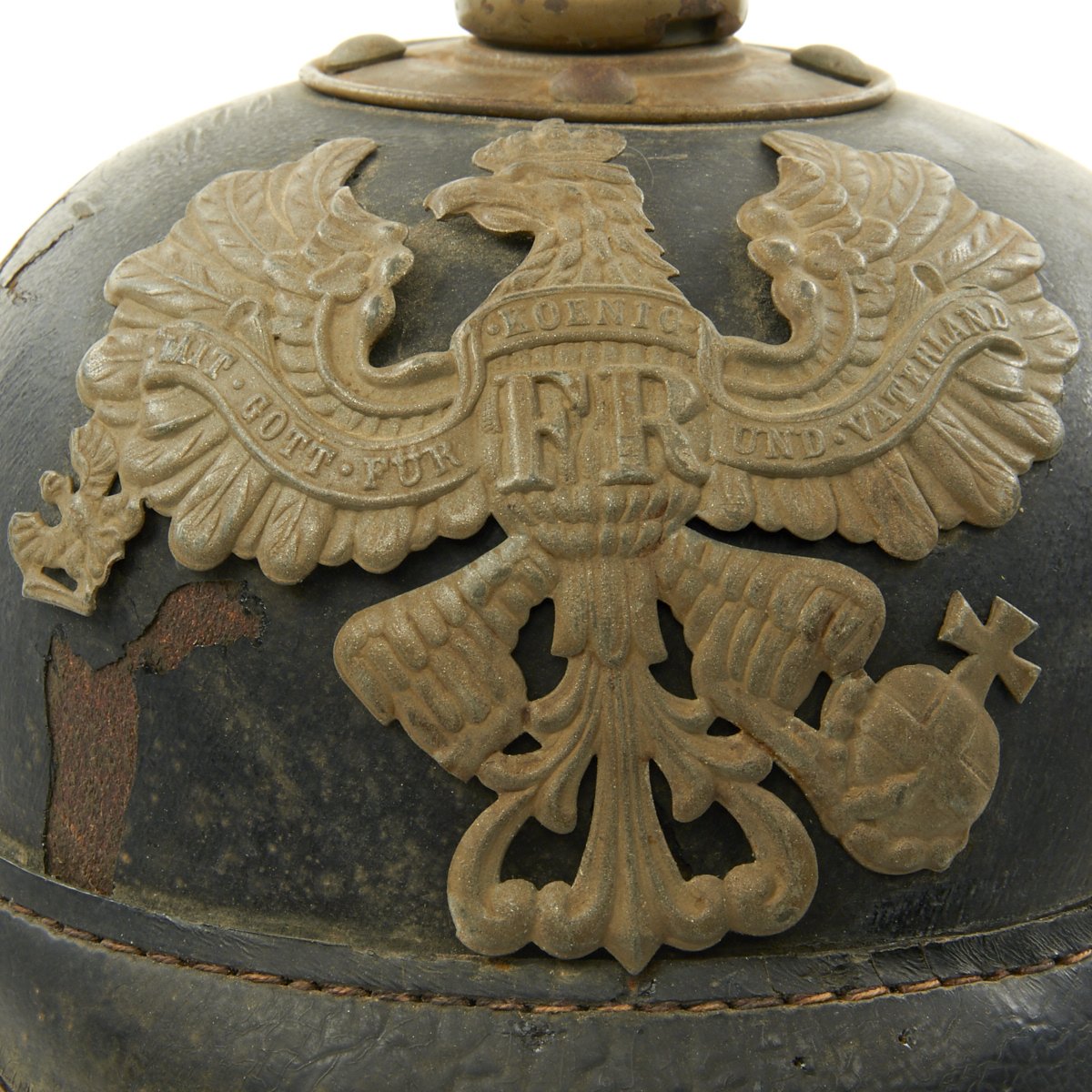 The front wappen features Prussian state eagle clutching a scepter and crown, over the King's motto, "Mit Gott Für Koenig und Vaterland" (With God for King and Country, i.e. Prussia). The scepter on this example has broken off. Oxide finished standard chinstrap lugs are complete and solid. The black leather shell shows normal age crazing and wear. The lacquer finished leather is in good condition having no serious issues but is dry and flaking in some areas. The chinstrap and cockades are missing.