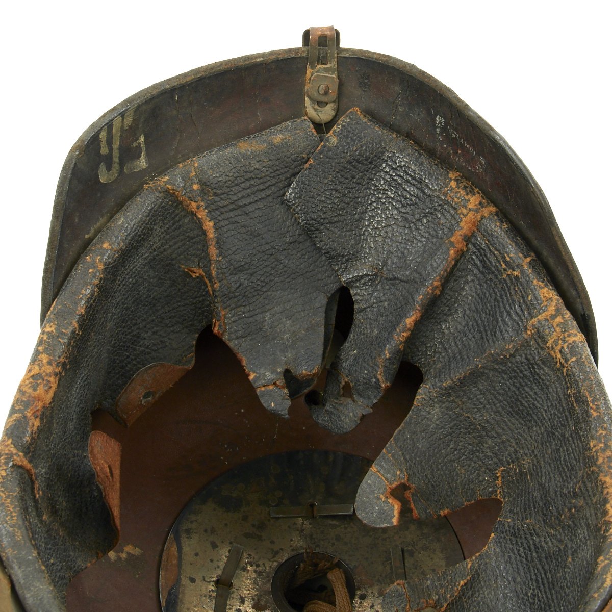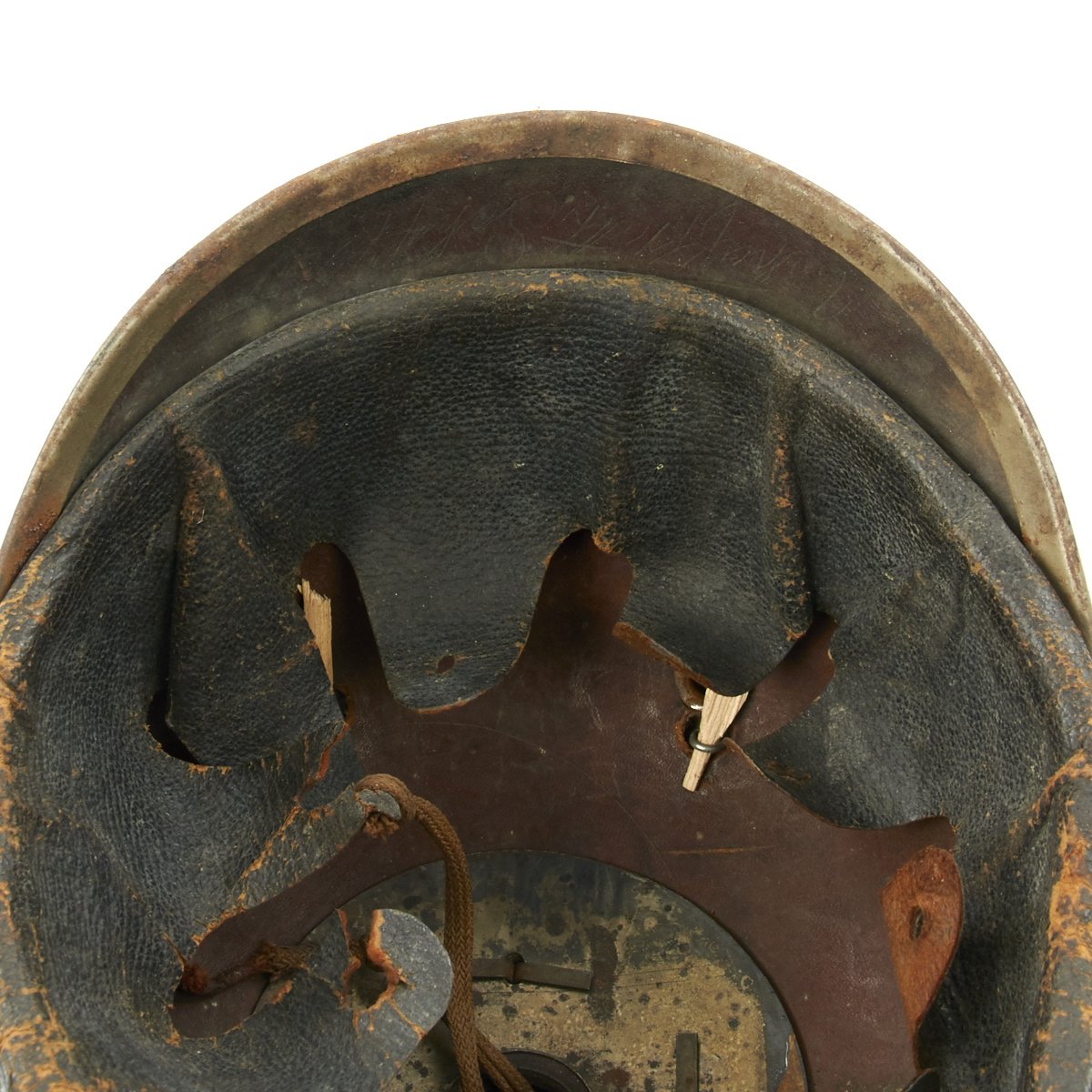 The front leather visor has steel trim in good condition. The metal spine that descends from the spike's baseplate to the edge of the rear visor is also in good condition with functional vent. The interior features a complete original leather liner with drawstring. The rear skirt is maker stamped, though the stamping is not completely clear. Size is marked as 56 cm on the back skirt, which is approximately a US 7.
