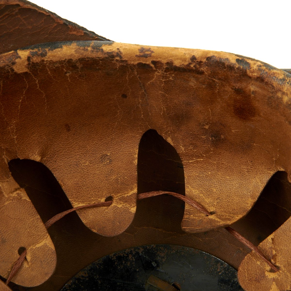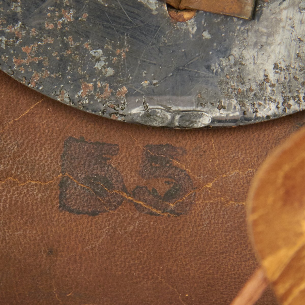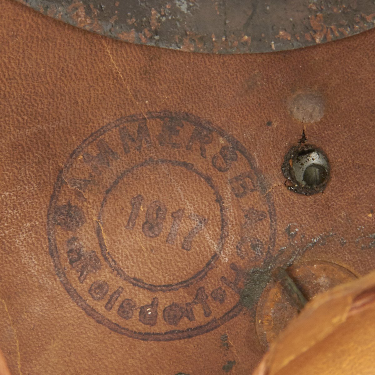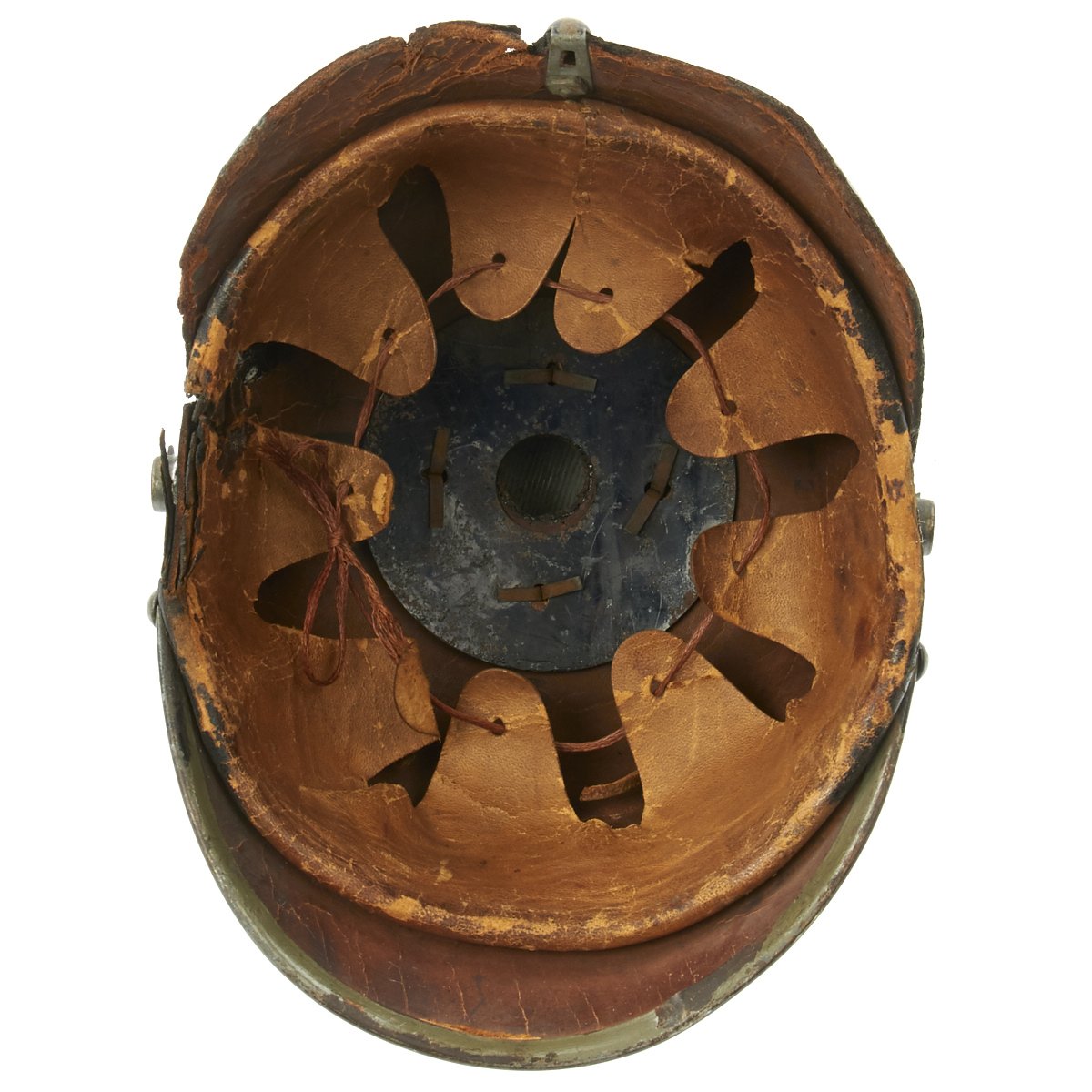 The front leather visor has steel trim in good condition, though the visor itself is a bit loose. The metal spine that descends from the spike's baseplate to the edge of the rear visor is in good condition, though the rear skit is a bit loose.. The interior features a nearly complete original leather liner with original draw string, though it is worn. The inner leather shell is also ink stamped with size 55, as well as a round manufacturer stamp with date marking: