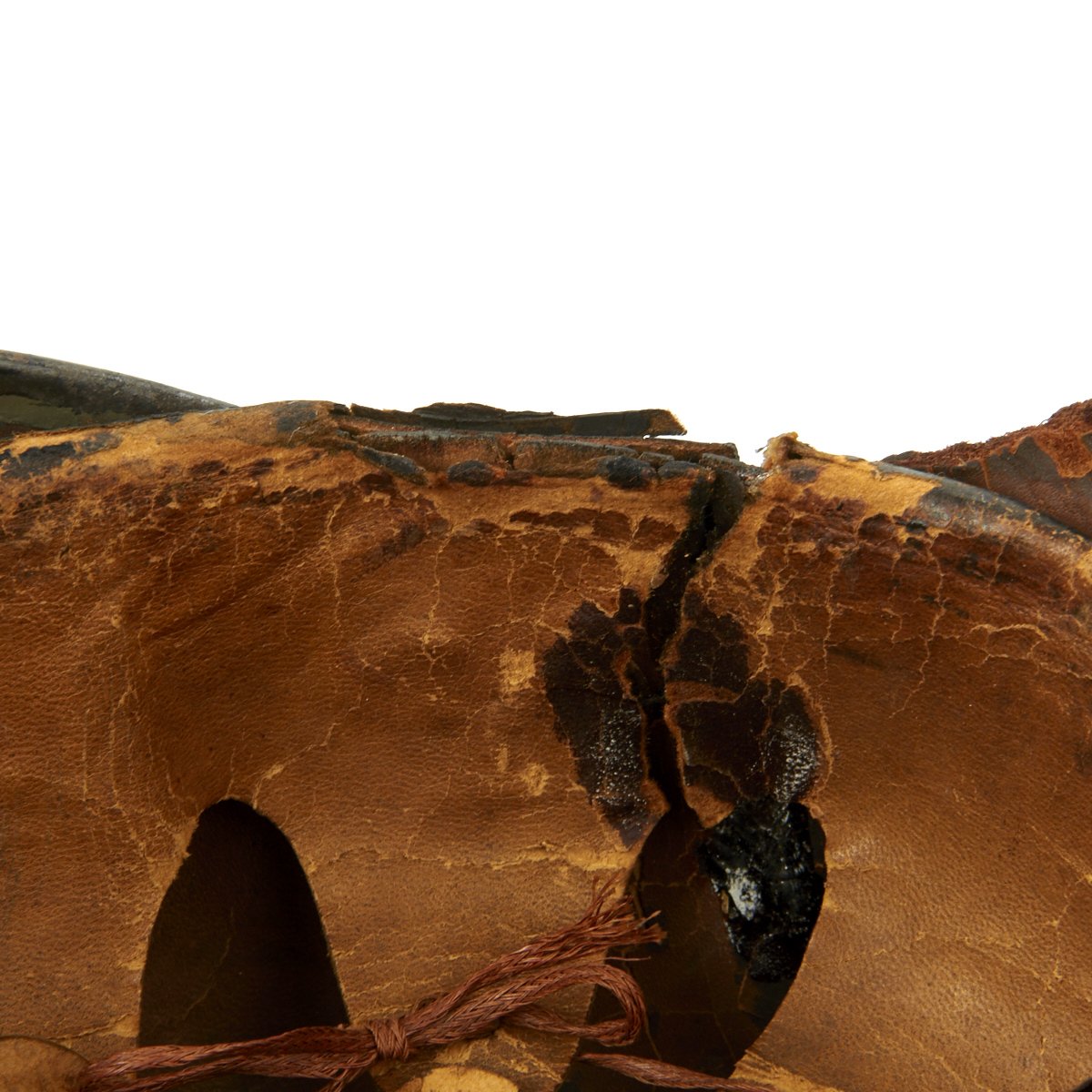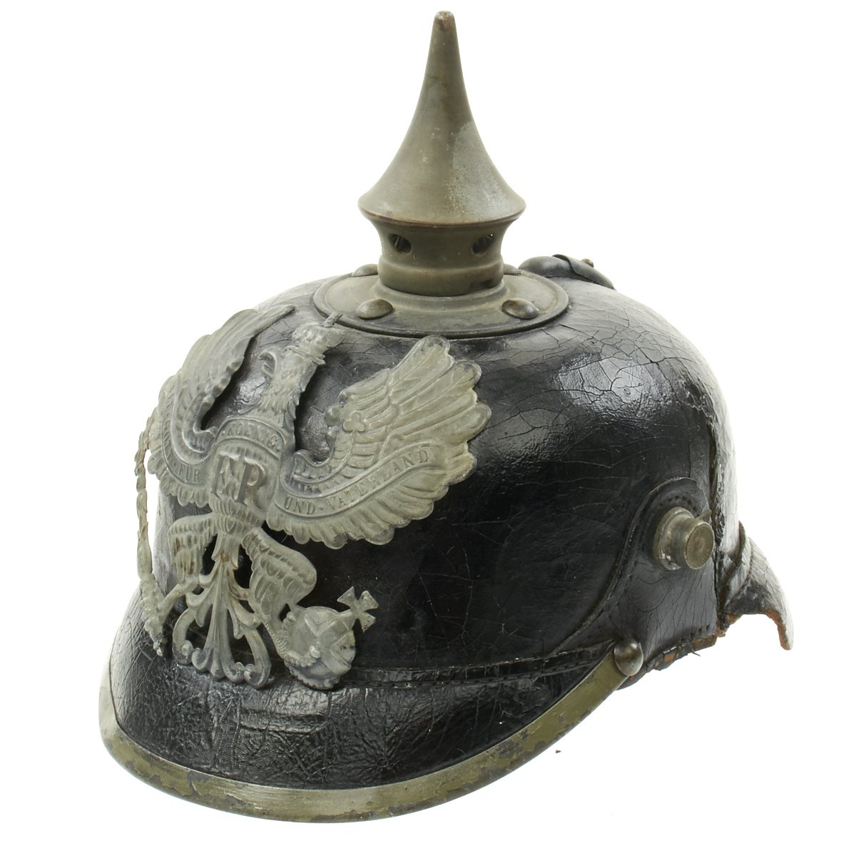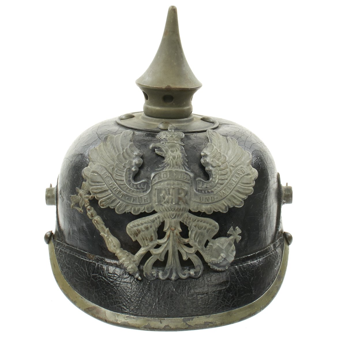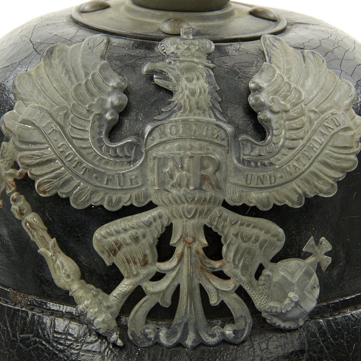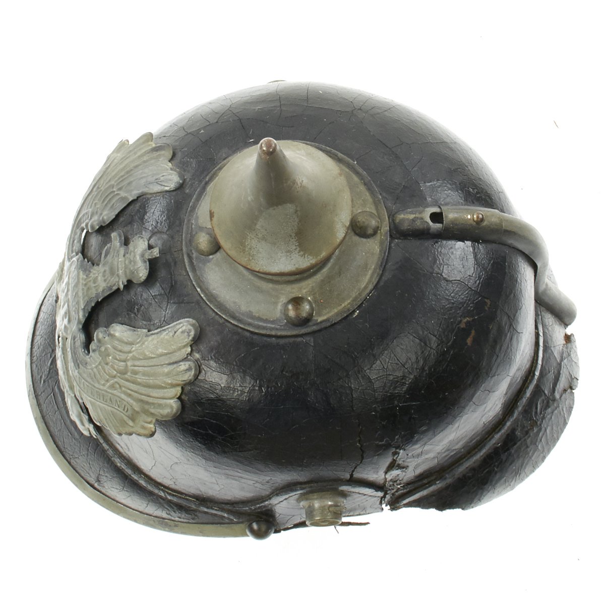 The front wappen features Prussian state eagle clutching a scepter and crown, over the King's motto, MIT GOTT FÜR KOENIG UND VATERLAND (With God for King and Country, i.e. Prussia). It is held in place by the standard leather wedges on the inside of the shell. The leather chin strap and both kokarden (cockades) are unfortunately missing. The black leather finish is good, with the expected checking an cracking of age. The leather on the rear left area of the helmet has degraded a bit. and is soft and cracked.
