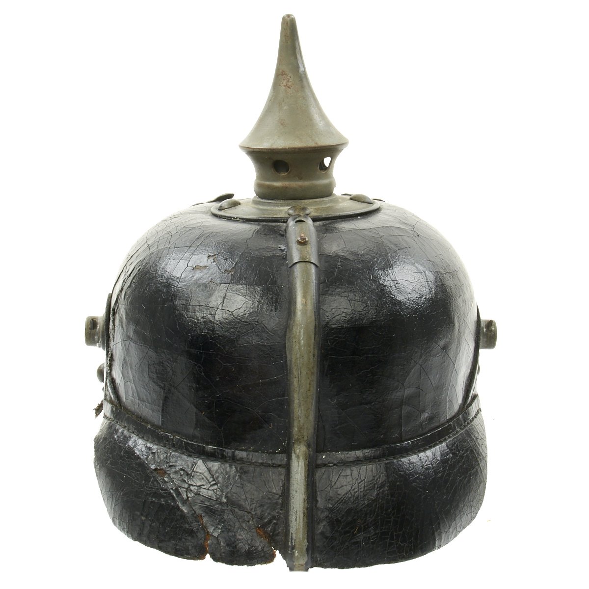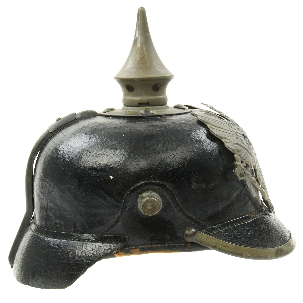 This helmet features an oxidized steel frontplate (wappen), and the crown of this leather helmet displays a vented enlisted removable spike mounted on a brass baseplate. There is also the small adjustable vent on the spine that supports the rear skirt.