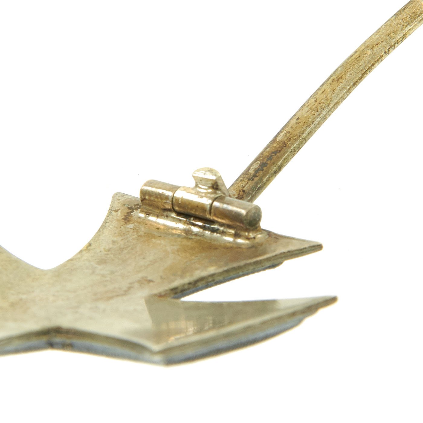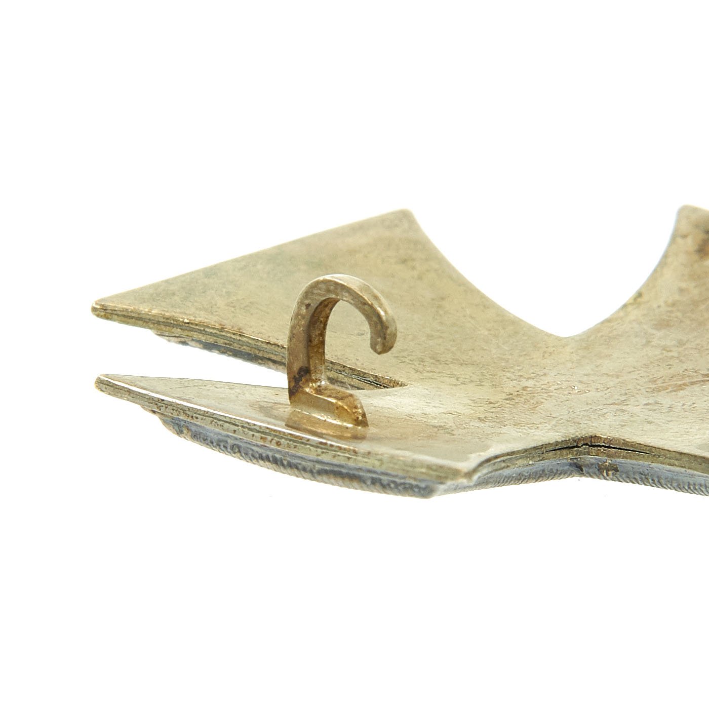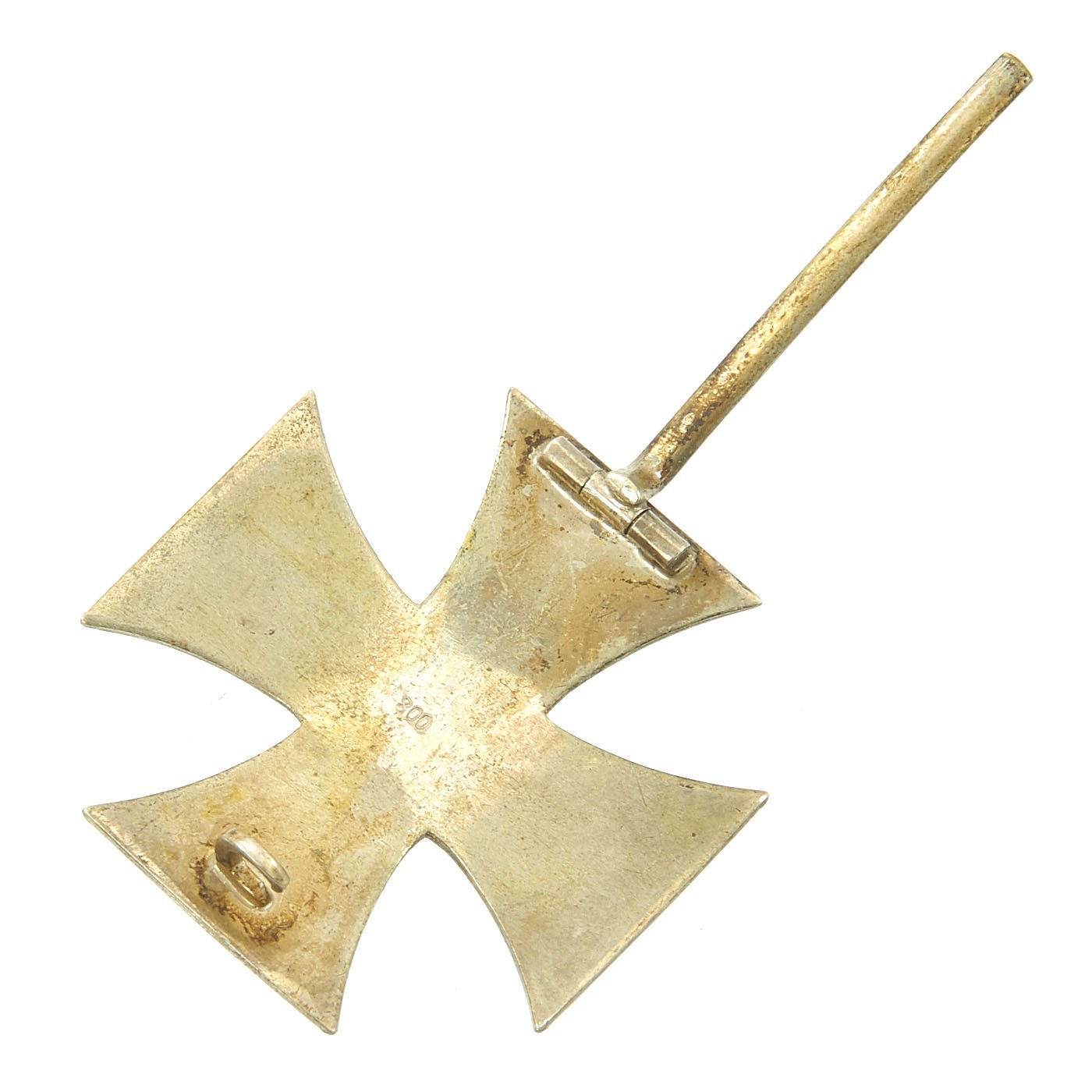 This example is in wonderful condition, and is a "vaulted" design, meaning that it has a curved profile from the side, as opposed to the usual "flat" design. It has the standard hinged retainer clip on the back, and has a lovely tarnished silver patina, with most of the original black paint retained. It is not marked, which is not unusual, as only some of the makers would put any type of marking on the rear. It is however marked with 800, which is the silver content mark for .800, a common marking.