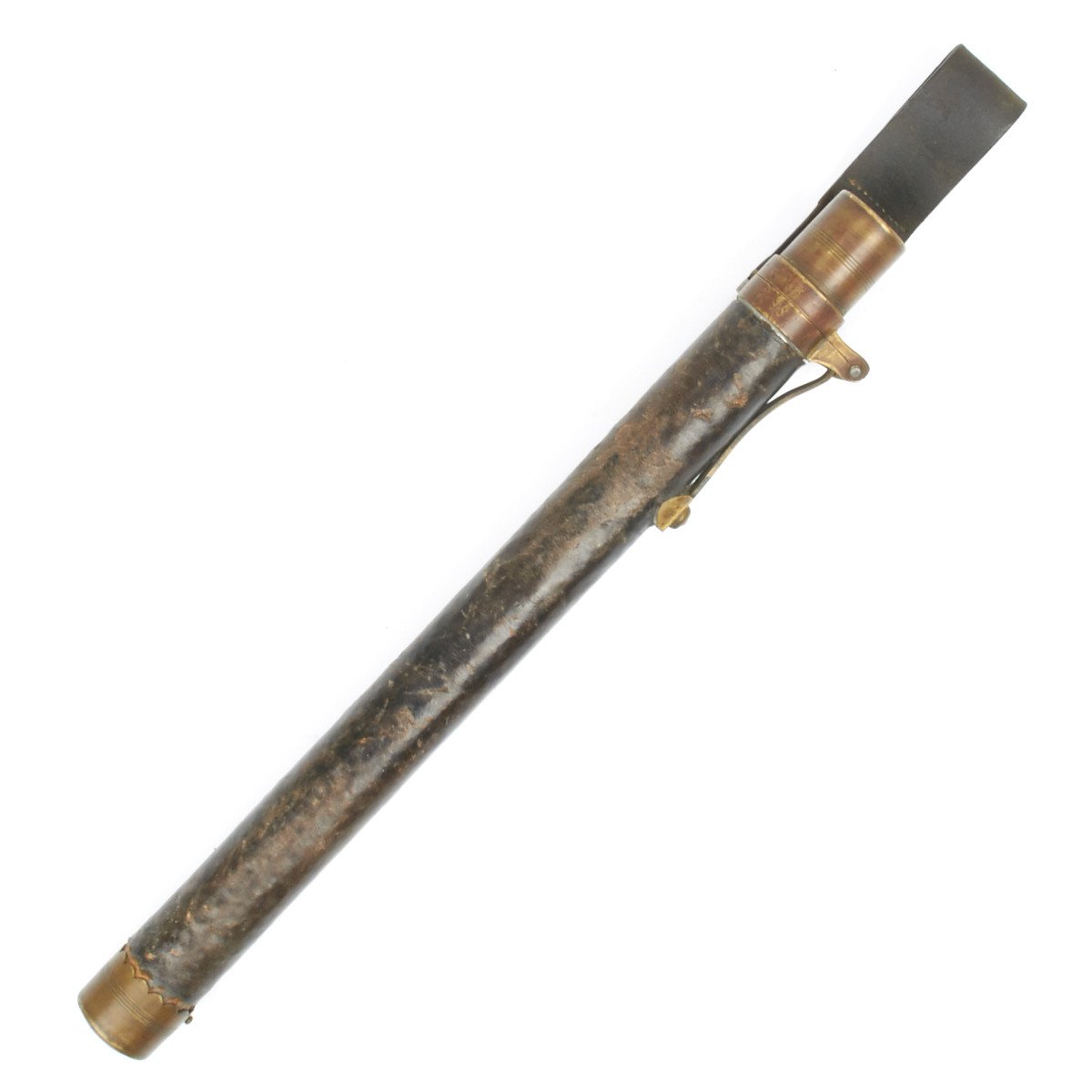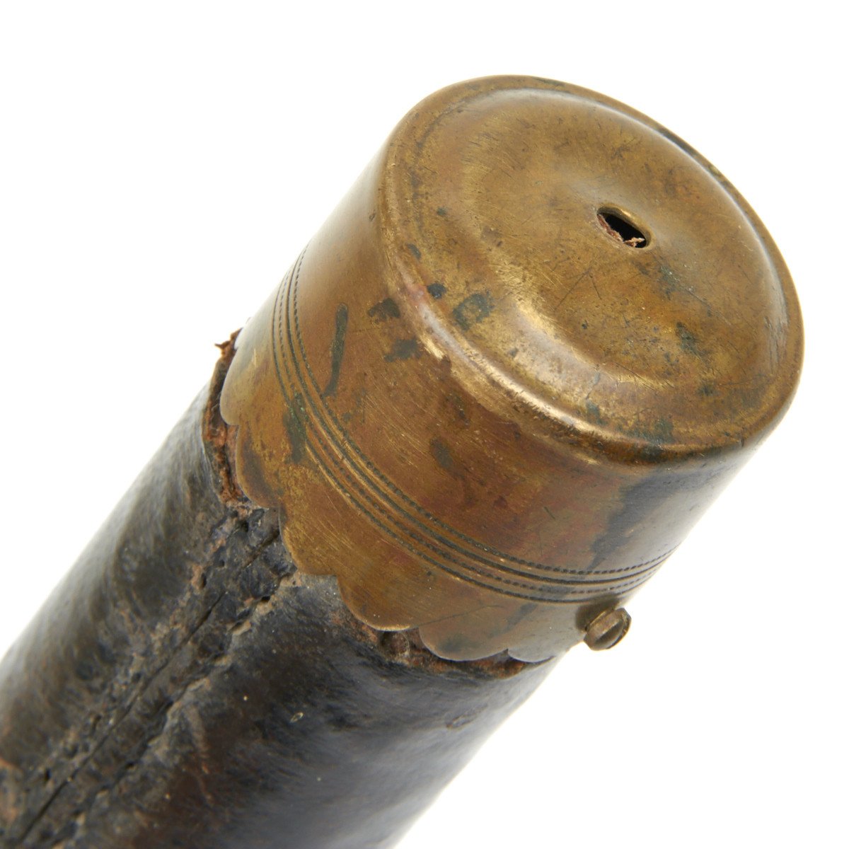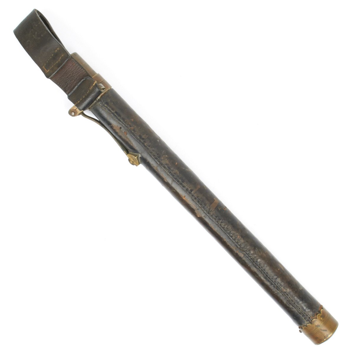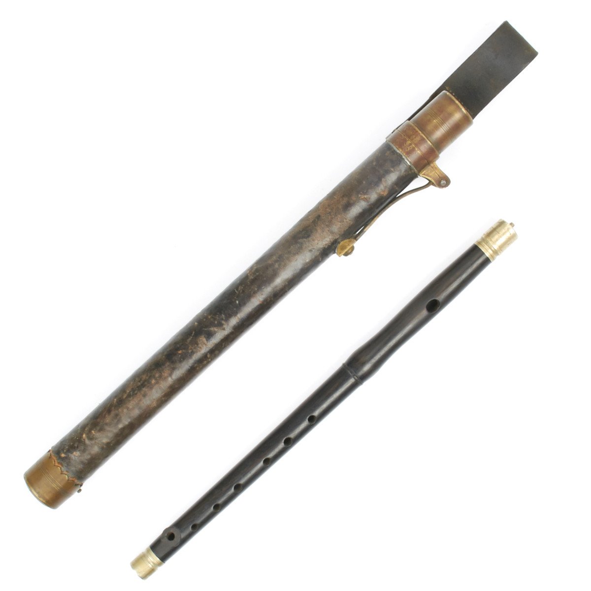 107R H.K. 1.3 2.K. The Fife is contained in the most marvelous leather-lined, leather-covered carrying "tube" with brass end cap. The top (throat) is of substantially constructed brass with large spring cap for sealing the Fife inside. The brass top mount has a bracket to which is permanently attached a substantial leather belt frog which is also stamped with regimental numbers that read: