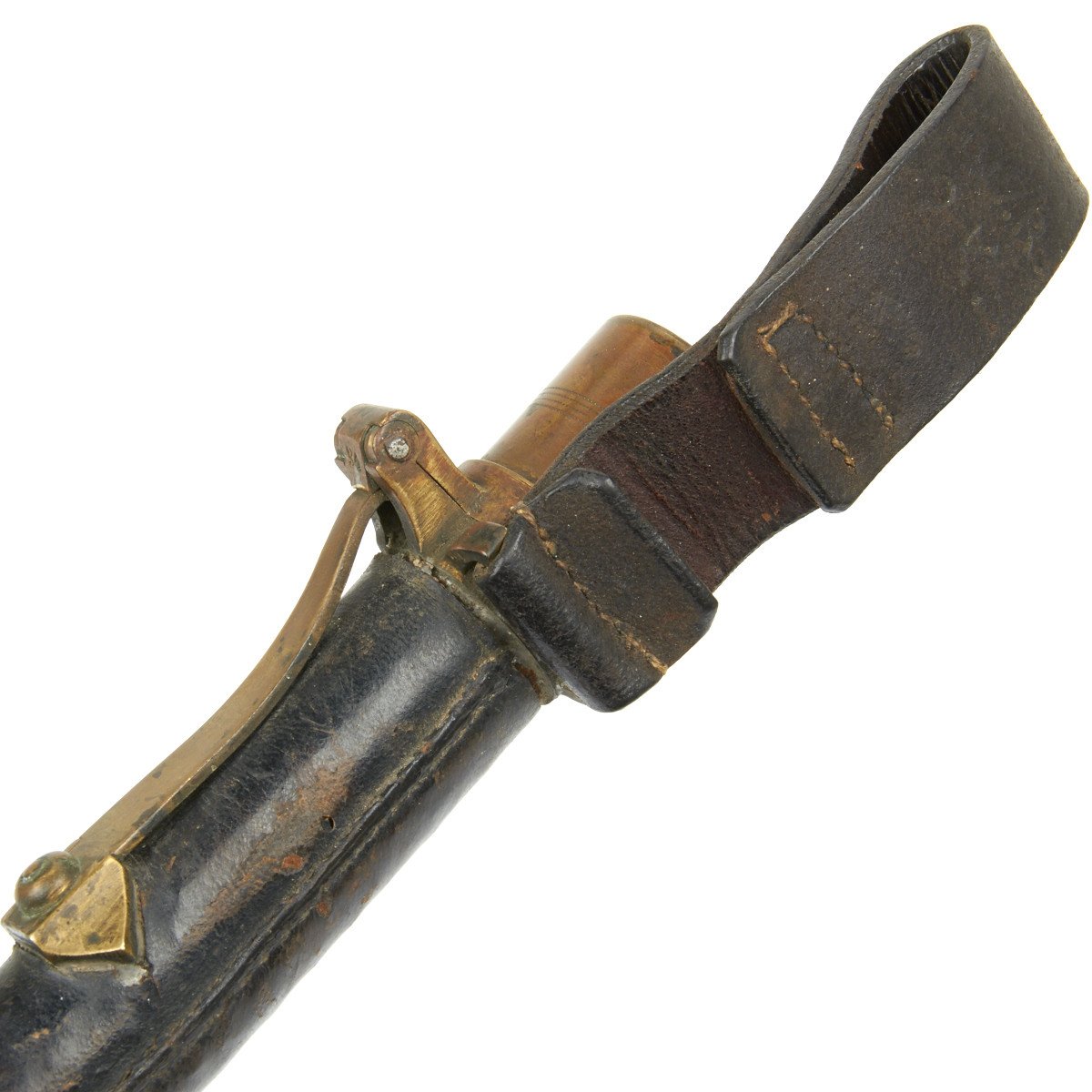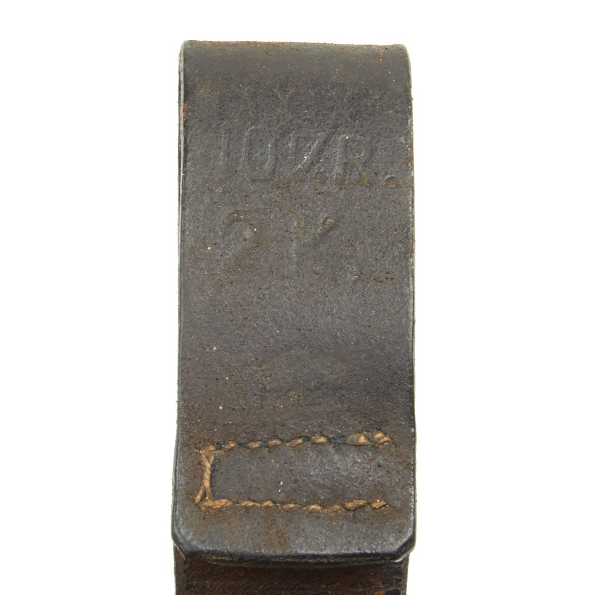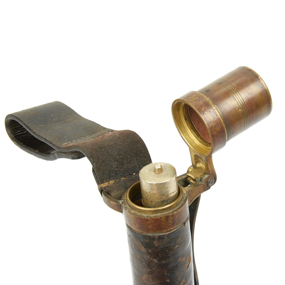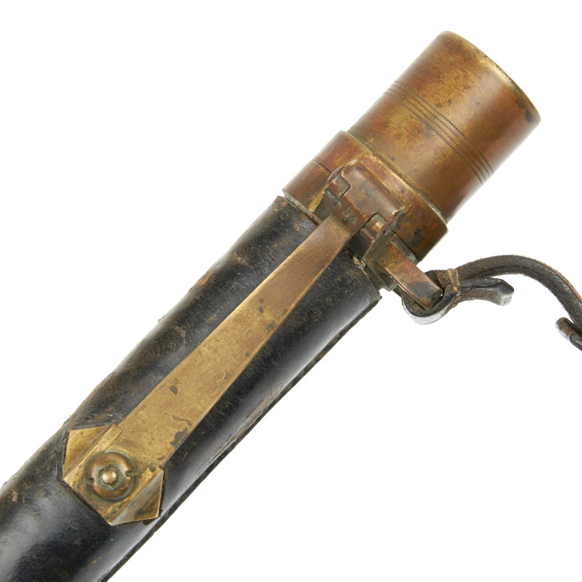 107R H.K. 1.3 2.K. The Fife is contained in the most marvelous leather-lined, leather-covered carrying "tube" with brass end cap. The top (throat) is of substantially constructed brass with large spring cap for sealing the Fife inside. The brass top mount has a bracket to which is permanently attached a substantial leather belt frog which is also stamped with regimental numbers that read: