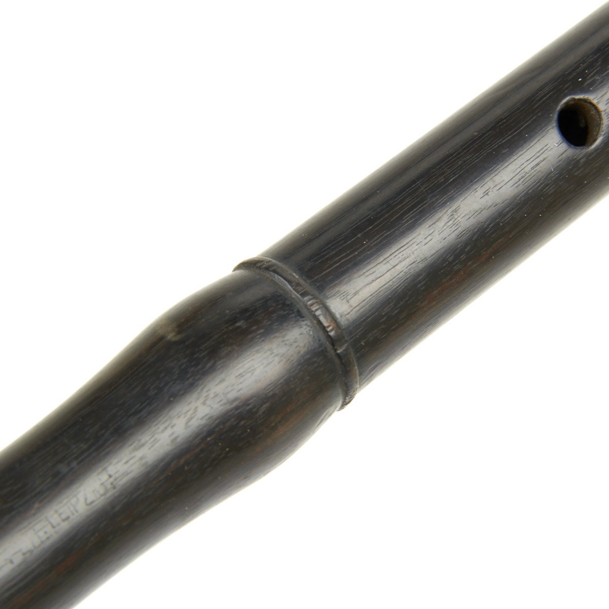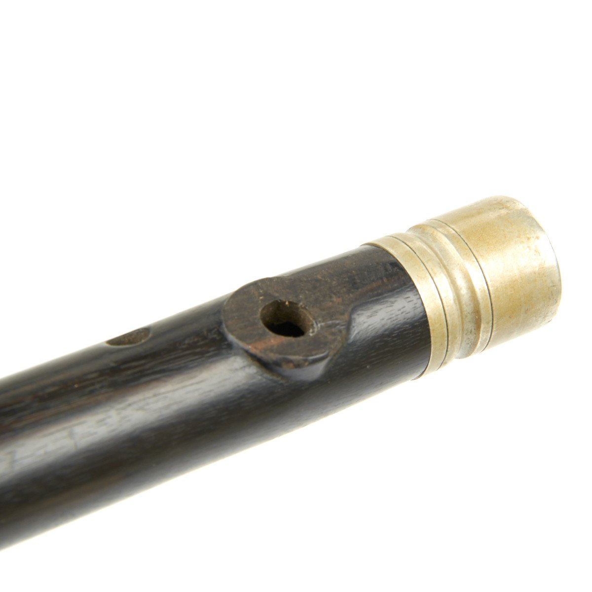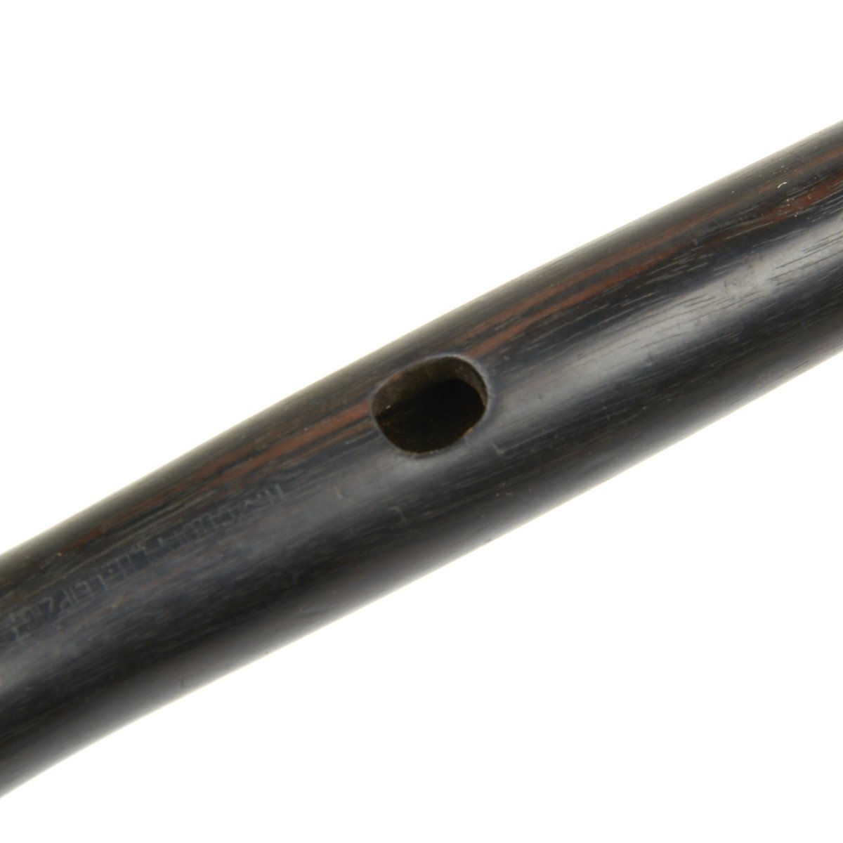 The Fife is 15" in overall length, made in a fine quality wood with silvered brass caps on each end. It seems functional but we don't know how exactly how to play. Impressed down the side of the instrument are regimental numbers of the German military unit to which it was issued that read: