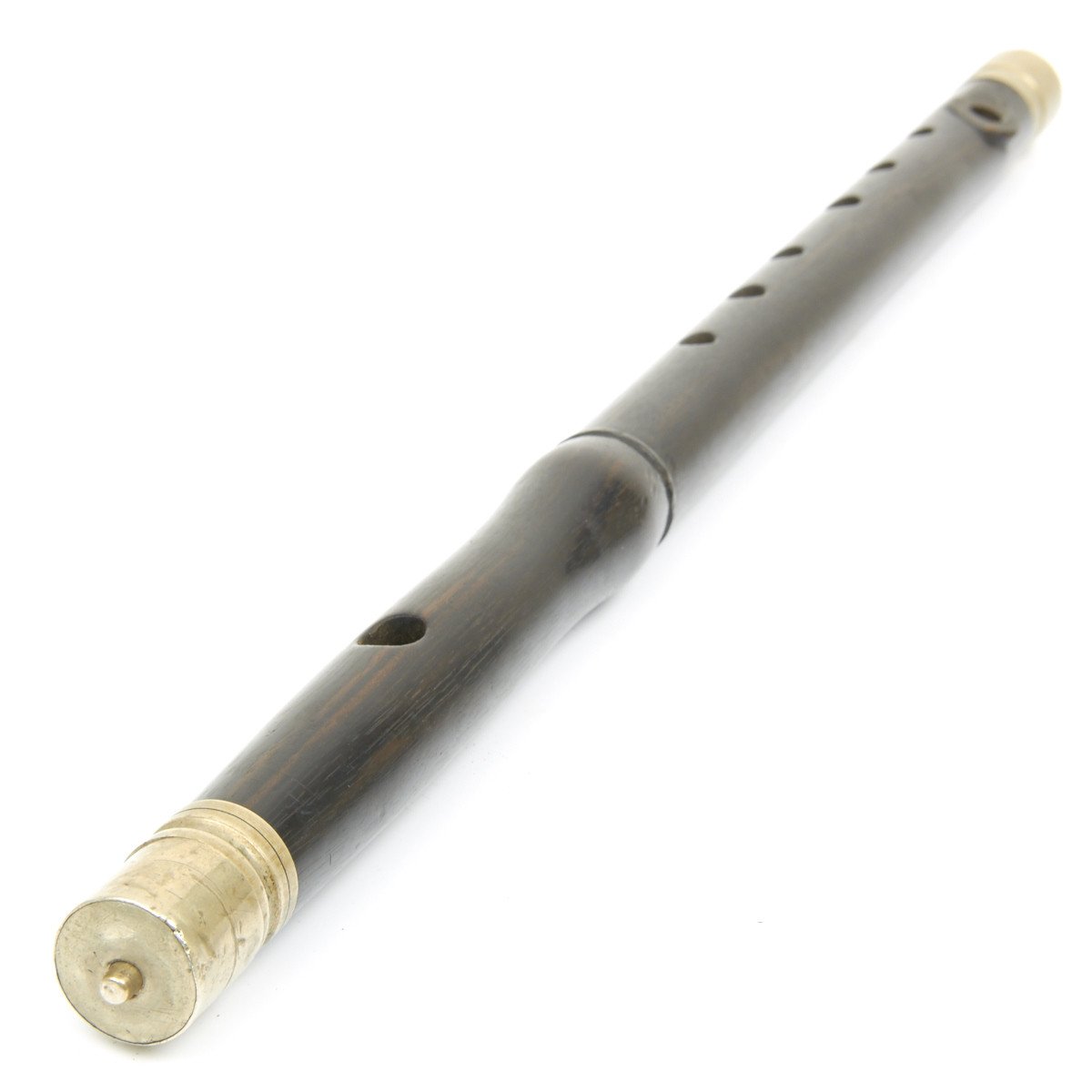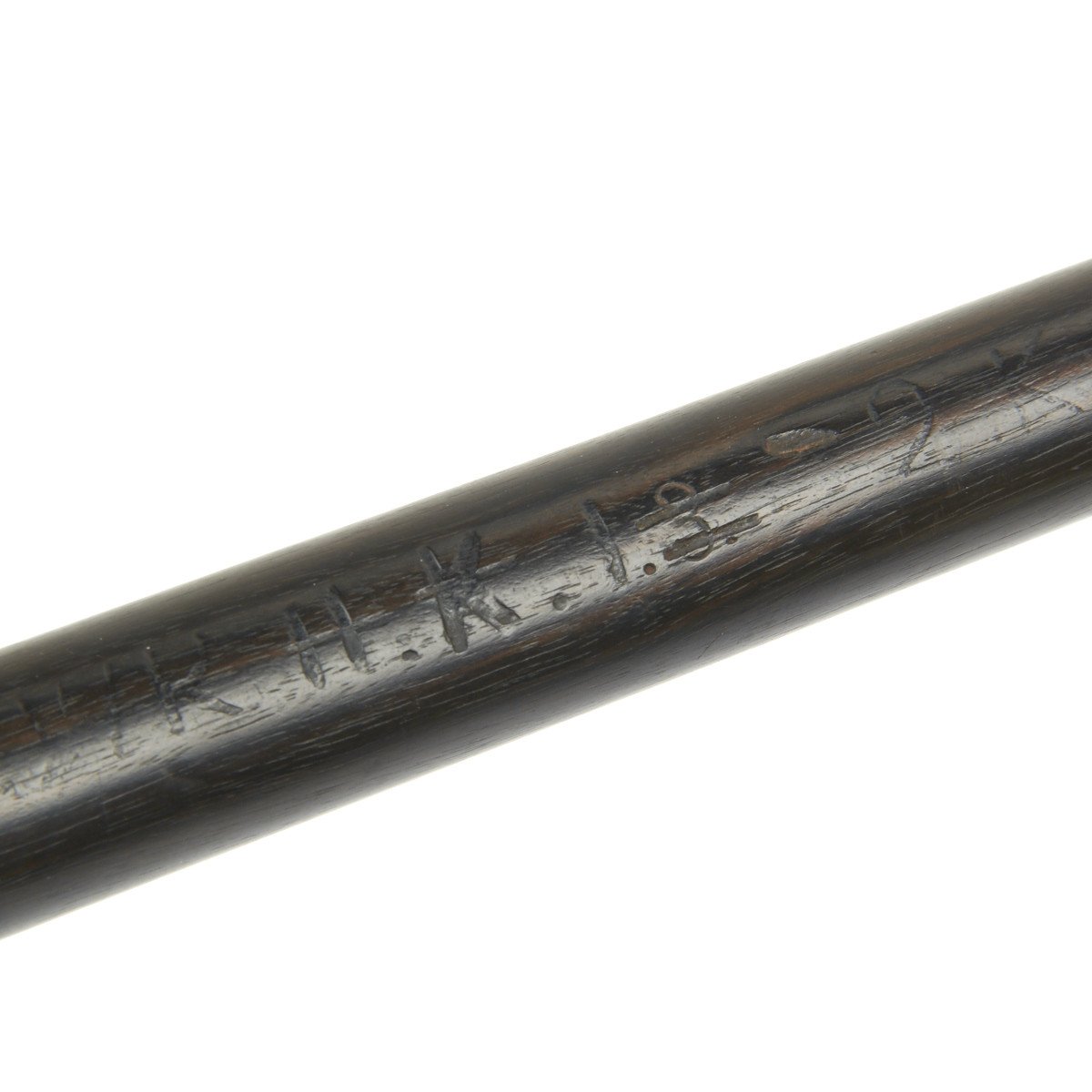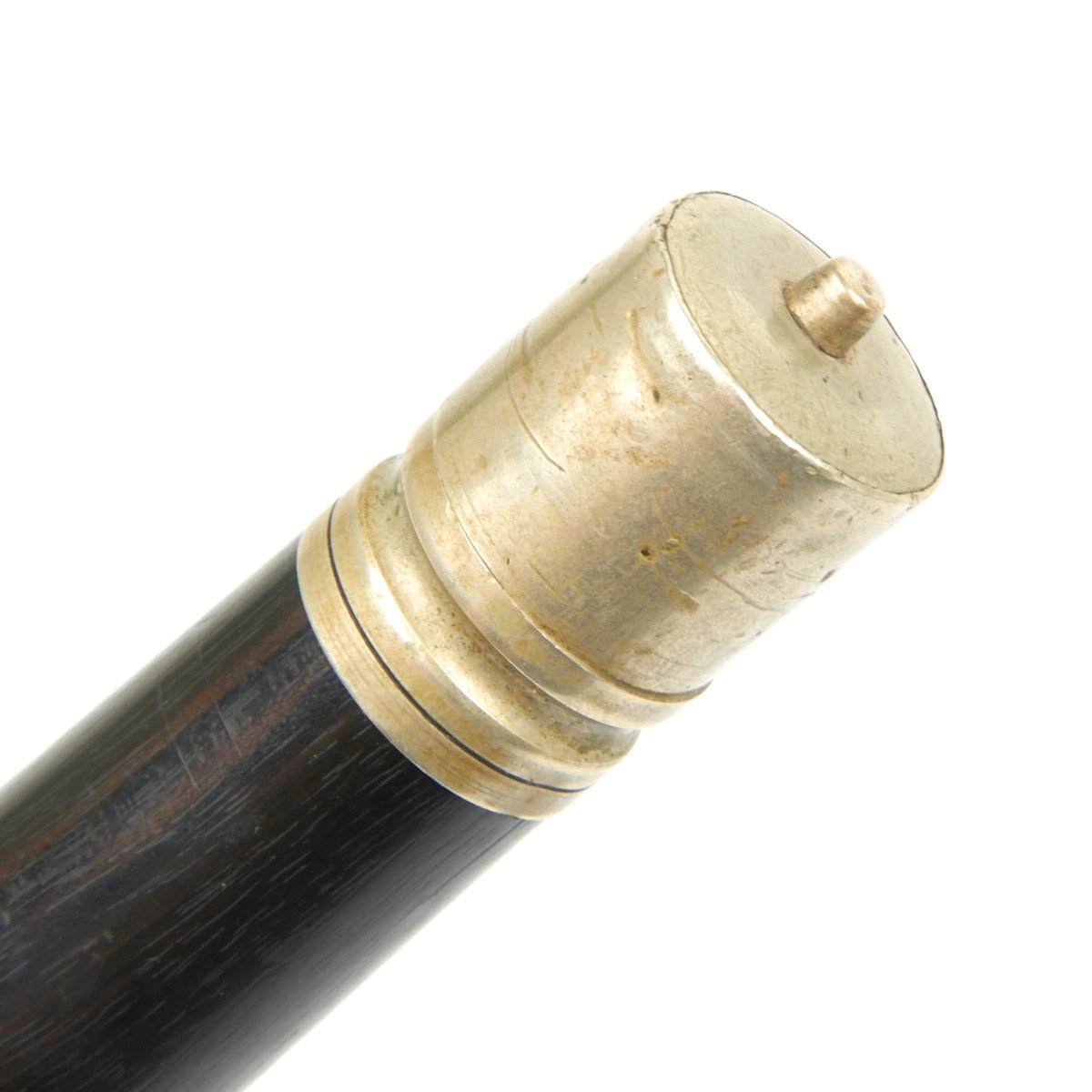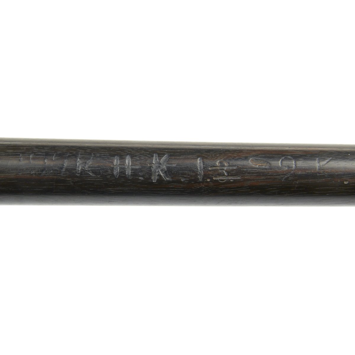 The Fife is 15" in overall length, made in a fine quality wood with silvered brass caps on each end. It seems functional but we don't know how exactly how to play. Impressed down the side of the instrument are regimental numbers of the German military unit to which it was issued that read: