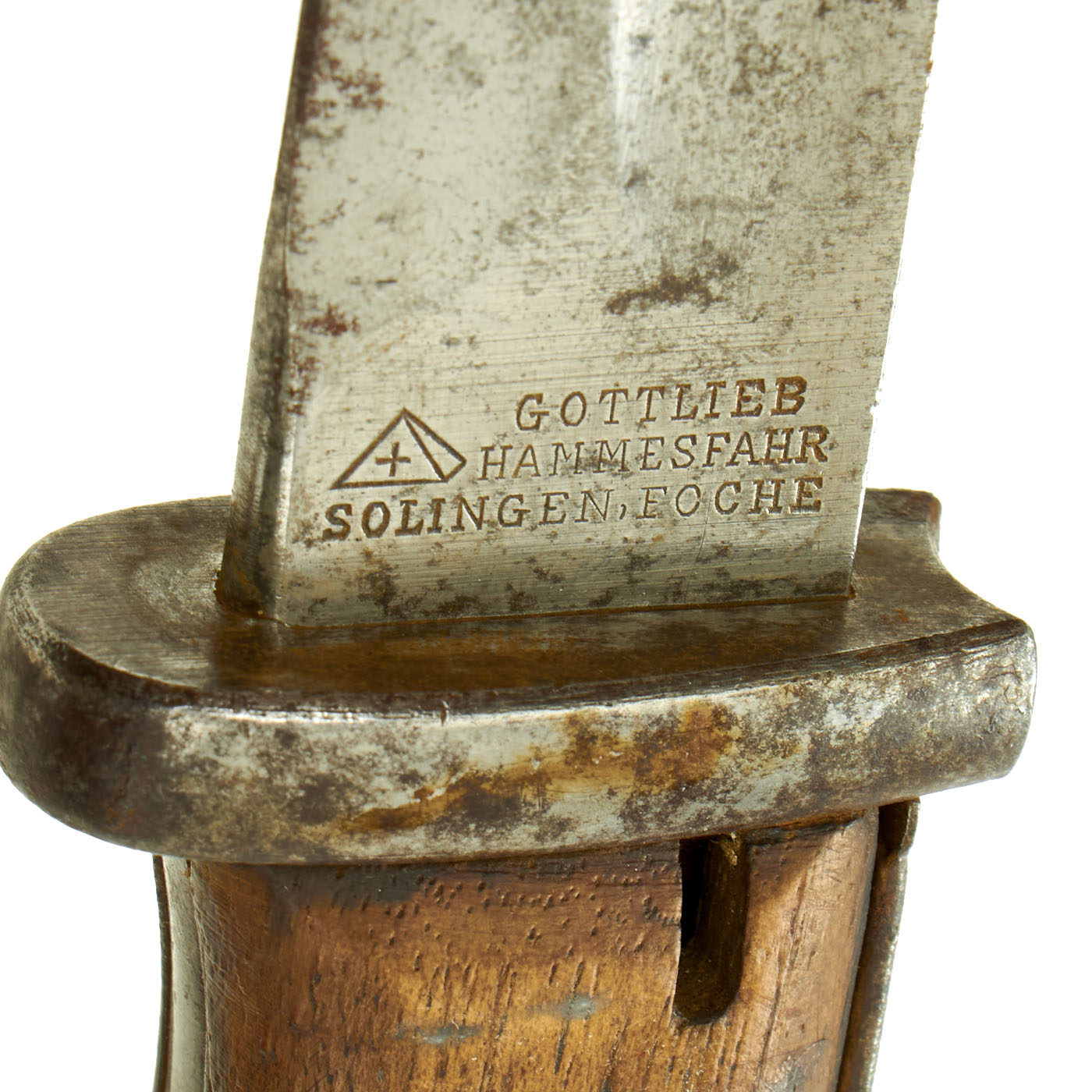 This example has a very nice set of original wood grips, with a very nice hilt with a little rust and a great patina. Bayonet lock is fully functional. The blade ricasso is clearly maker marked: