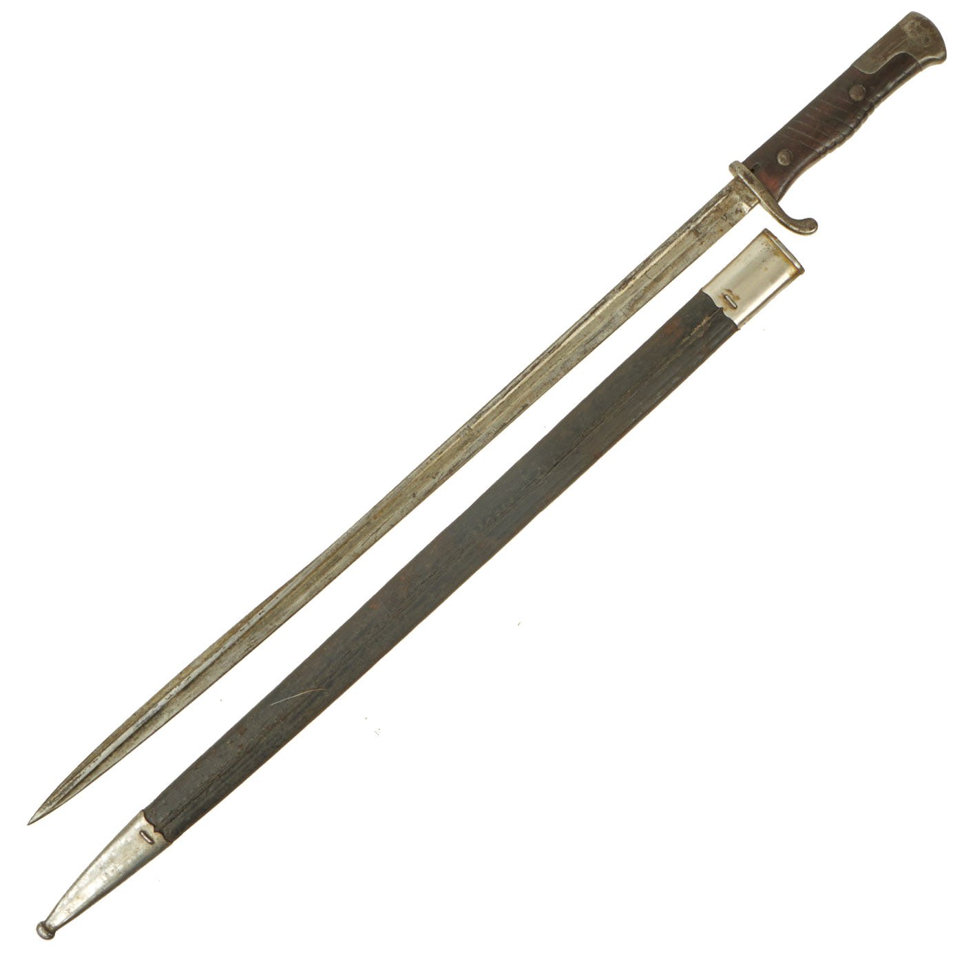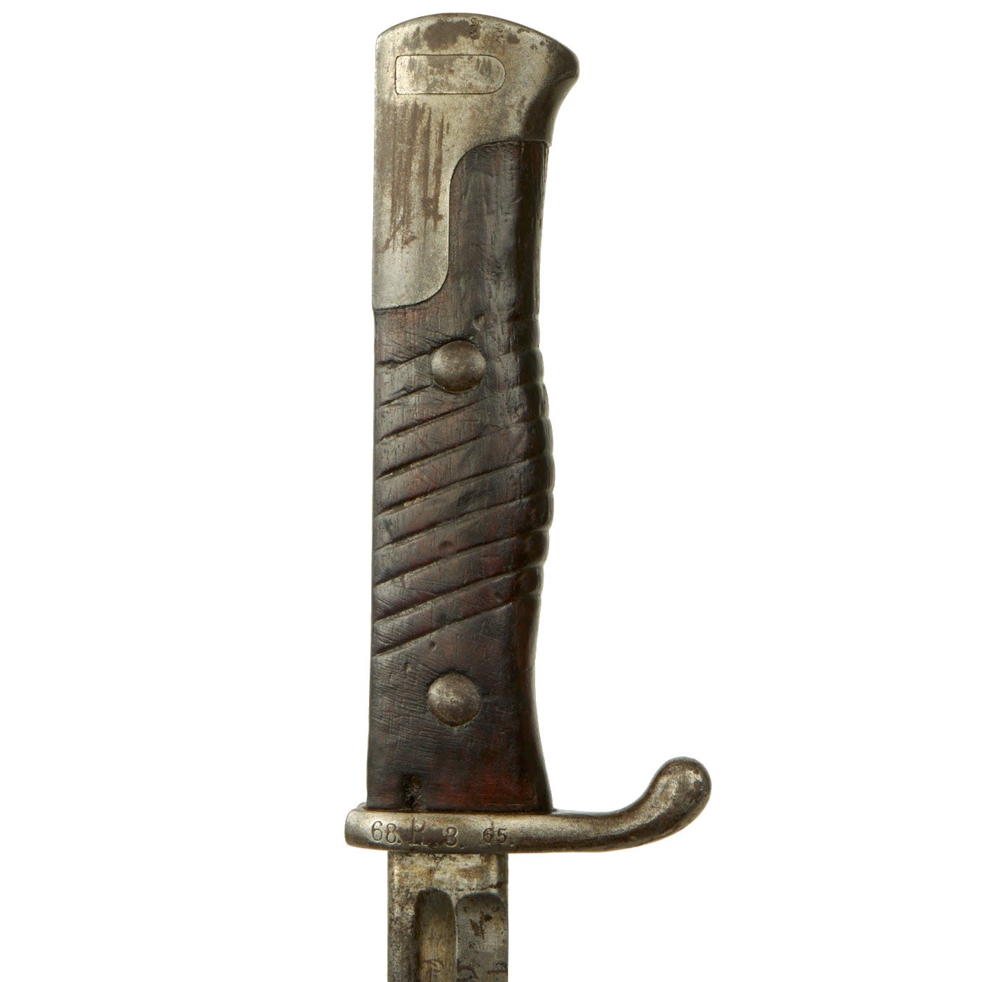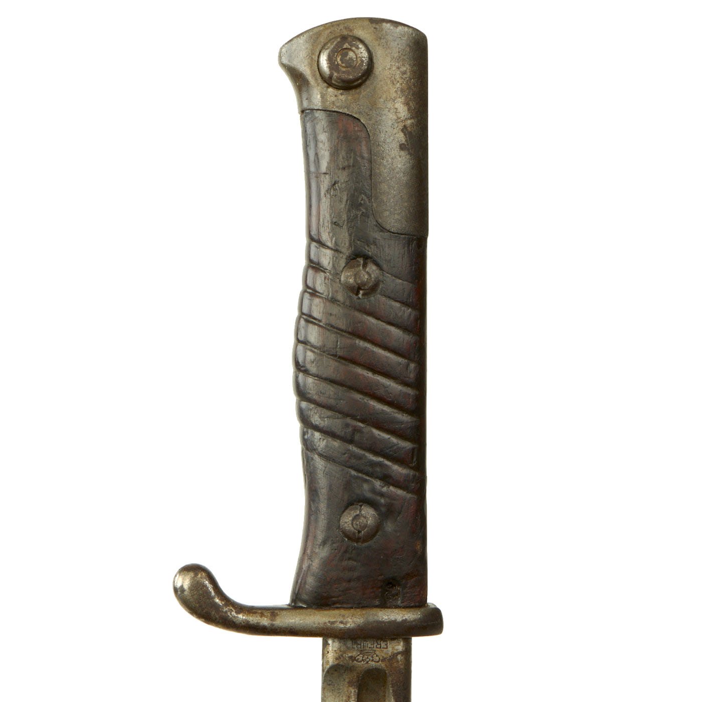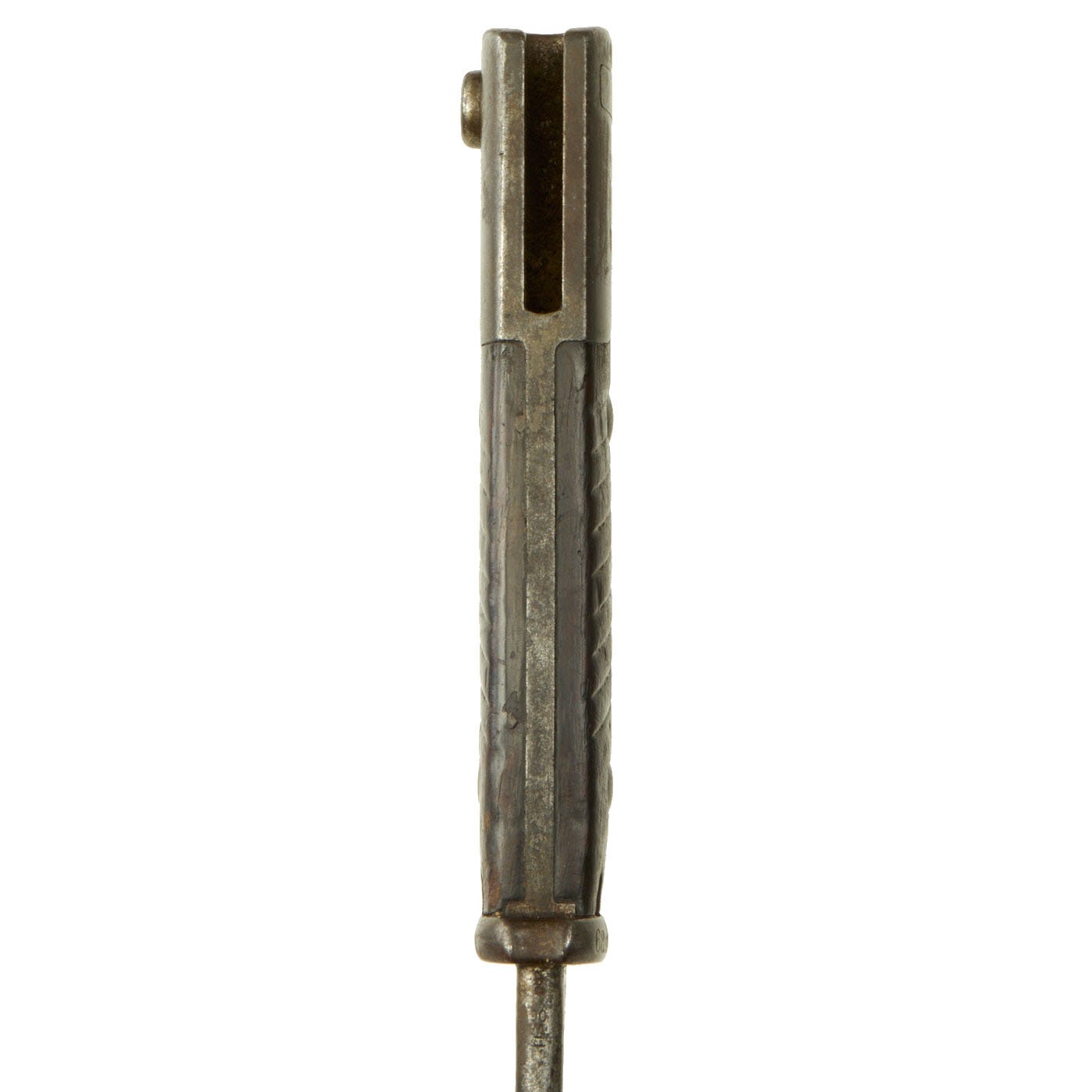This bayonet is a rare example of the first model of this bayonet, the a.A. (alter Art) model produced until 1902, and the grip is made of a single piece of wood, wrapped around the tang. After the turn of the century the Germans simplified and strengthened their bayonet grips. The original "neu Art" (new type) bayonet had the more standard two grip scales on either side of the tang. For more information please see Watts & White, The Bayonet Book, page 119, Item 256.