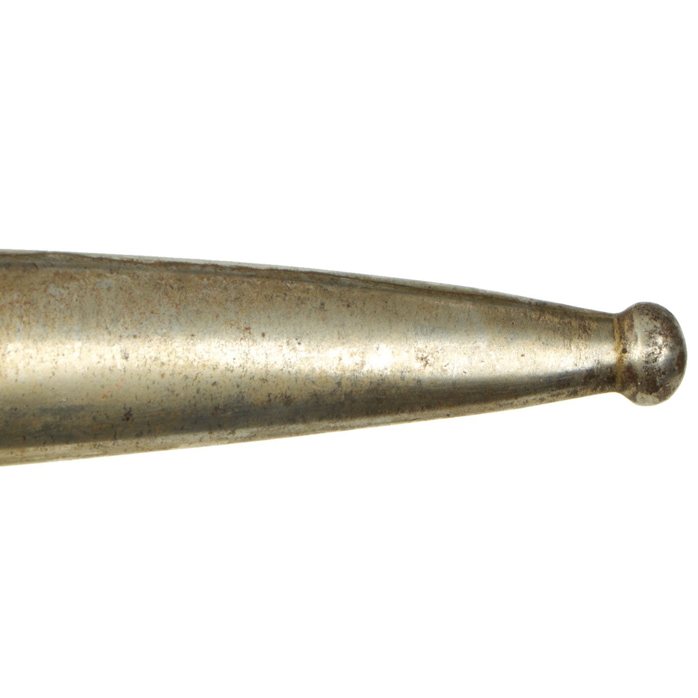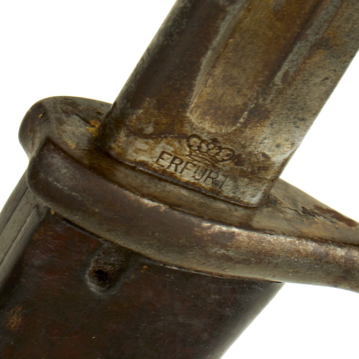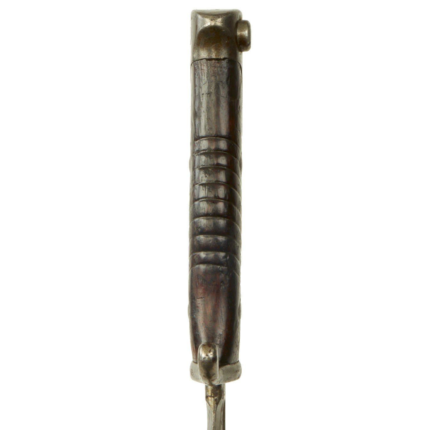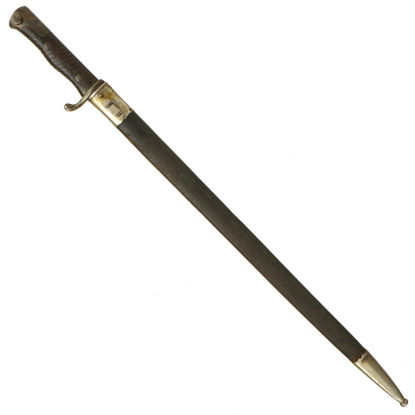 This bayonet is a rare example of the first model of this bayonet, the a.A. (alter Art) model produced until 1902, and the grip is made of a single piece of wood, wrapped around the tang. After the turn of the century the Germans simplified and strengthened their bayonet grips. The original "neu Art" (new type) bayonet had the more standard two grip scales on either side of the tang. For more information please see Watts & White, The Bayonet Book, page 119, Item 256.