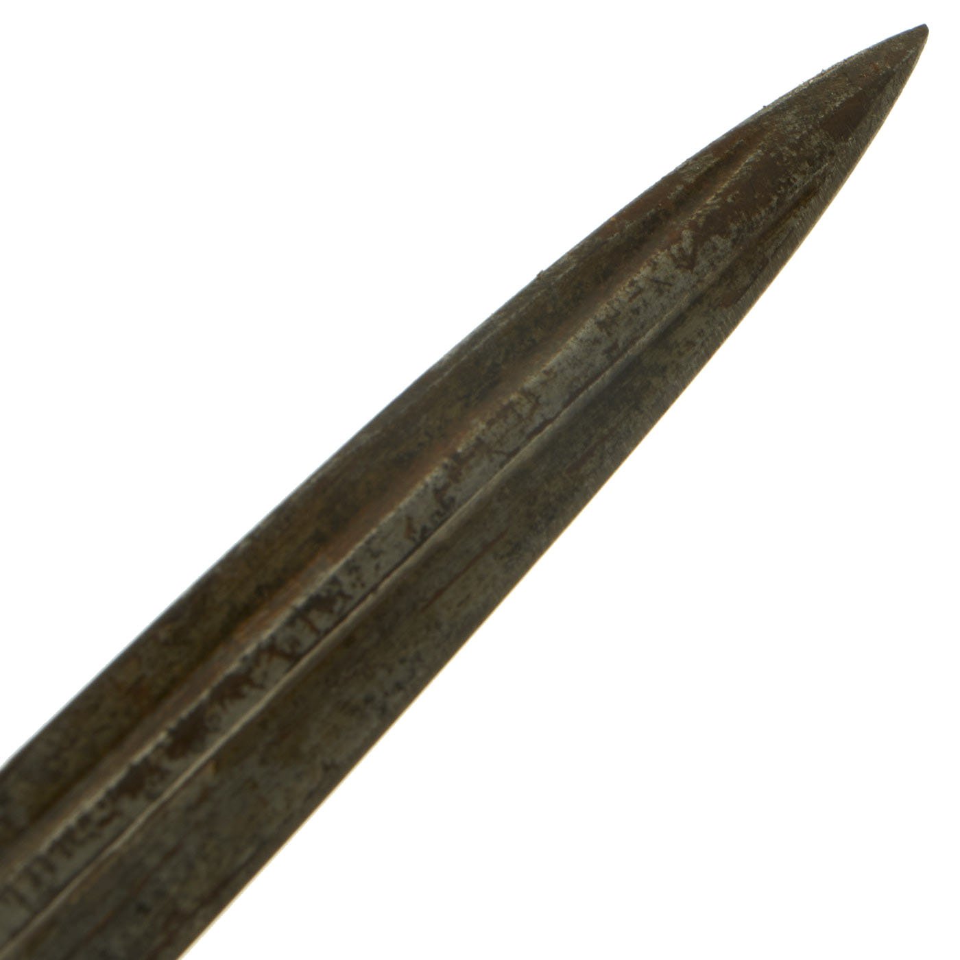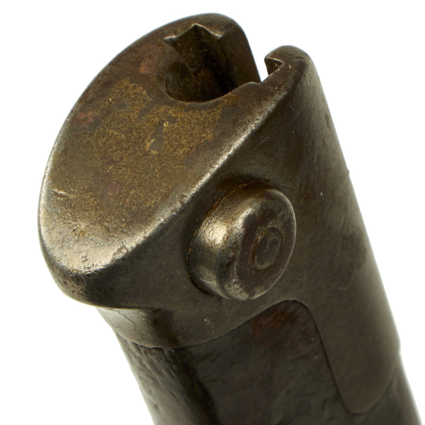 The bayonet shows overall light corrosion and staining on the blade, as well as signs of sharpening, however it is overall quite nice after years of service. The one piece grip is still in very good condition, with no cracks or chips, and the carved ribs still clear. The hilt does have wear and some light corrosion, so this is definitely a bayonet that saw a lot of service. The bayonet comes complete with its original steel fitted leather scabbard, which looks to have nickel plated fittings.