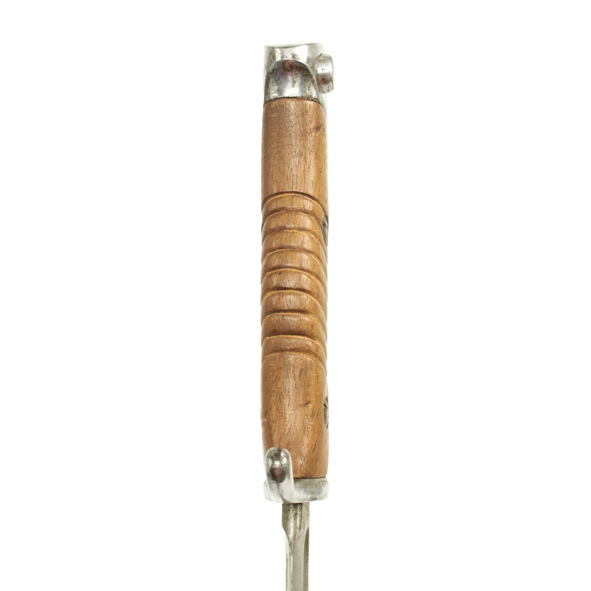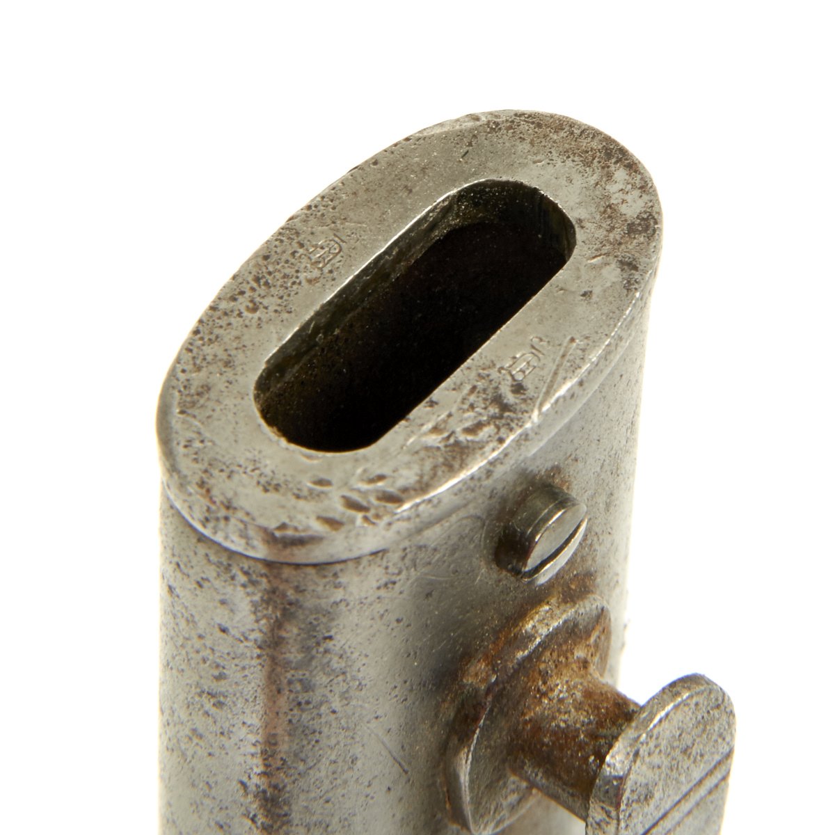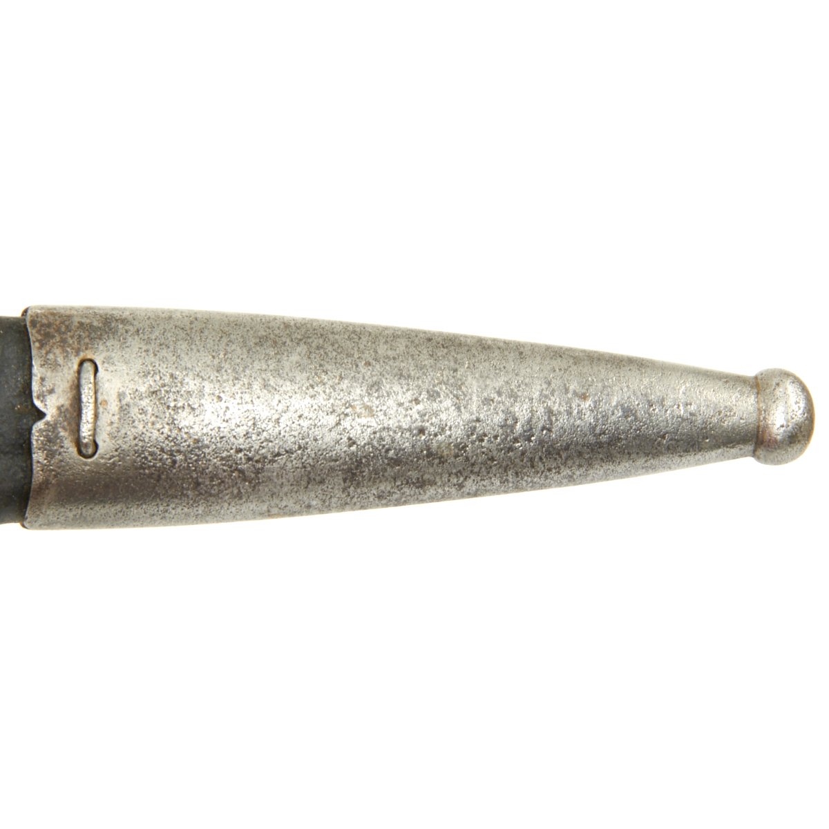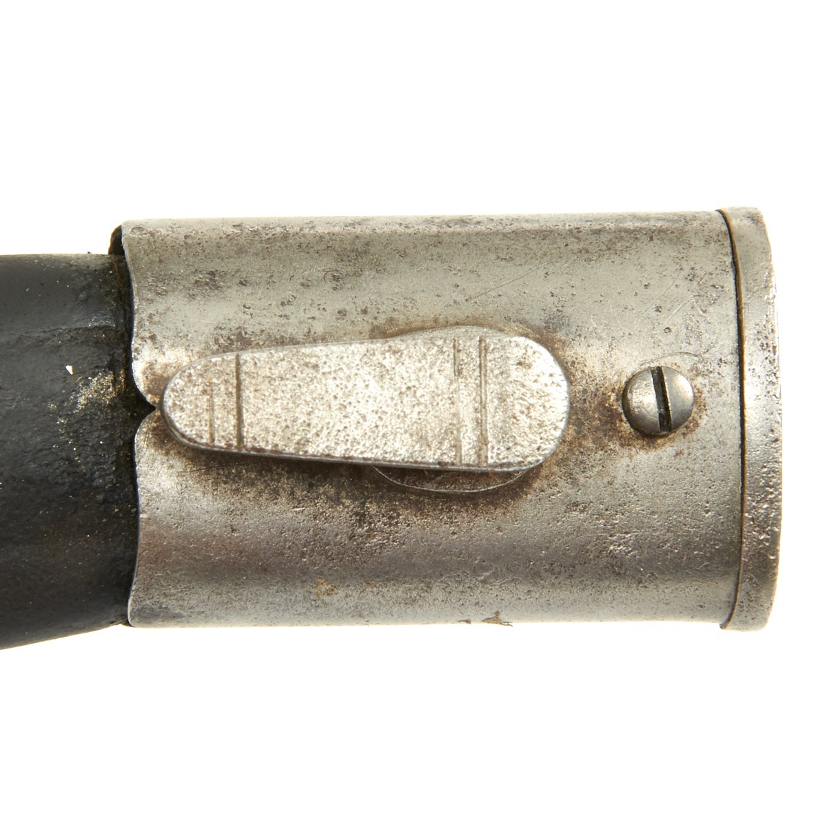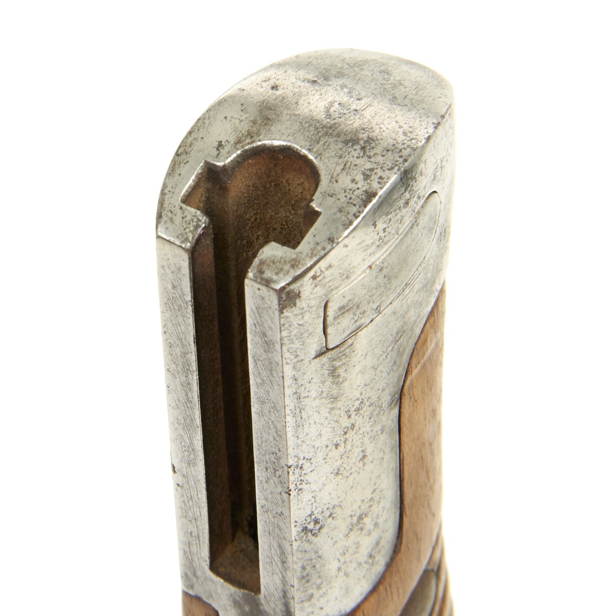The bayonet shows some corrosion on the blade, as well as signs of sharpening, however it is overall quite nice after years of service. The one piece grip is in very good condition, with no cracks or chips, and the carved ribs still very clear. The bayonet comes complete with its original Steel Mounted leather scabbard, many of which were lost and replaced with "ersatz" emergency issue scabbards. Due to age the leather has shrunk a bit. and does have some wrinkles, but it is overall solid.