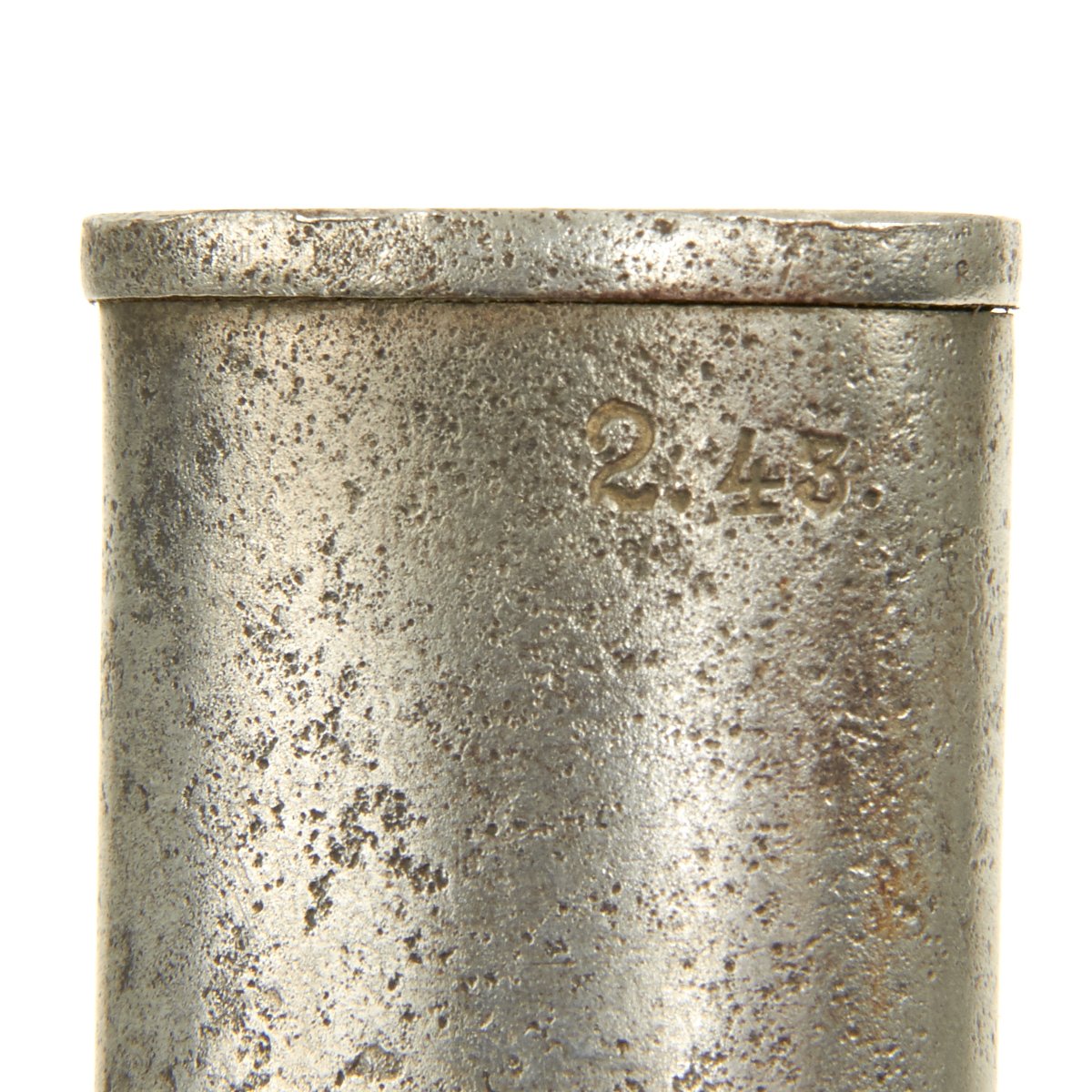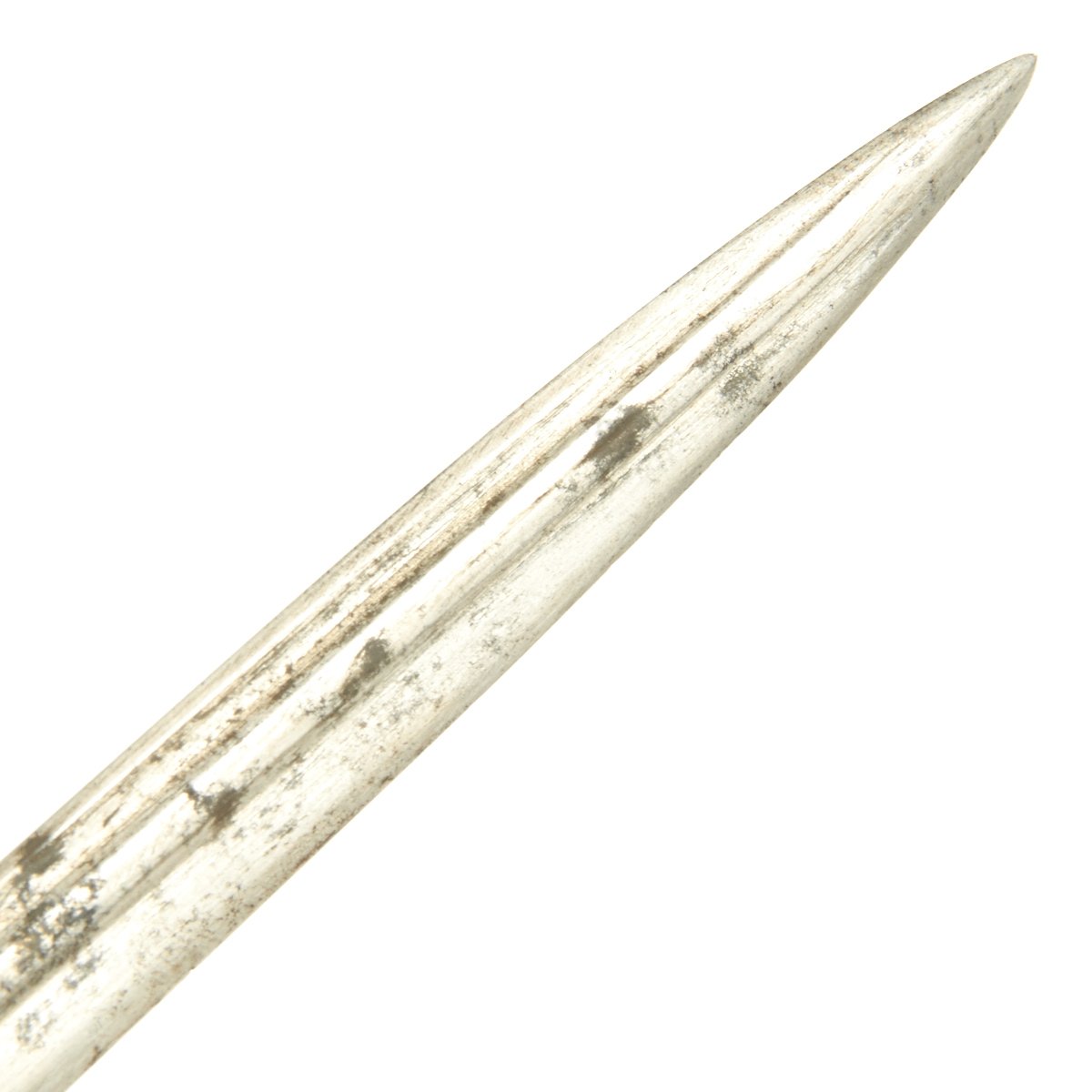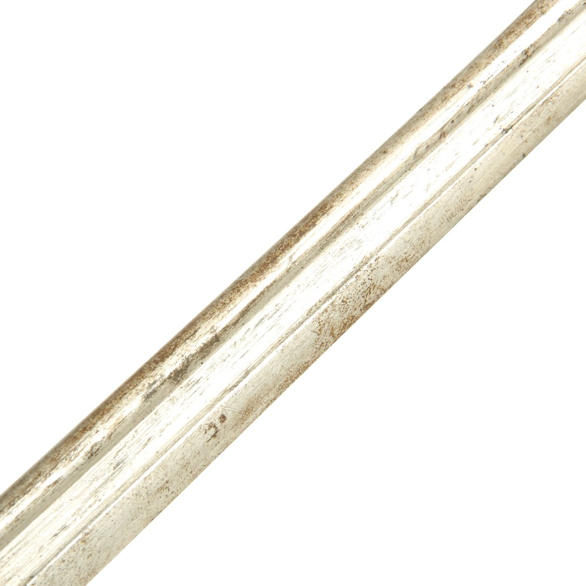 This fine example has the typical long "pipe backed" 20 1/2" blade, also called a "quill back". The spine is proof marked Crown / W directly in front of the cross guard, for Kaiser Wilhelm II, the German Emperor. Under this is 01, indicating production in 1901. There is also the remnant of a regimental mark on the scabbard: 2.43