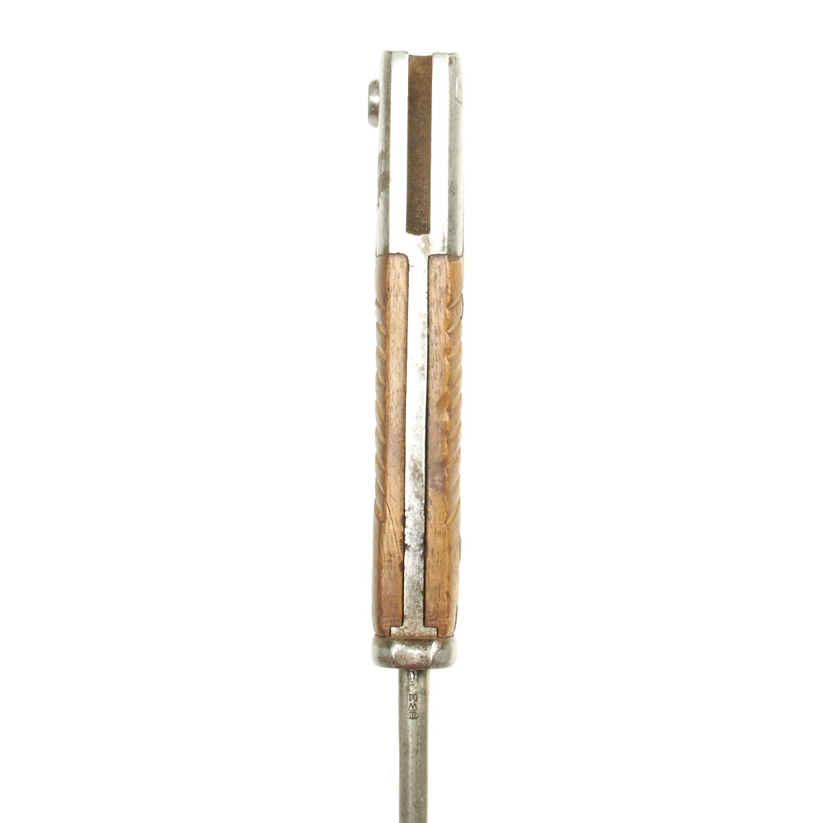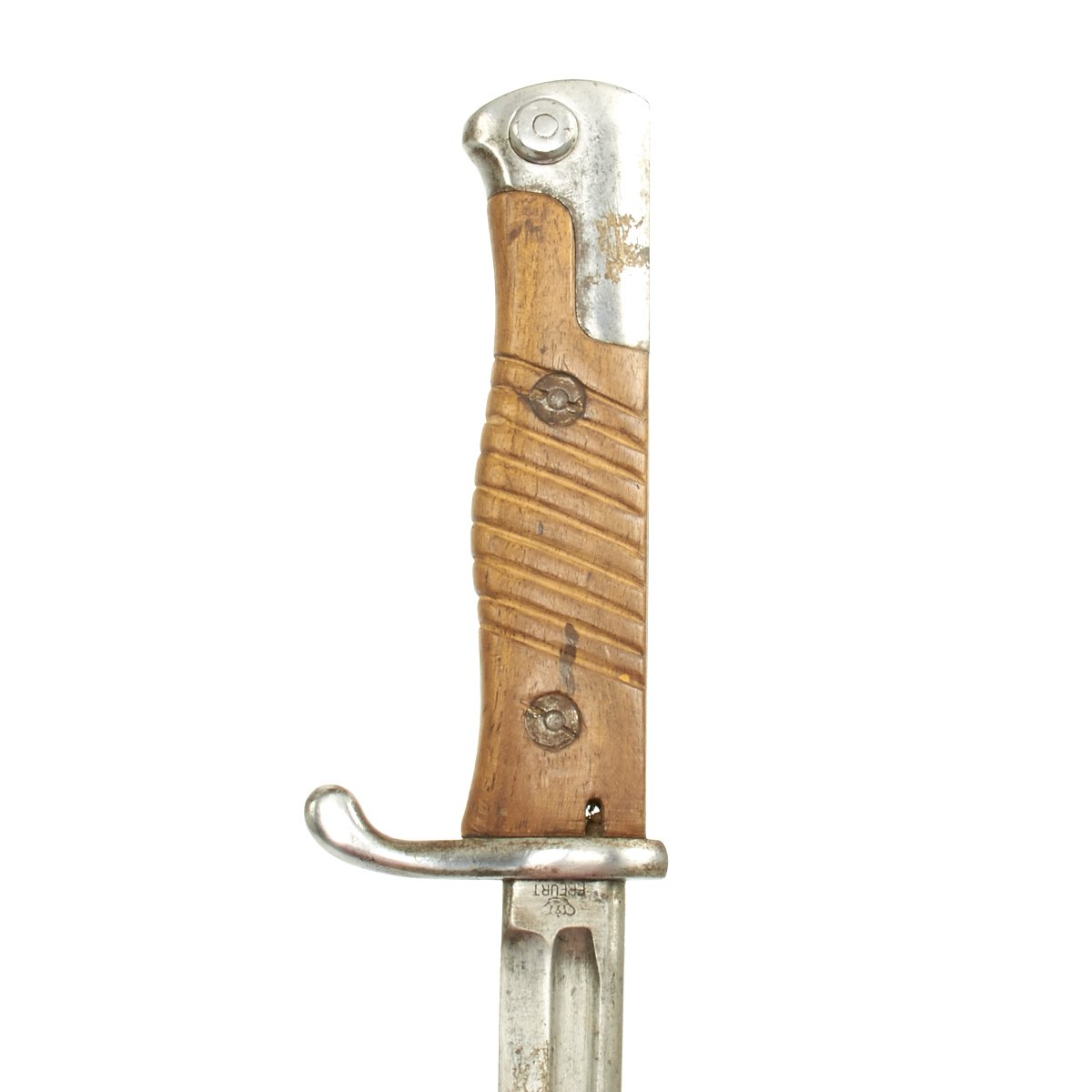The blade ricasso is maker marked Crown / ERFURT, indicating manufacture at the Royal Erfurt Arsenal, located in Thuringia. This bayonet is an example of the first model of this bayonet, which had a grip made of one single piece of wood, which was wrapped around the tang. This is called a.A. which means in German "alter Art" (old type). After the turn of the century the Germans simplified and strengthened their bayonet grips. The new type is called n.A. (neu Art) and the grip was made of two halves from wood. The two-piece grips were introduced in 1902. These improvements were common for all the Military models of bayonets.