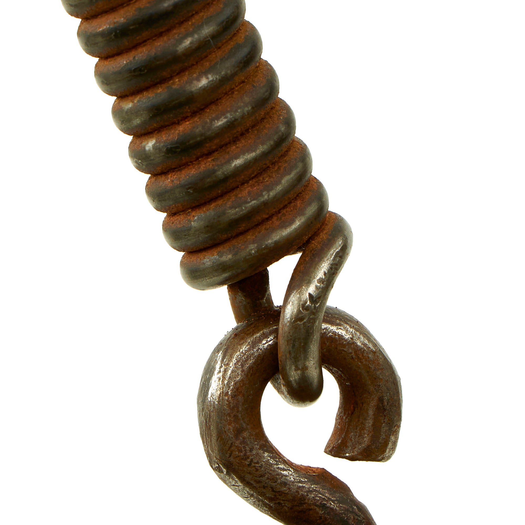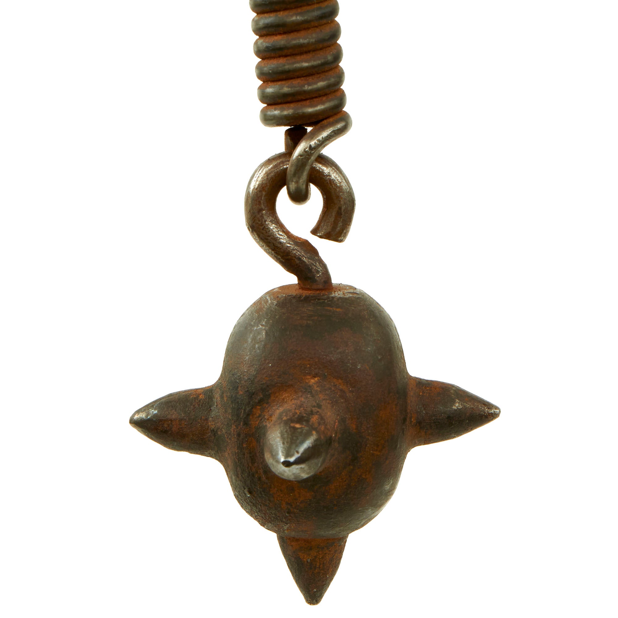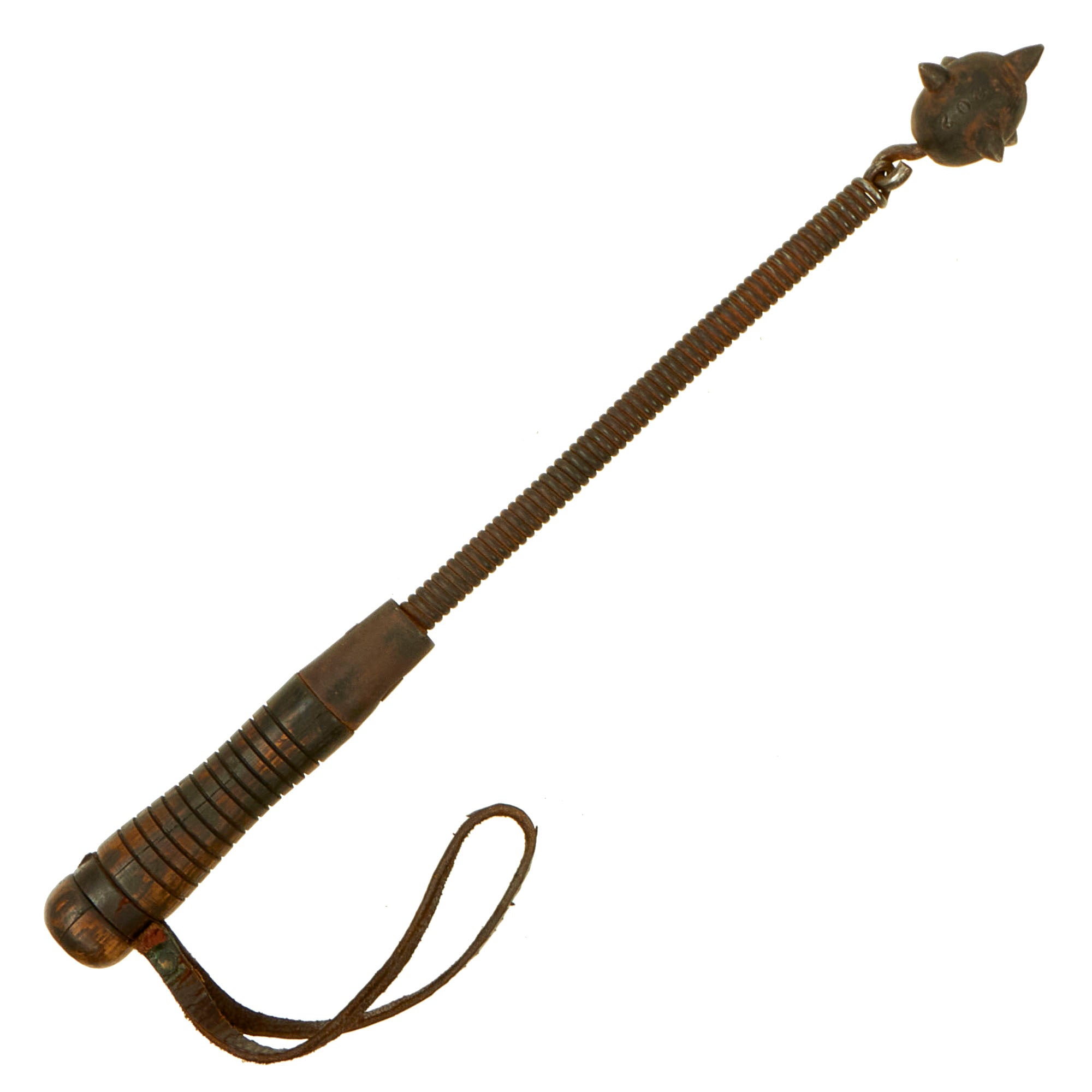This example of a World War One German trench club has five sharp spikes equally cast about the surface on the egg-shaped iron head. The initials "FKG" and the number "202" were stamped into the head's surface. Friedrich Kottenhoff Gevelsberg was a known manufacturer of weapons, which included edged weapons (i.c.Faschinenmesser), during World War One. The "202" maybe a lot or run number. There is a 6.0 mm thick eyelet attached through the base of the iron head designed to articulate with its 13.5 mm diameter spring handle. The handle's flexible steel spring is embedded approximately 110 mm into the wasp-waist wood grip. Its grip has 12 regularly spaced, 1.5-millimeter deep grooves turned about its circumference. Located near the bottom of the pommel is a 12-millimeter wide groove for its leather Lanyard with its single rivet. A 41 mm long cone-shaped steel ferrule (with a 22 mm upper diameter and a 28 mm lower diameter) was attached to the top of the grip by a twelve-millimeter diameter rivet. This ferrule was designed to minimize the chances of splitting the wood when the dub was used as a weapon. The head of the pommel is flat. Note: Other examples for this model of club exist, which bear the manufacturer's mark on the pommel and or the leather lanyard. There is no record of a Kriegsministerieller Erlass (War Ministry Order) for the manufacture and distribution of this type of club. Further research is required.