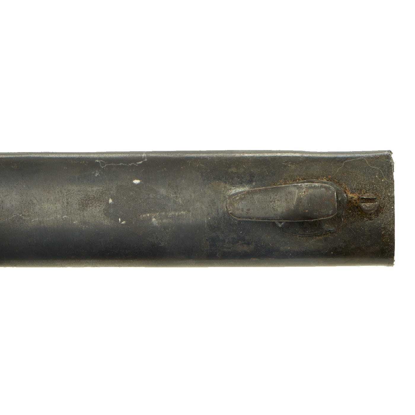 Anthony Carter's Reference EB3 appearing on Pages 18-19 is the model we offer here. It features a heavy smooth bent steel hilt with split muzzle ring and a single piece crossguard marked 2881. It has a 12 1/4 inch fullered blade, which bears a faint imperial proof on the spine. Overall length is 17 1/8 inches and it comes complete with a correct all steel blued scabbard, which is unmarked. Both are in very good condition, with a lot of the original green paint still present on the hilt, and almost all of the blued finish on the scabbard intact.