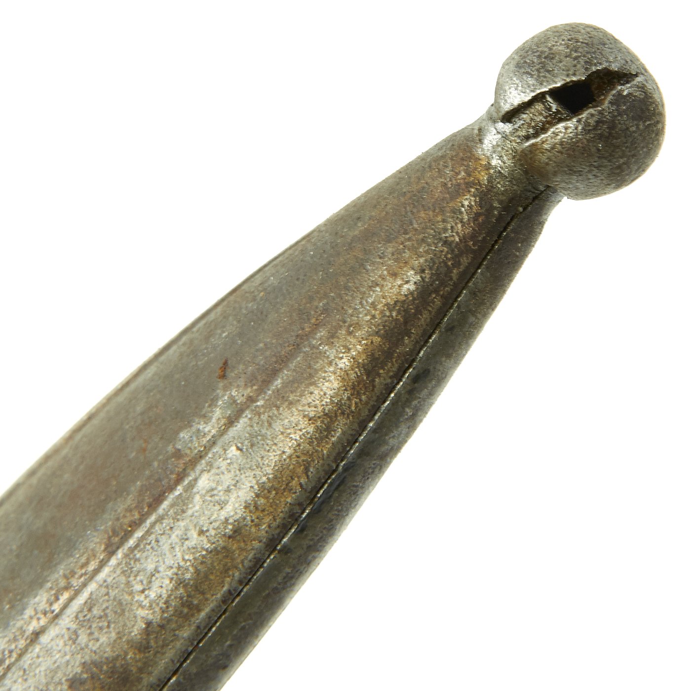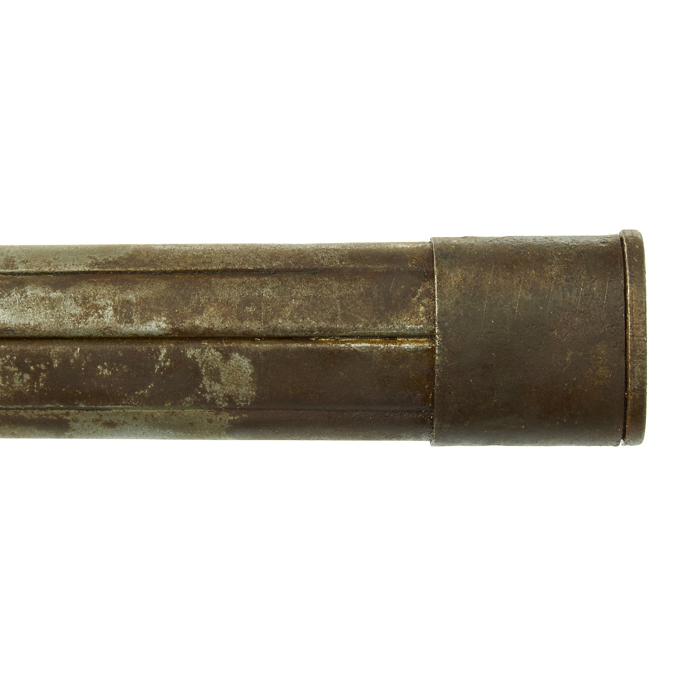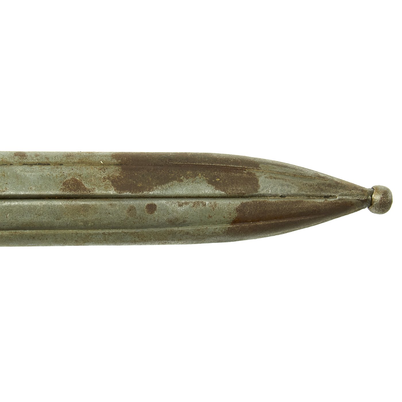 Anthony Carter's Reference EB42A appearing on Pages 104-105 is the model we offer here. Heavy Stamped steel two-piece ribbed hilt with split muzzle ring, with a 14 inch "butcher" style sawback fullered blade, which bears imperial proofs on the spine. Comes complete with a correct all steel ribbed "butcher" scabbard, though the frog button is missing.