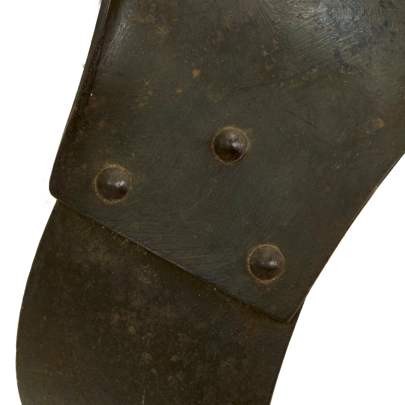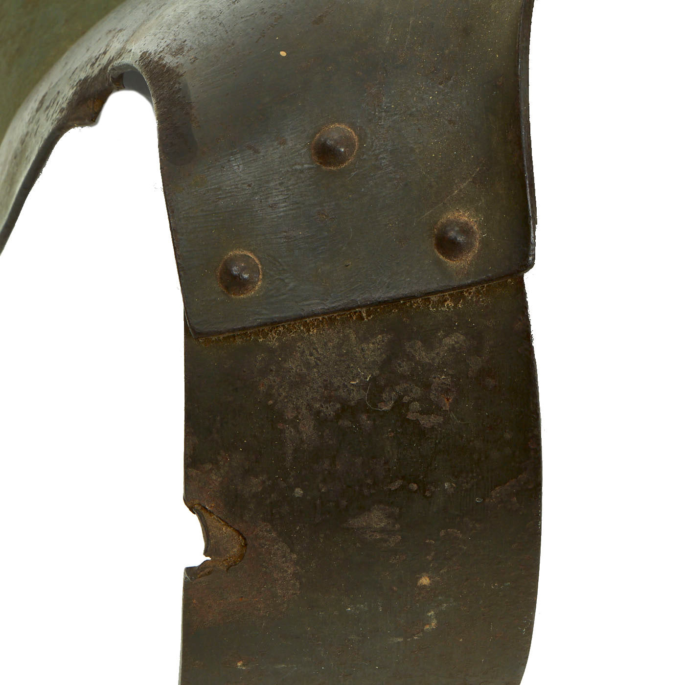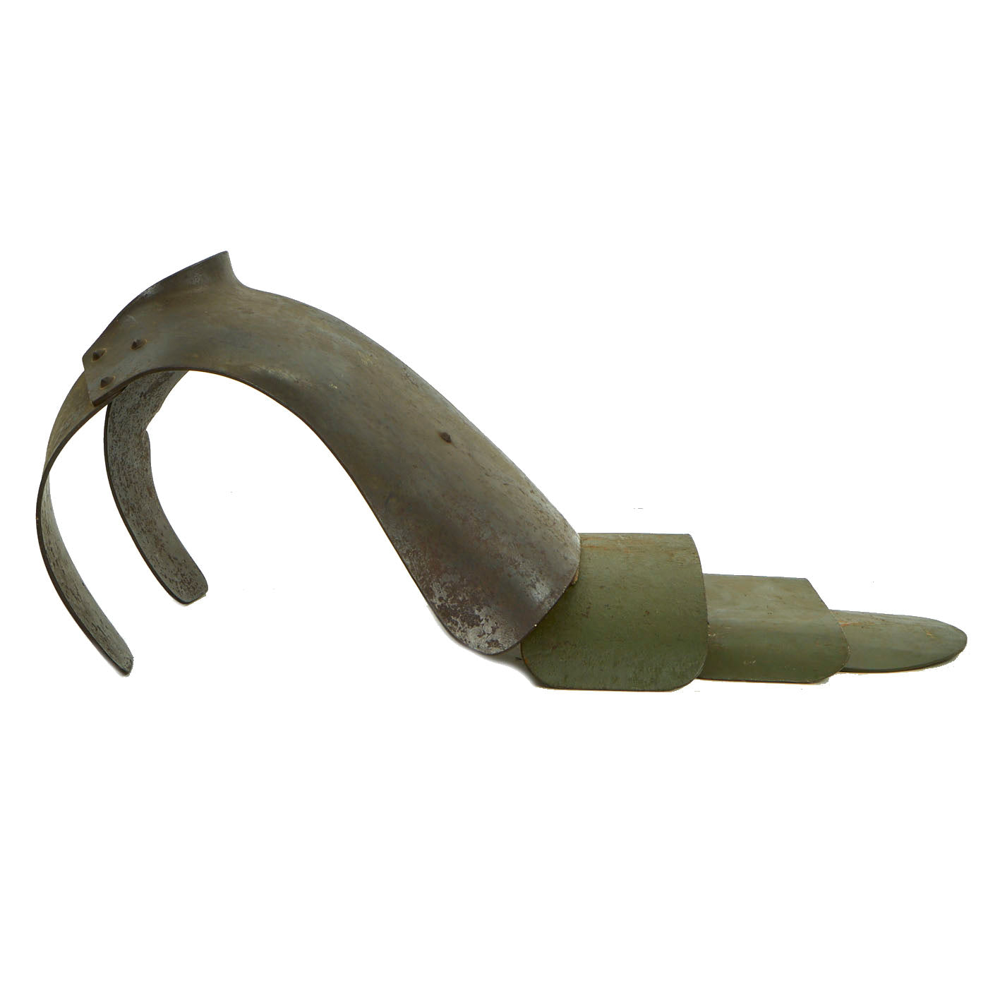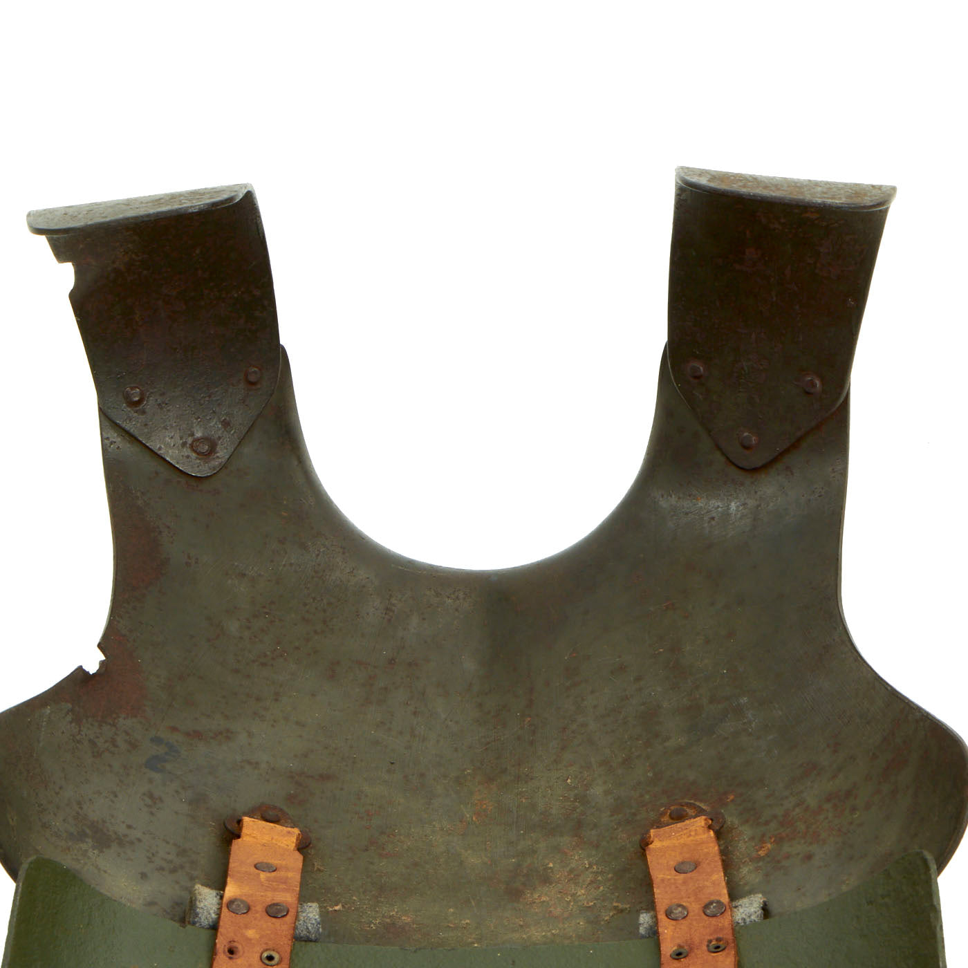 This example of a breast plate with shoulder attachments features the original dark grey painted finish and is free of dents and defects. This First World War period German Army armored breastplate of the type initially issued to front line troops in 1916. The complete equipment weighed between 20lbs and 24lbs (9kg and 11kg), reflecting the two variant sizes produced; 500,000 sets were issued to men on the Western Front. Capable of stopping low velocity fragments and shrapnel, the Sappenpanzer (trench armour) was, due to its weight, only practical for troops on sentry duty and machine gunners operating in static positions and was designed to be used together with the armored brow plate that hooked on to the steel helmet.