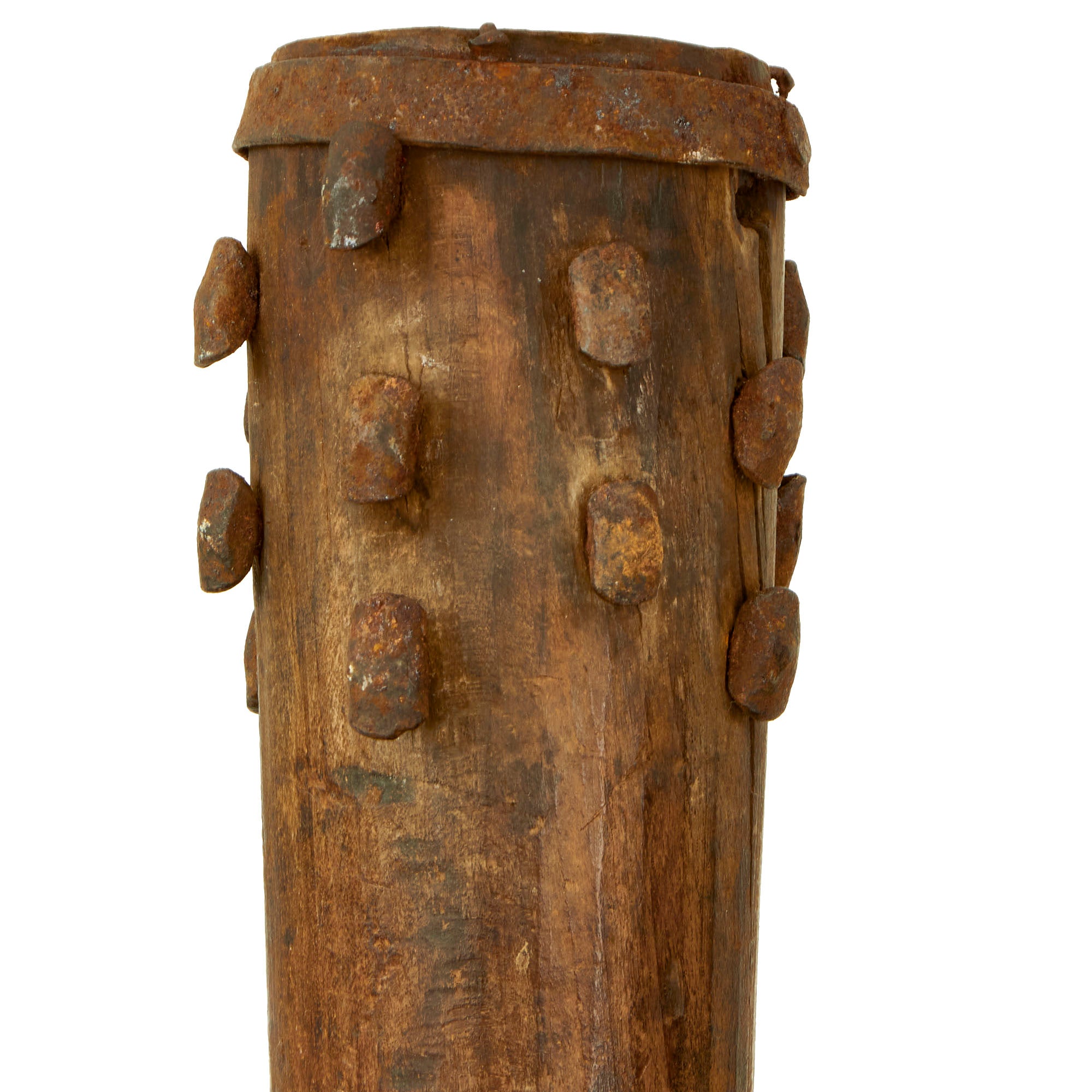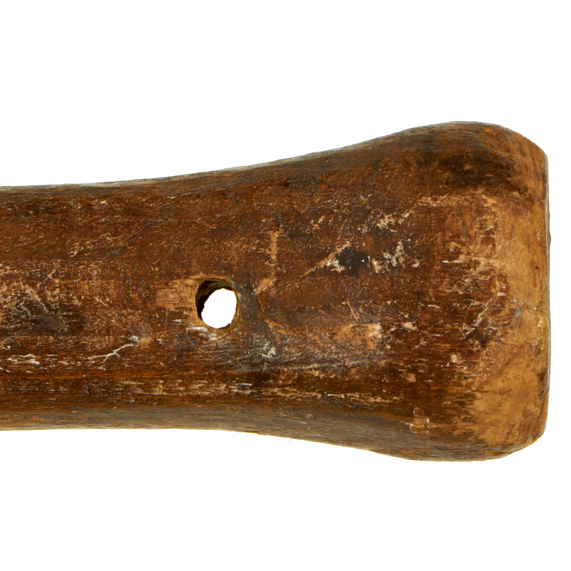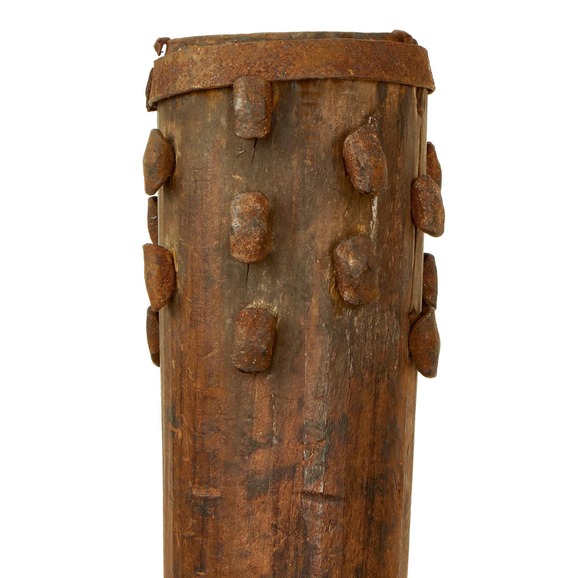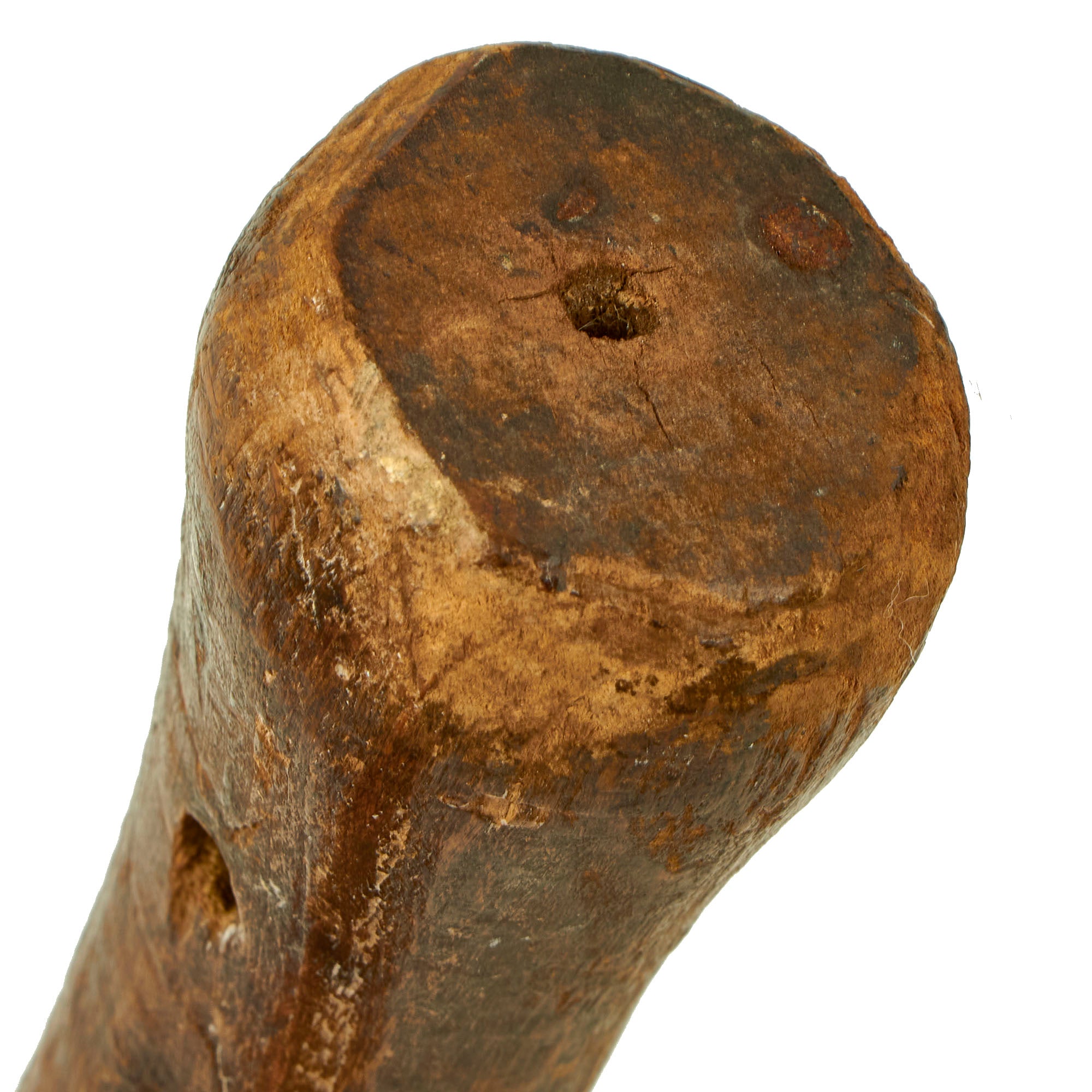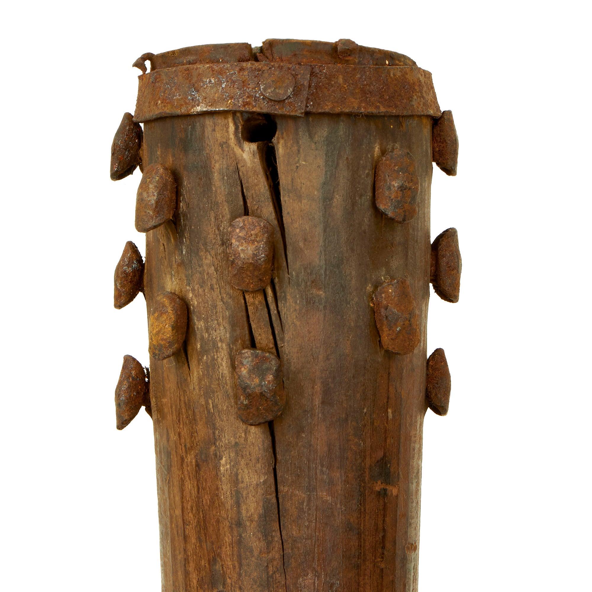 This is an exceptional example of a World War One German trench club. Its length approximates 18 inches and has a mass of 1.7 lbs. The center for the top of the club was hollowed out and filled with lead. In addition, eighteen large nails (of unknown origin) have been hammered into the surface of the club's head using an alternating pattern of two's and three's. A 3/8" wide forged iron ring and rivet were attached to the top of the club to prevent the club's head from splintering upon impact. Small flat-headed nails have been added to the outer perimeter of the club's head to retain this iron ring. The roughed-out surface for this club's oak handle is cylindrical and gradually tapers from the head toward its smooth-surface grip. An hole was drilled above its roughed-out pommel for a lanyard.