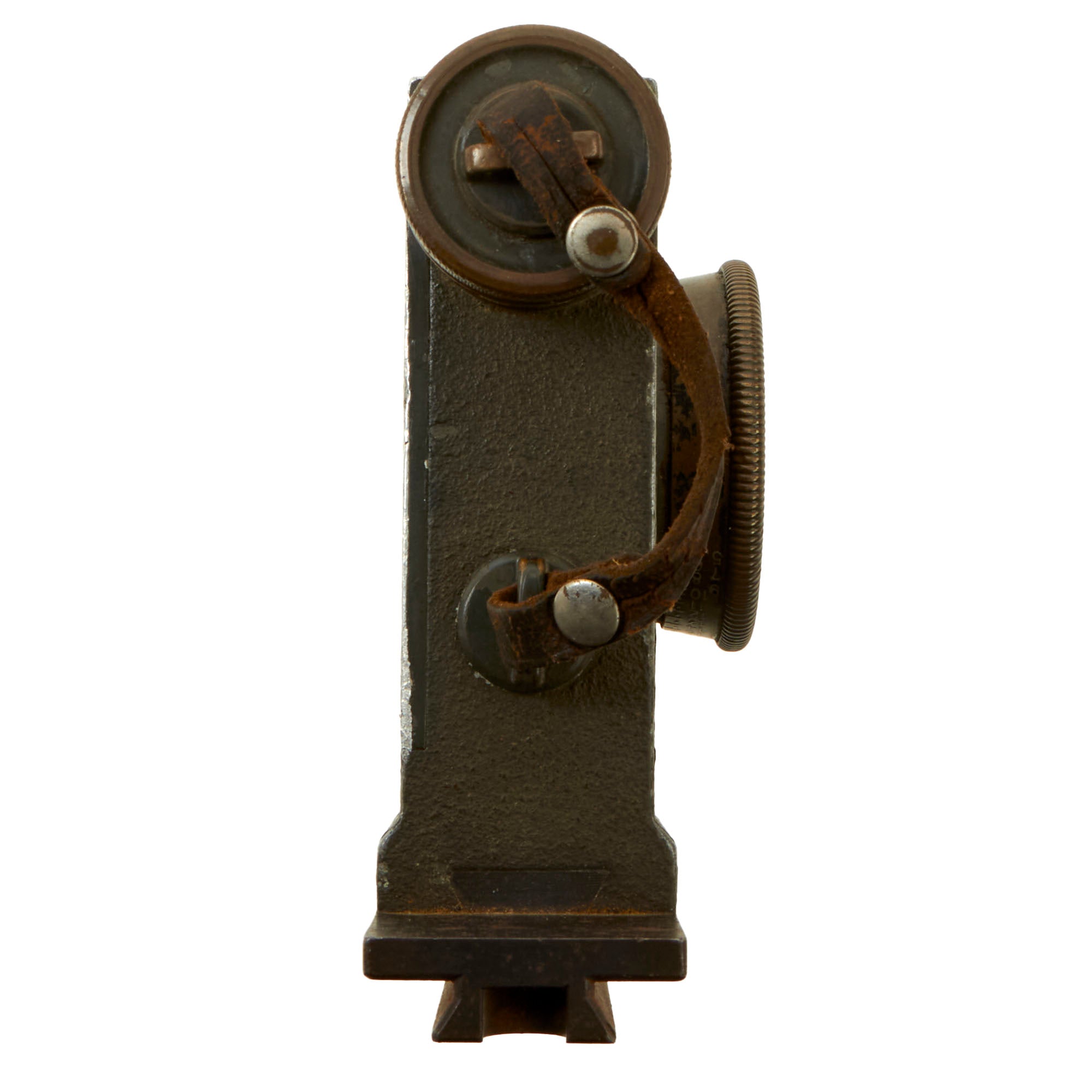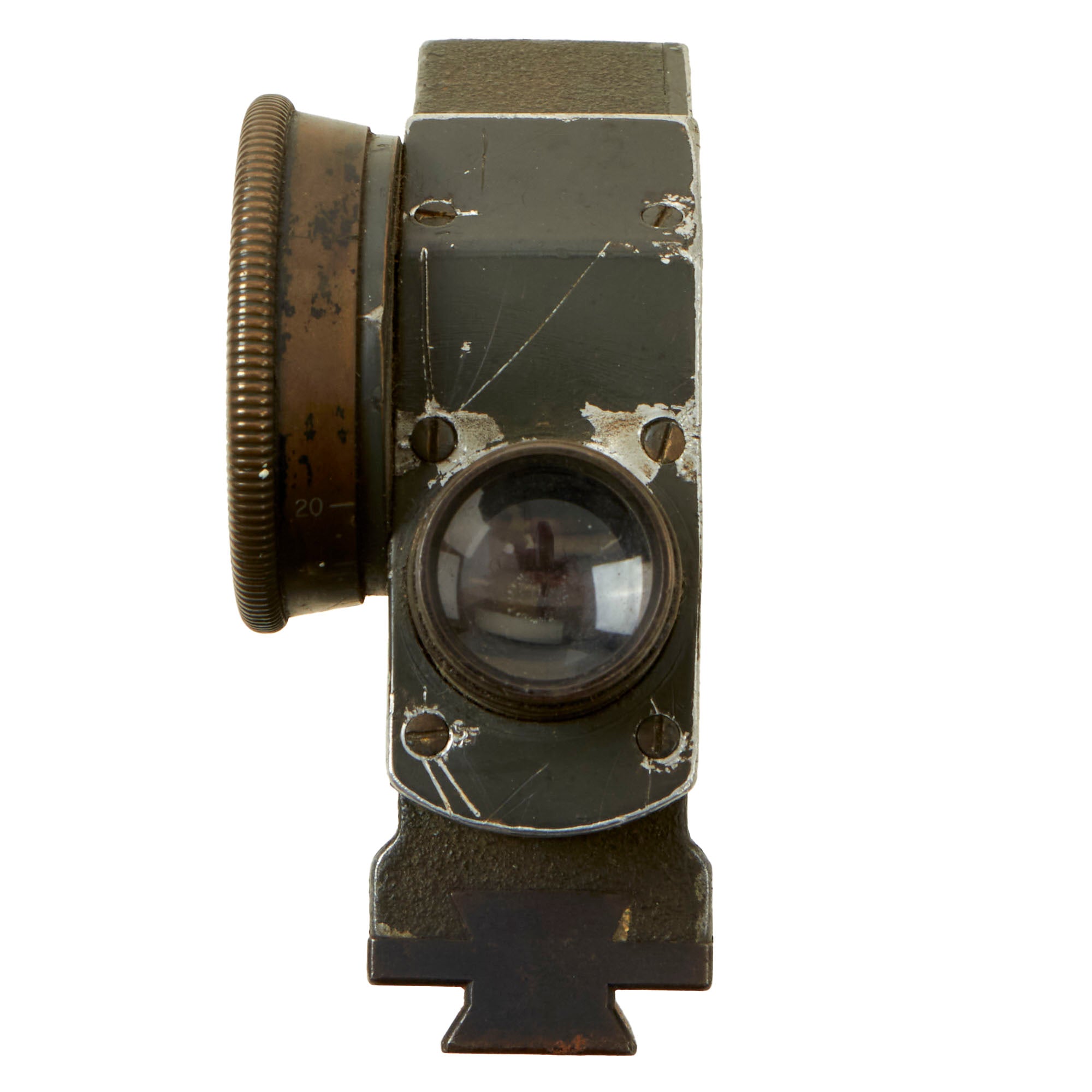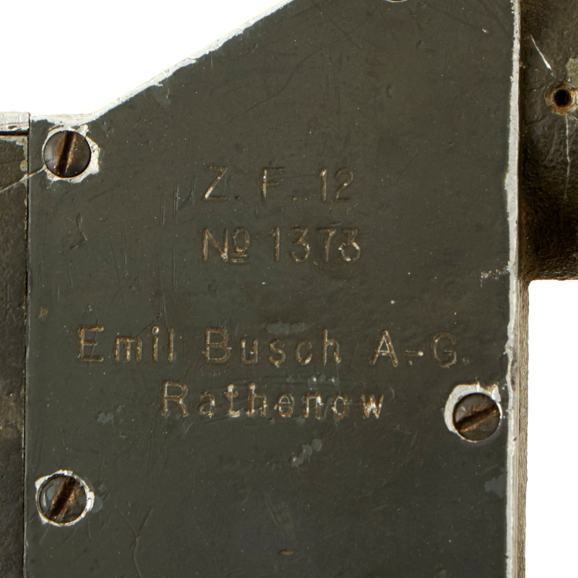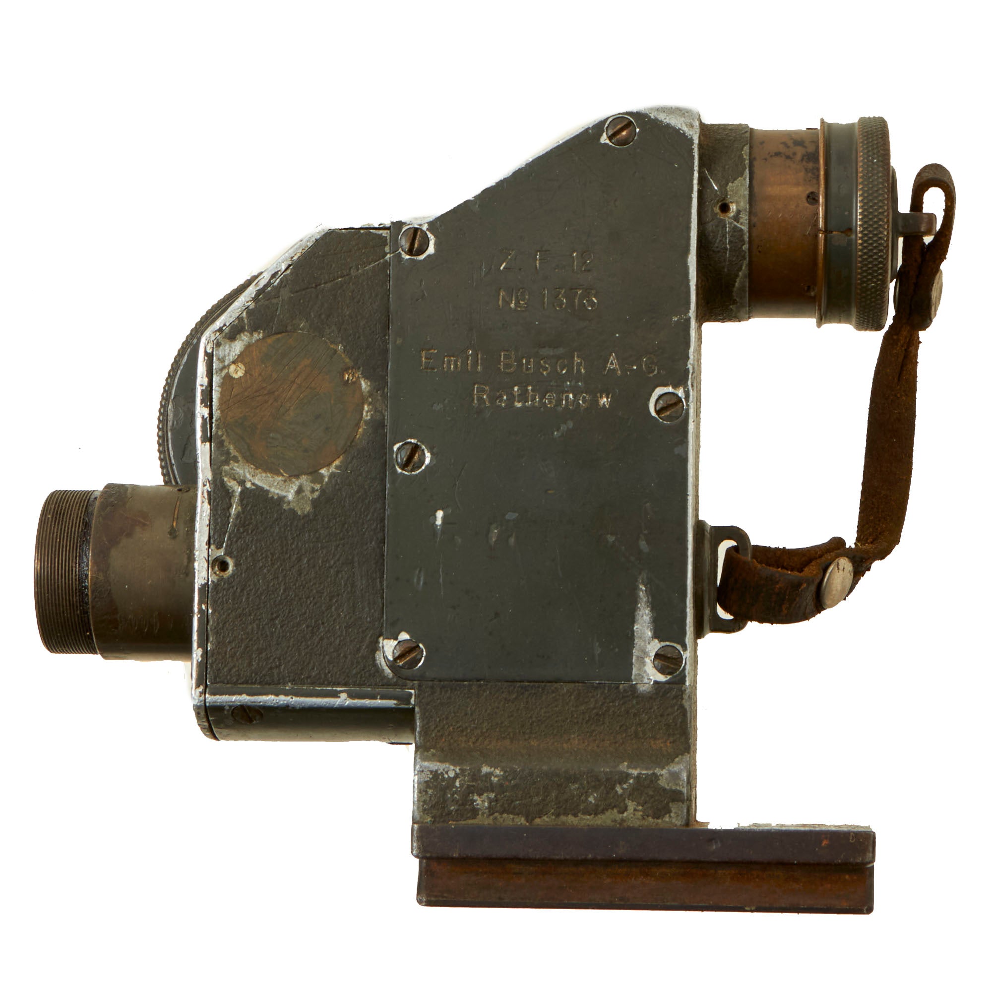 Original Item: Only One Available. This a very nice service-used example of the German WWI Zielfernrohr (Remote Target Scope) 12 (Z.F.12), a 2.5X power, optical gun sight for the MG08, 7.92mm, Maxim machine gun, as used by Imperial Germany and her allies during the First World War and beyond. This example was stored in an Ersatz Binoculars case, which we have left included. It is marked on the side with the number designation, serial number, and maker information:Z. F. 12.No. 1373Emil Busch A.-G.RathenowThe sight is also unit-marked on the adjustment wheel:J.R. 95. M.G. 3.K11436.This identifies the sight to having been used by the Machine Gun Company of the 95th Infantry Regiment or Infanterie-Regiment Nr. 95, attached to the 76th Infantry Brigade, XI Corps (Hesse-Nassau and Thuringia), which saw heavy fighting on both the Eastern and Western fronts during World War I.The optics look great and appear to be fully functional, with just some cracking to the glass in the top left when viewing the optic. It is however missing the leather eyepiece, but the dial on the left side is present. The sight does still retain the lens cover for the objective lens. The included binoculars case is in worn condition with the lid having torn away from the leather, but still works well to display the sight with.A great example unit-marked to a very combat-torn unit. Ready to fit to your MG 08!