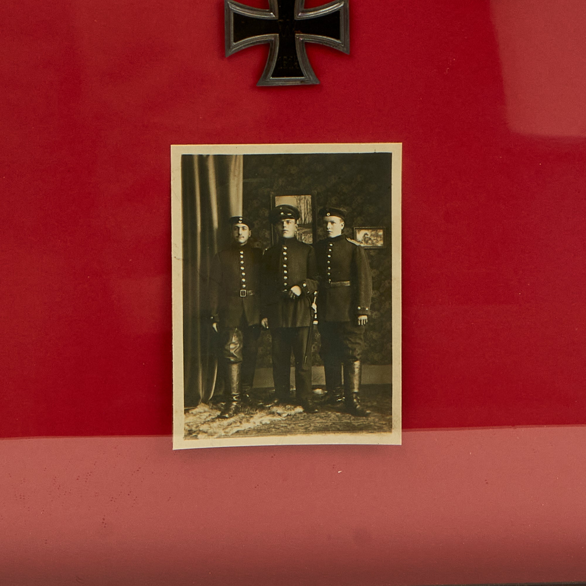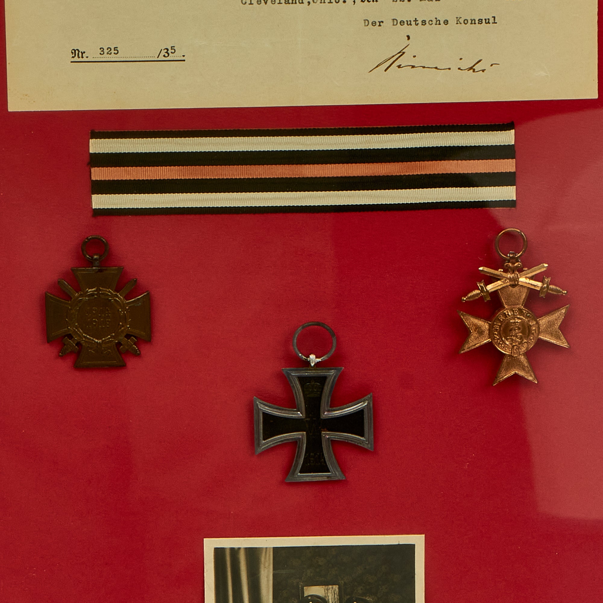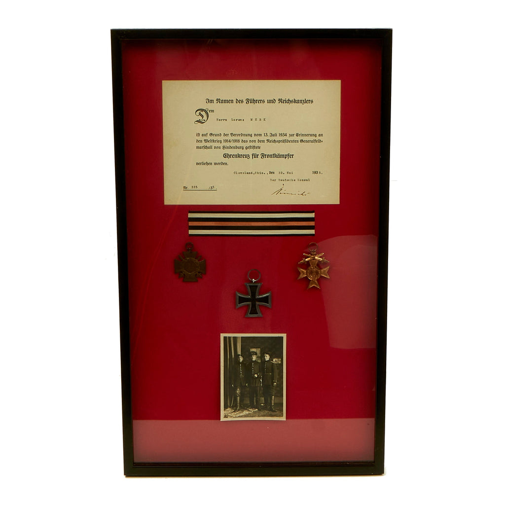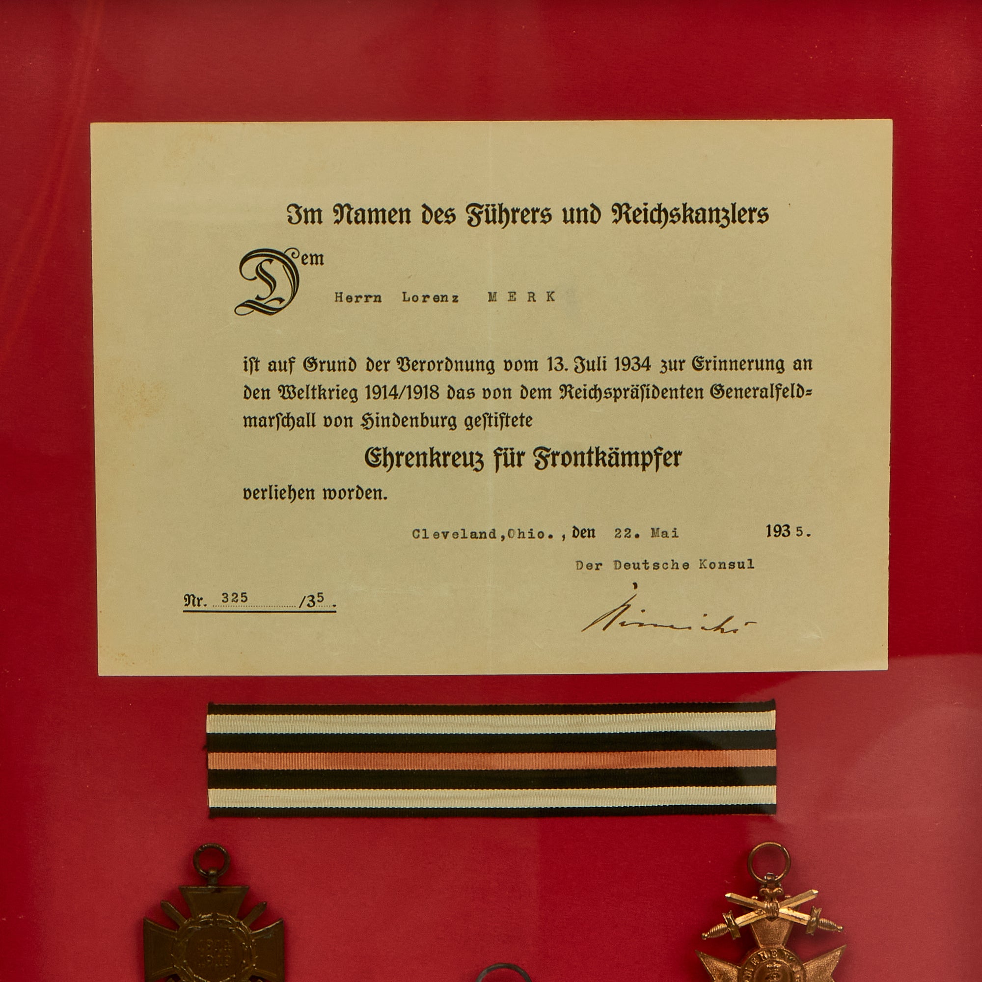 Original Item: One-of-a-kind. This is a very nice Imperial German WWI Award grouping, belong to a German Veteran who looks to have relocated to the United States following the war. It has been mounted on a red background, and set into a 12 3/4" x 21 1/2" glazed wooden frame, which we assume is only a few decades old, and not period. The frame contains an award document indicating that Hern Lorenz Merk had been awarded the Ehrenkreuz für Frontkämpfer (Cross of Honor for Front-line Figthters) on 22. Mai 1935. The document was actually sighed in Cleveland, Ohio. on 22. Mai 1935 by Der Deutsche Konsul (the German Consul. This was relatively common during the early days of the NSDAP rule, as they wanted to entice experienced veterans to possibly return to Germany.