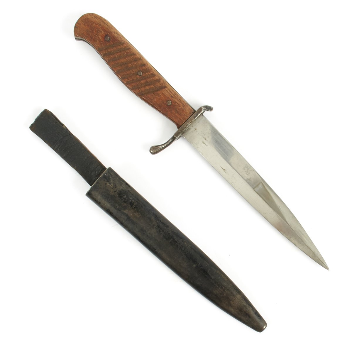 Original Item: Only One Available. Fitted with a single edge and a slight Bowie style blade this is an original fighting knife used by the Germans in WW1. Offered in very good condition, this knife has classic Austro-Hungarian wood grip panels secured by three pins. The blade is one sided but has a small return of about two inches at the point. The blade is un-sharpened in bright steel and in excellent condition.