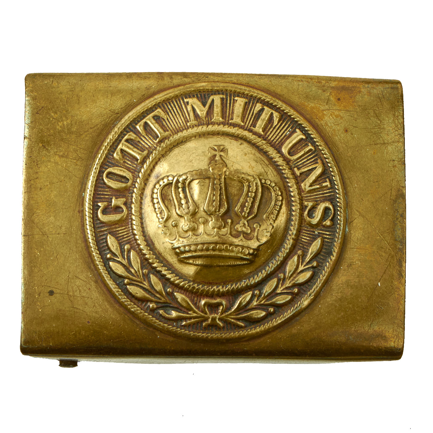 - One Imperial German WWI Prussian M1895 Belt with "Gott Mit Uns" Brass Belt Buckle. Two piece all brass construction, showing light wear with a lovely mustard patina.