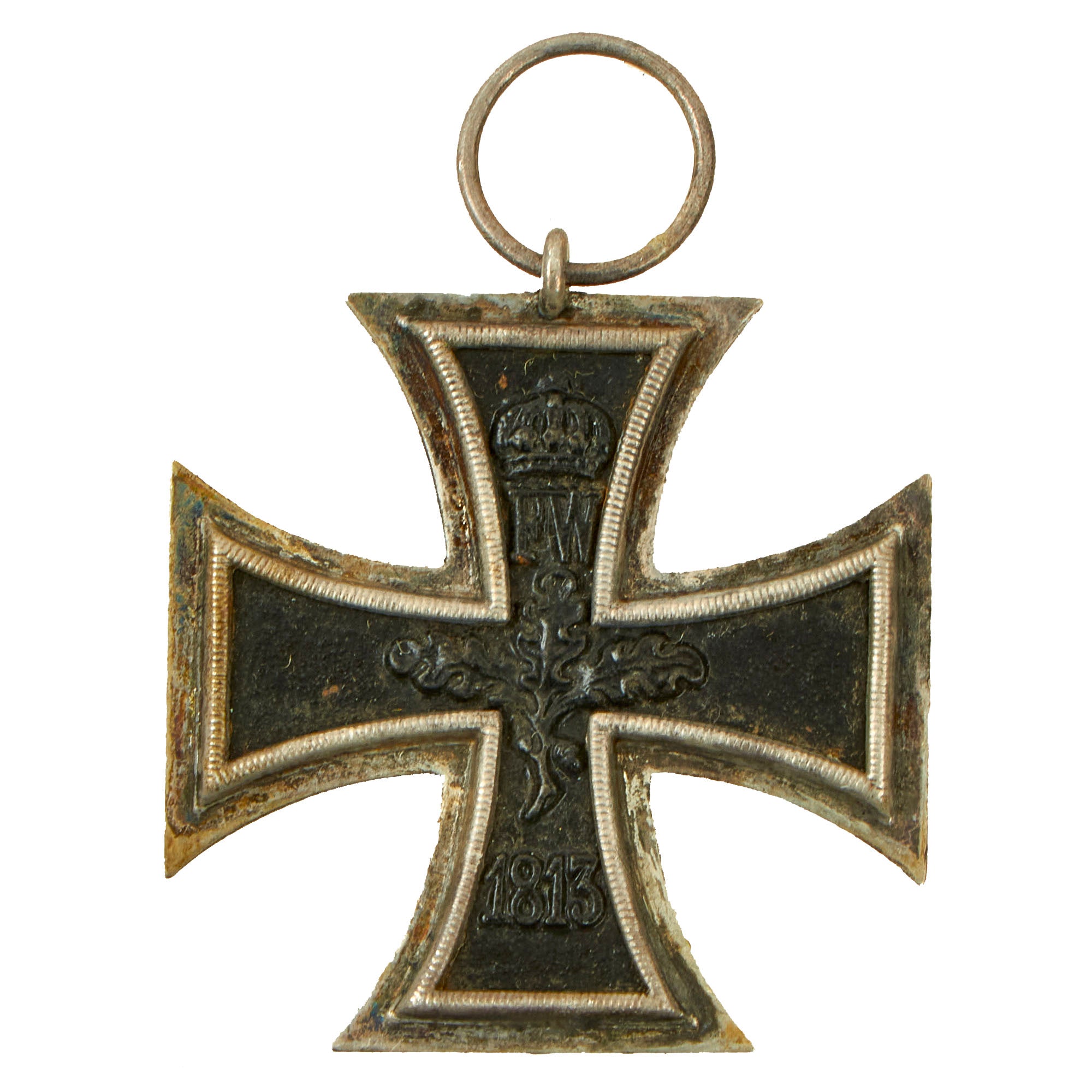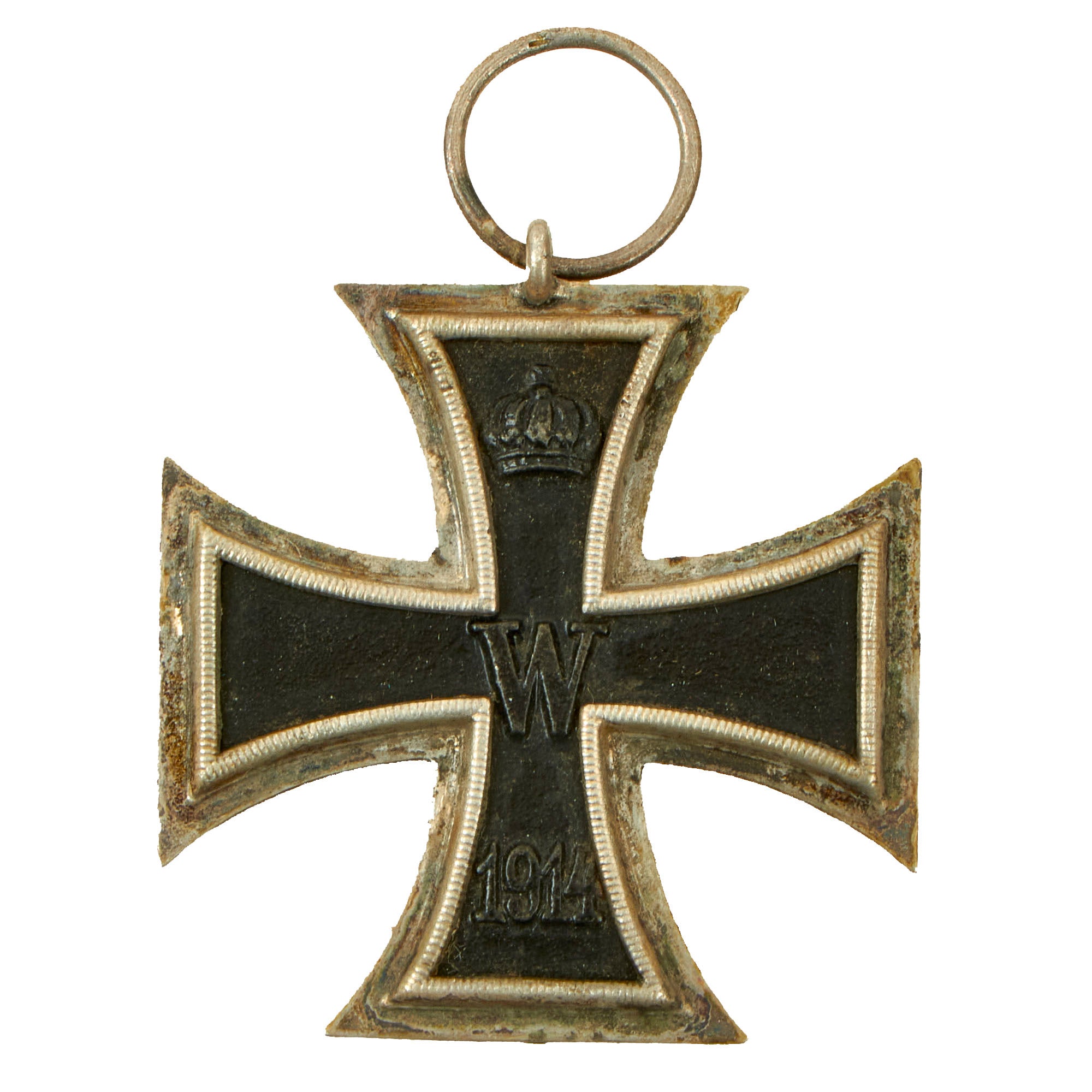 The basic design of the WW1 crosses is a central Tatzenkreuz (cross pattée) struck from iron and mounted in a silver frame which has a raised crenulated decorative border. The obverse of the cross bears the date 1914 under a crowned 'W' monogram. Reverse bears an oak leaf cluster with the date of the decoration’s institution, 1813 underneath - the crowned initials of Frederick William are in the top arm above the oak leaf cluster. Suspension for second-class types is by means of a ring, and frequently this ring bears a maker's stamp.