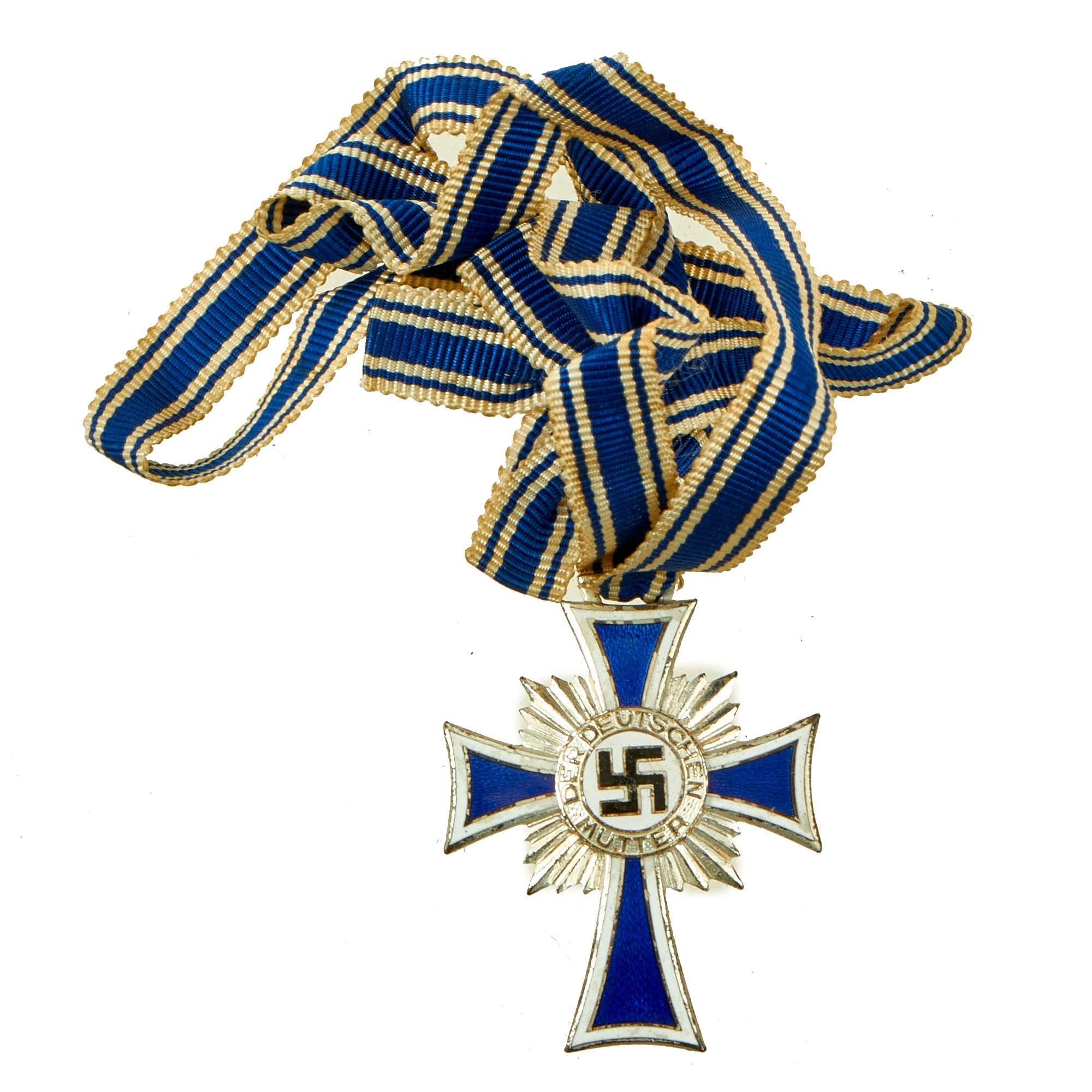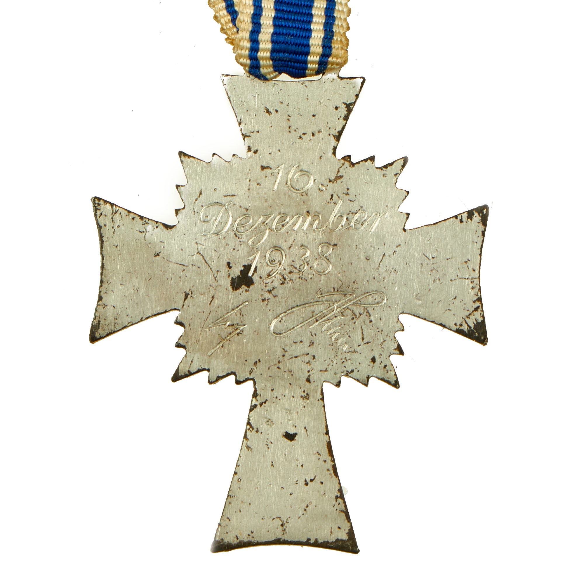 The cross design is a slender elongated form of the Iron Cross or cross pattée and very similar in design to the Marian Cross of the Teutonic Order, enameled translucent-blue with a slim opaque-white border. Resting on the center radiant starburst rays is a metal roundel decorated with the words DER DEUTSCHEN MUTTER (in English: TO THE GERMAN MOTHER) around an enameled black straight centered "swas" symbol, infilled white enamel. Reverse of medal reads 16 December 1938, which is the date that the award was first established, along with AH's Signature.