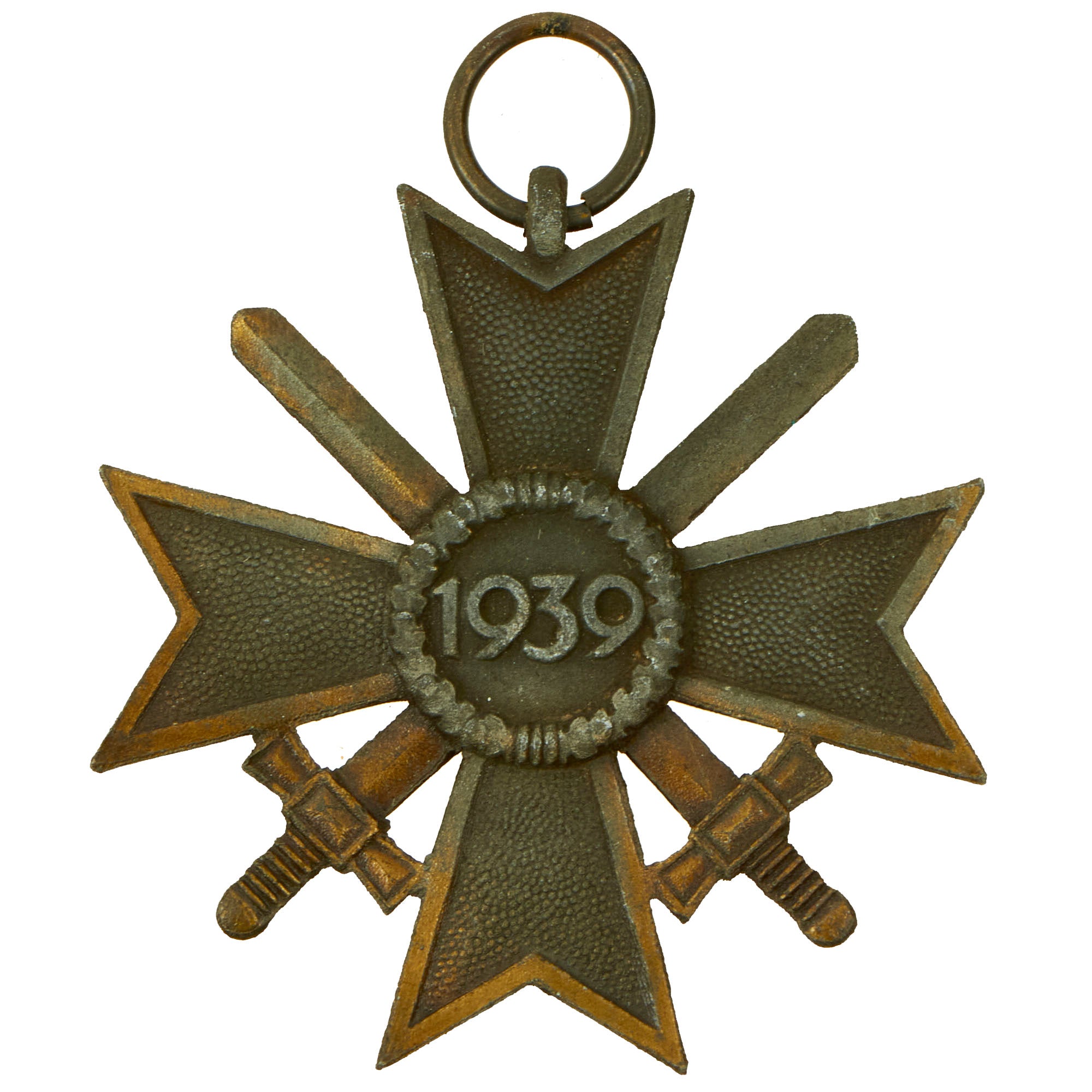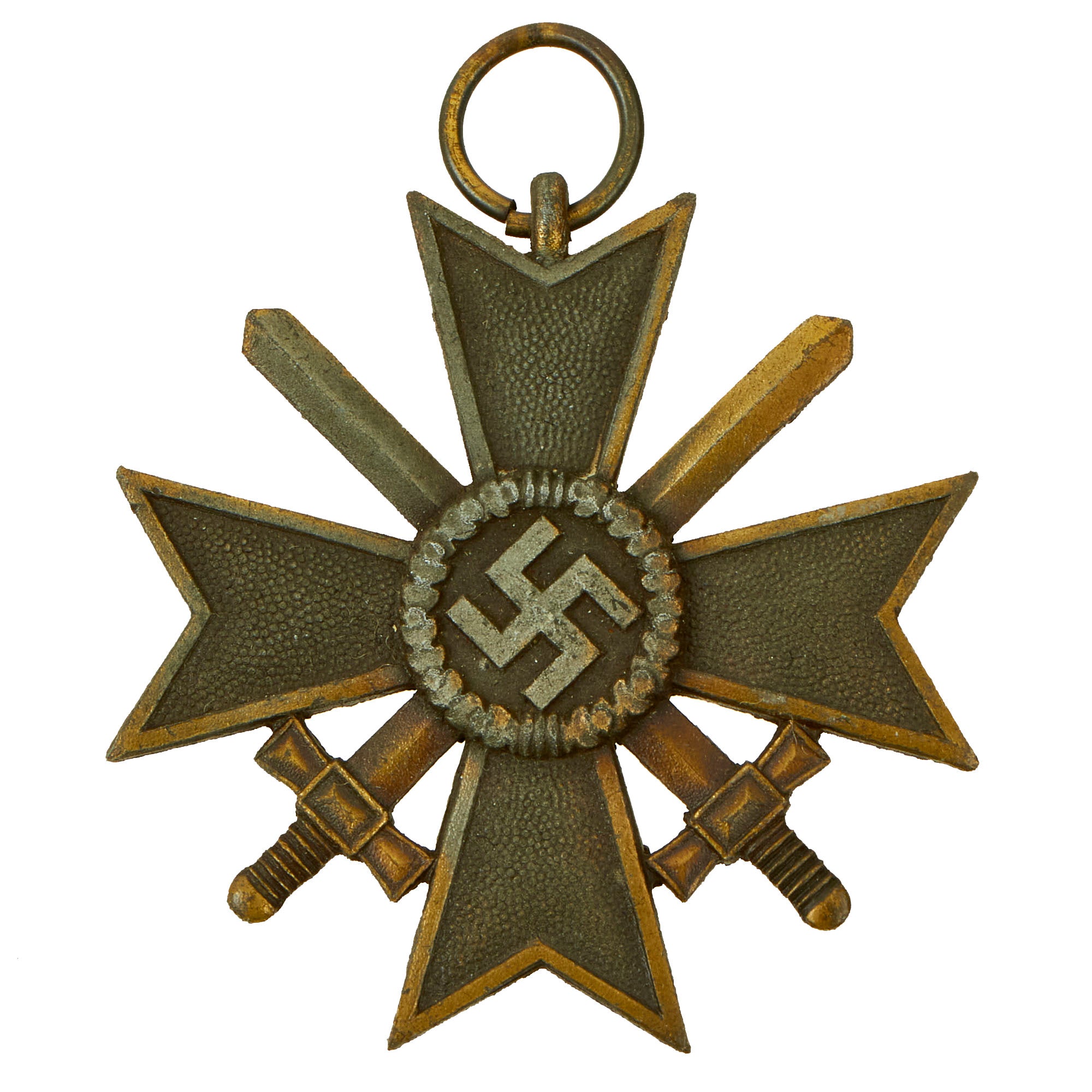 - One German WWII War Merit Cross 2nd Class with Swords (For Combat). - Missing Ribbon. Hanger Ring is not maker marked. The gold wash on the zinc body is about 25% retained.