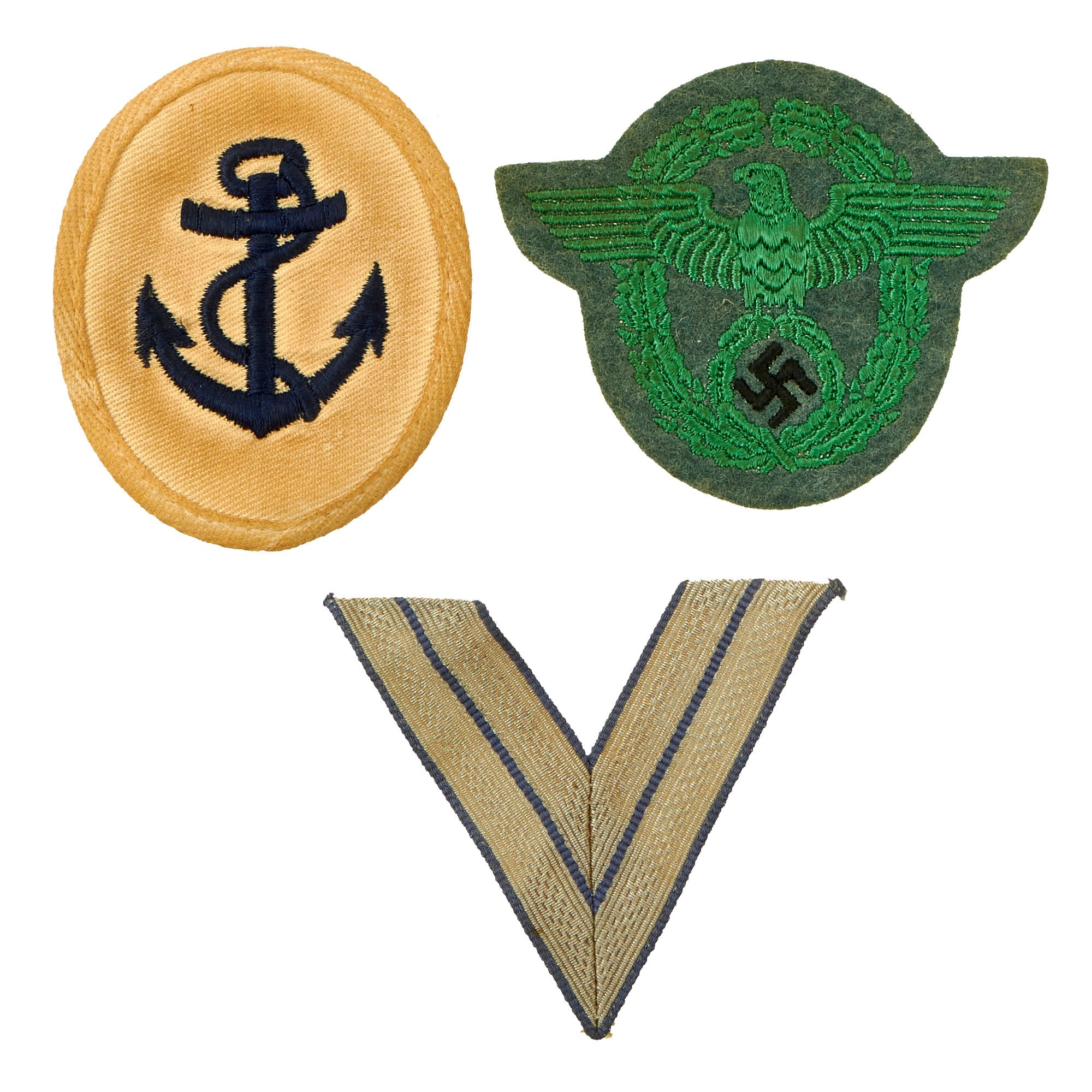 - One German WWII Bootsmannmaat Boatswain NCO’s Career Sleeve Insignia. For the Summer / White uniform, navy blue embroidered on white background. It has faded to beige over the years. Still maker marked on the back by Karl Hehler.