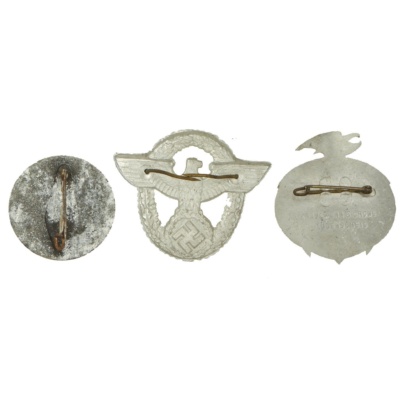 - One German WWII Protection Police Visor Cap Aluminum Insignia with intact brass attachment pins.