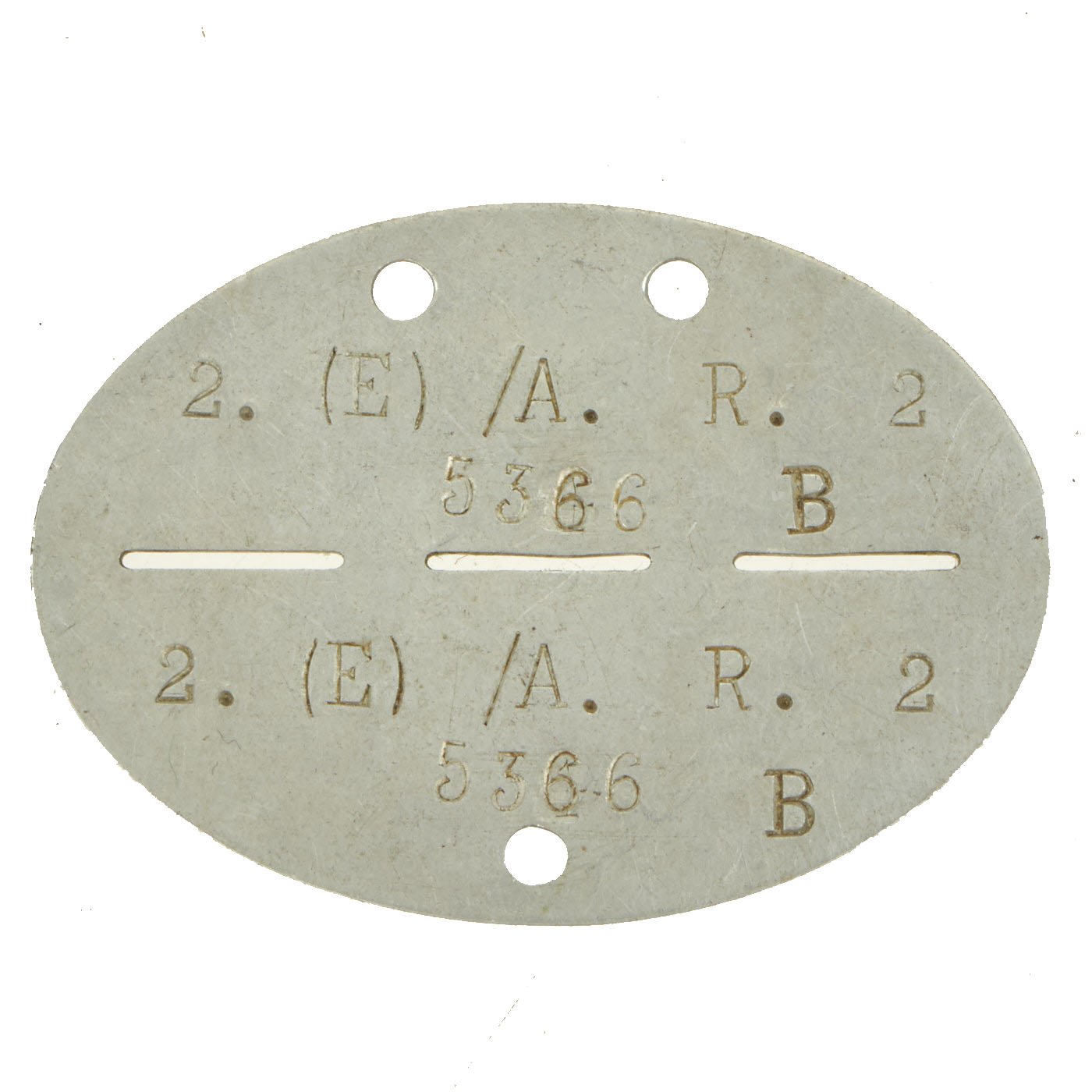 - One German WWII Aluminum Erkennungsmarke (identity disc or Dog Tag), marked 2. (E) / A. R. 2, most likely for an Ersatz (replacement) unit sent to an Artillery Regiment.