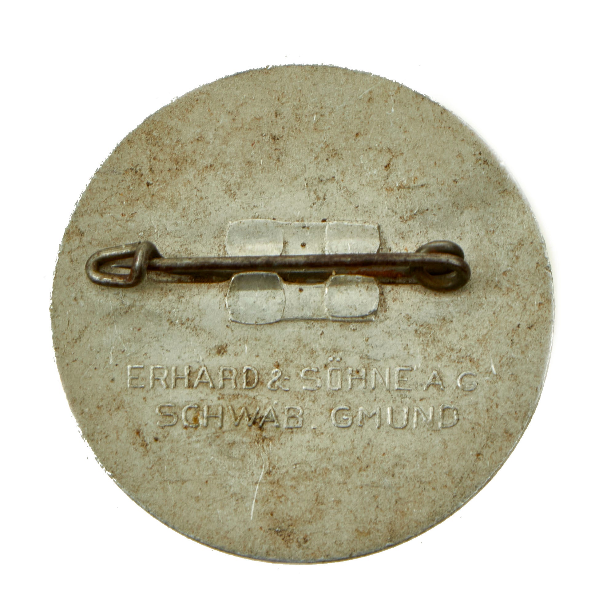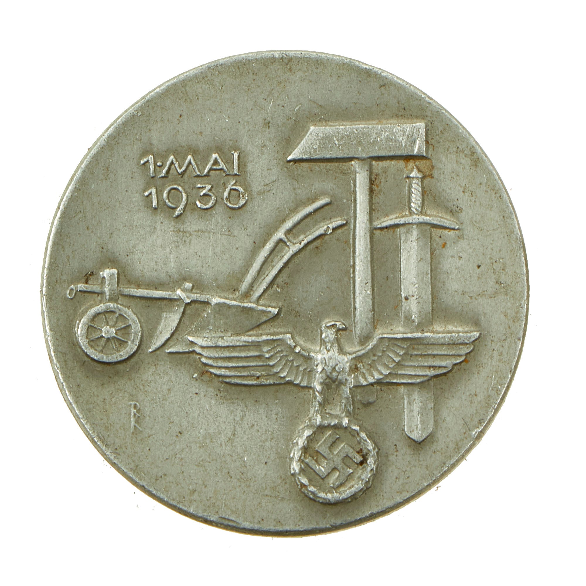 - One German Pre-WWII 1 MAI 1936 (May Day, labor day) Tinnie with pinback. Aluminum construction with only light oxidation, and maker marked on the reverse.