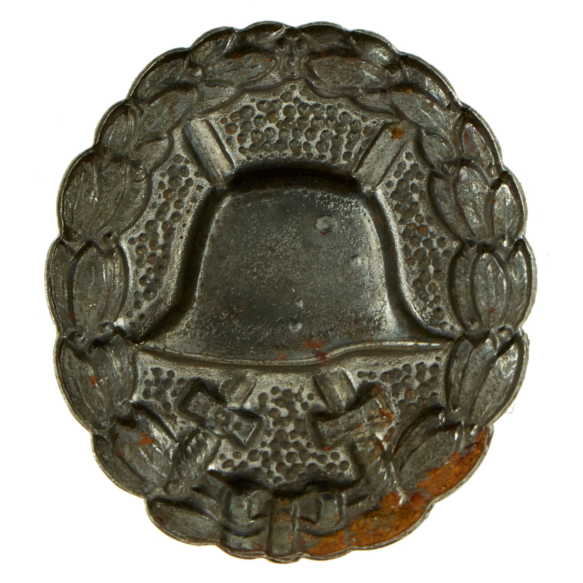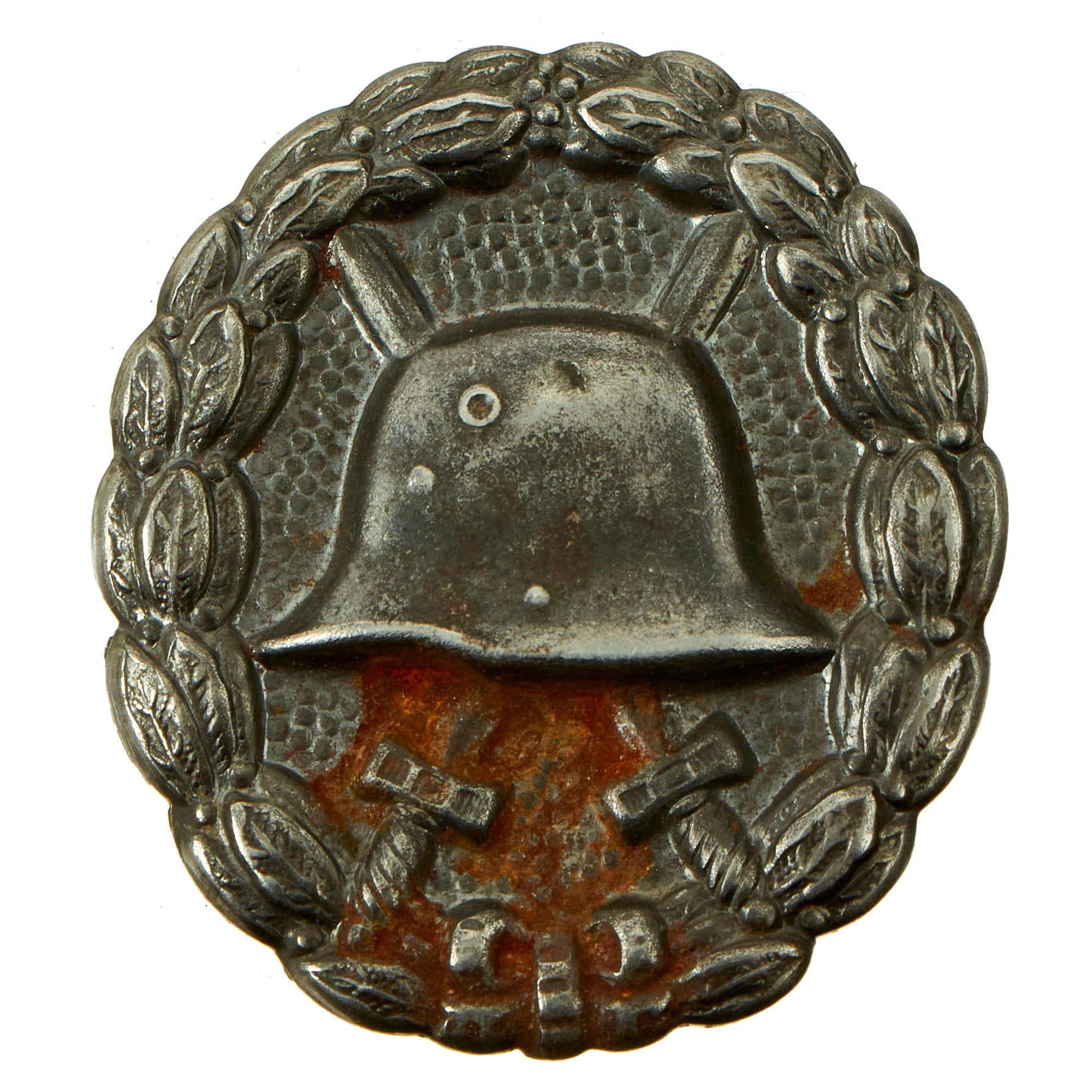 The German Wound Badge (Verwundetenabzeichen) was instituted during the First World War to recognize those wounded in the conflict. It was designed using a World War One style Imperial German helmet as the main motif. The helmet was set on top two crossed swords against a pebbled background and surrounded by a laurel leaves wreath.