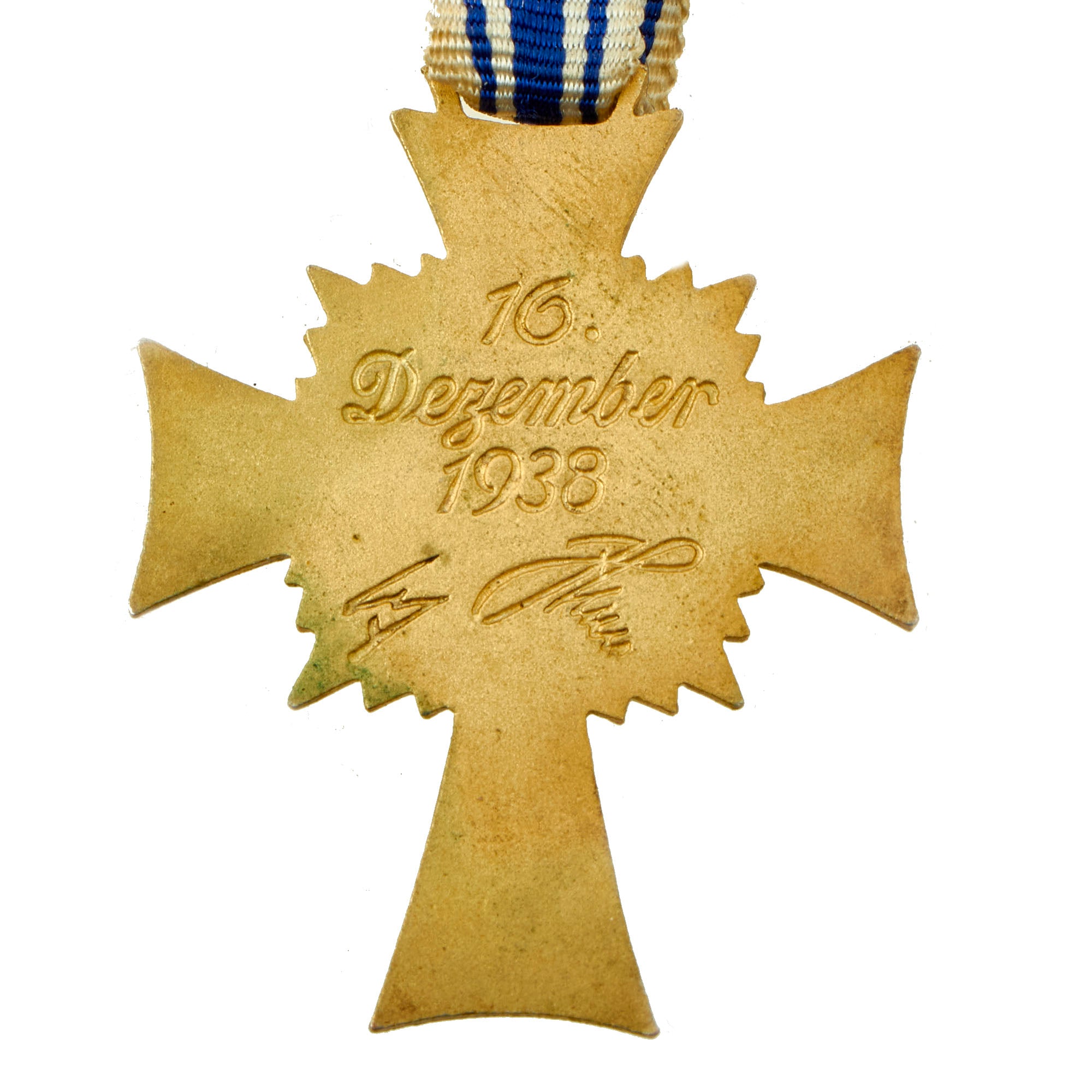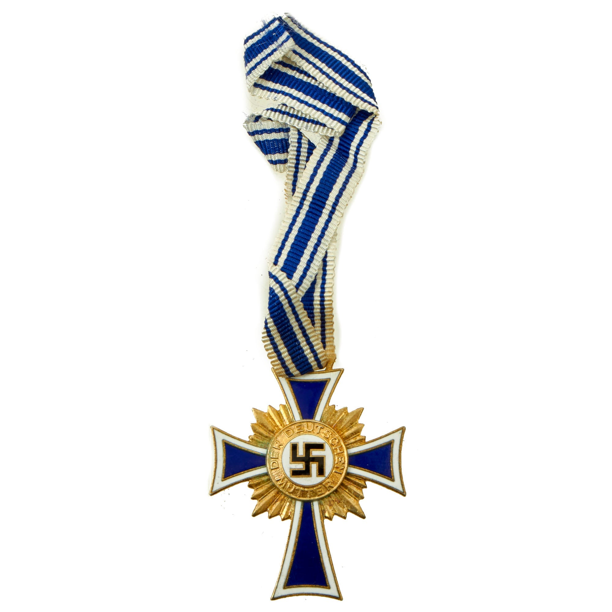 - One German WWII Mothers Cross 1st Class in Gold, for eligible mothers with 8 or more children. Much of the gold color is very well retained, and the enamel is great. It still has a short section of ribbon installed.
