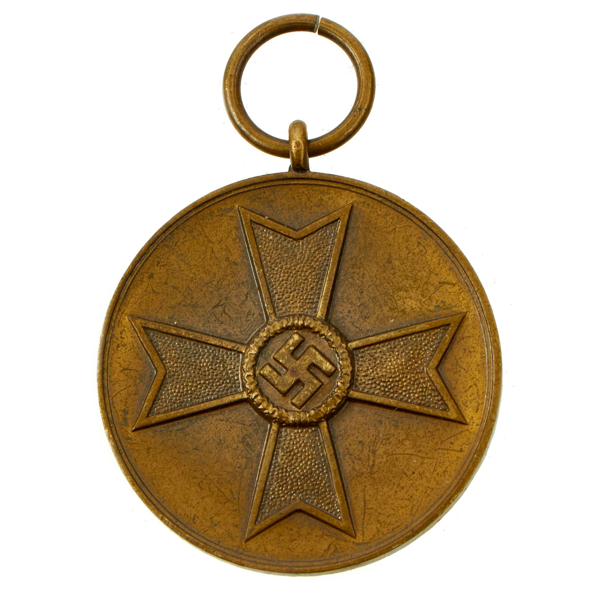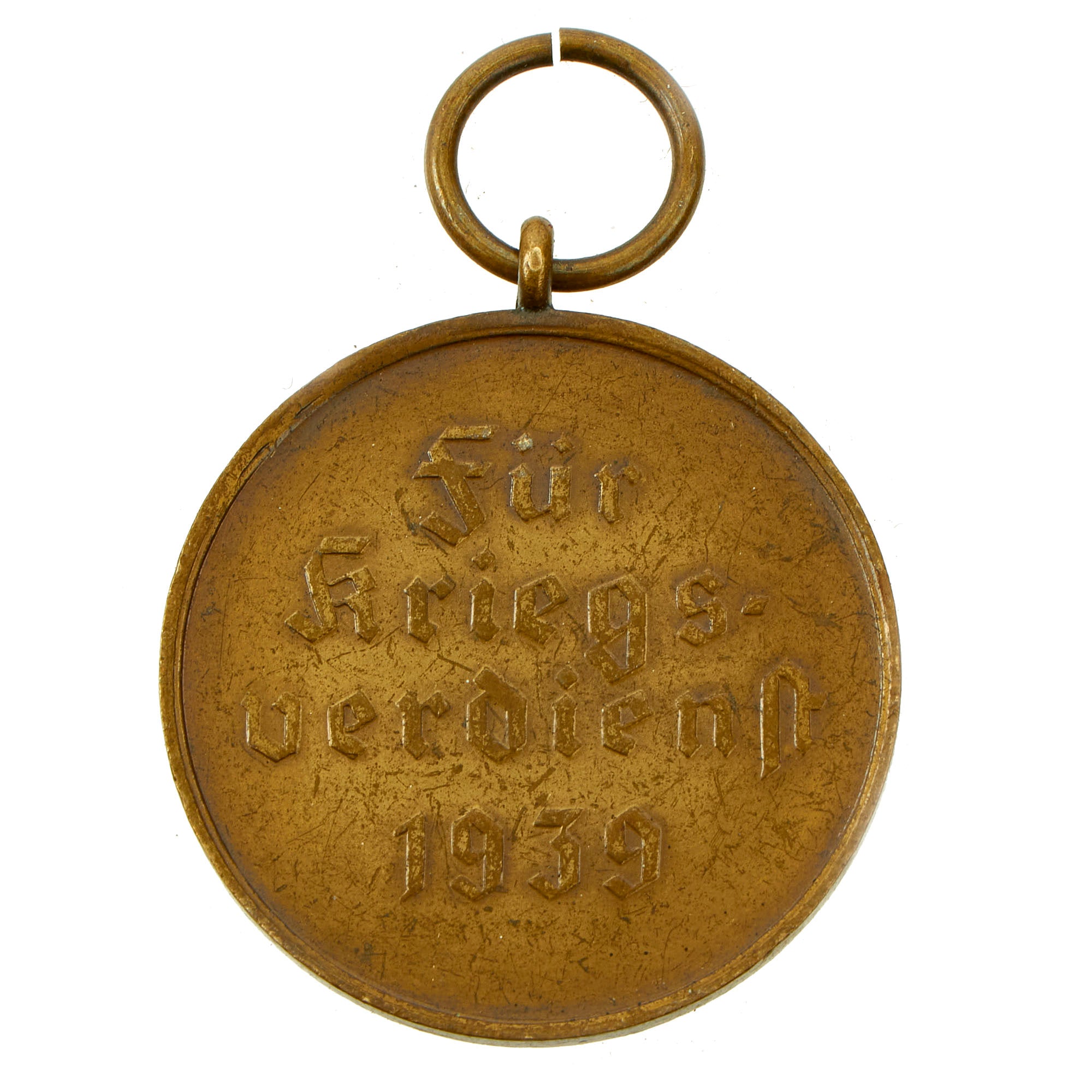 The medal was designed by Professor Richard Klein of Munich. It was a circular bronze award bearing the design of the War Merit Cross on the front (obverse), and the inscription "For War Merit 1939" (Für Kriegsverdienst 1939) on the reverse side. It was suspended from a ribbon colored similar to the War Merit Cross, except for a thin red vertical strip added to the center of the black portion. When worn, it was either as a medal ribbon bar above the left breast pocket (soldiers who had earned the medal as civilians could wear it on their uniform), or with the ribbon only through the second buttonhole of a jacket. Since this was a non-combat award, the medal never incorporated swords. After 15 May, 1943, the award of this medal to foreigners was superseded by the Medal of Merit of the Order of the German Eagle.