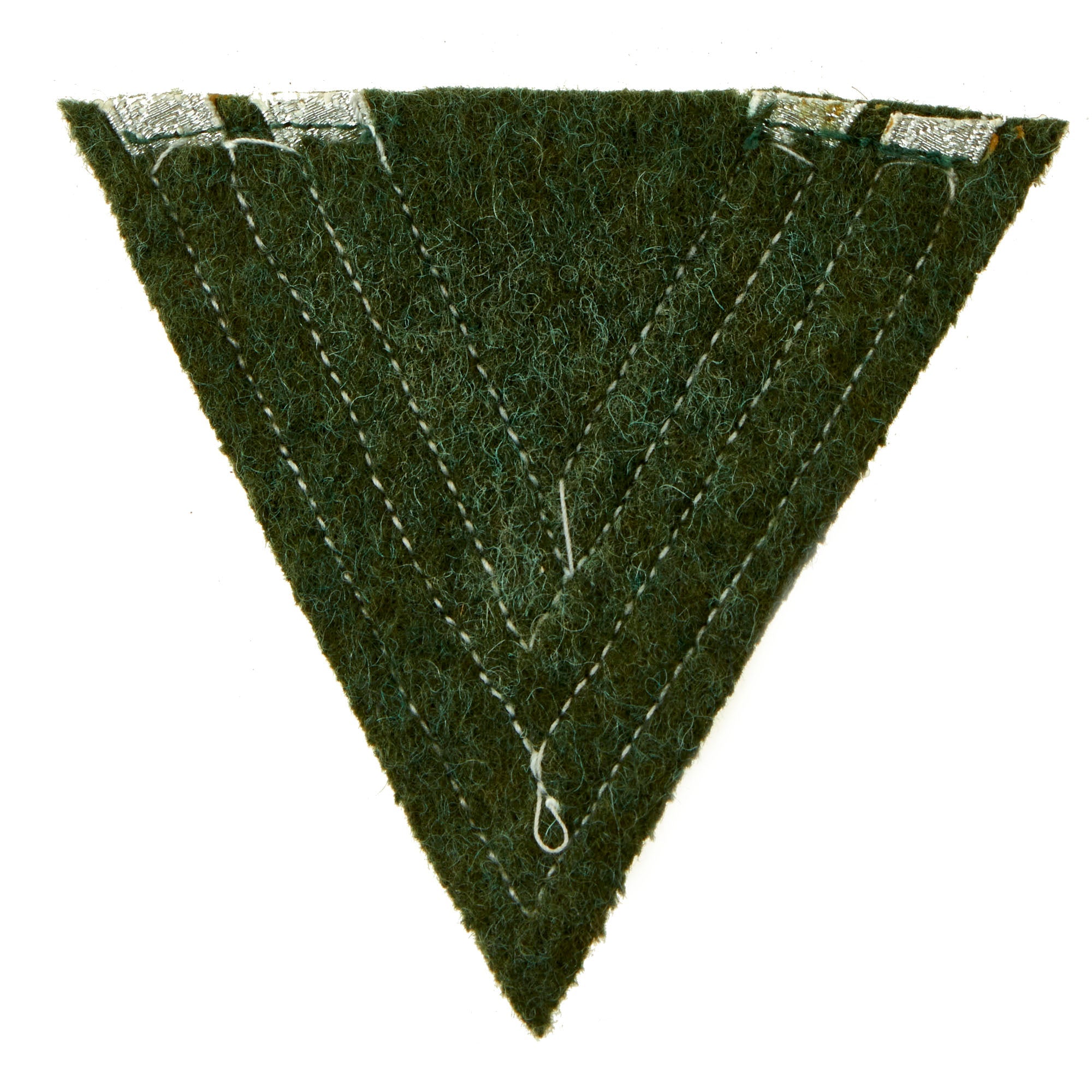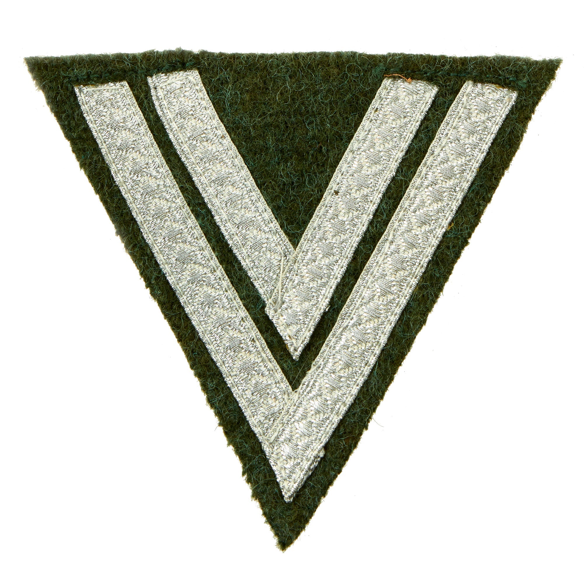 - One German WWII Wehrmacht Army Heer Mannschaften (Enlisted Men) Double Silver Chevron badge on Field Gray Backing, indicating the rank of Obergefreiter, equivalent to a U.S. Army Corporal.
