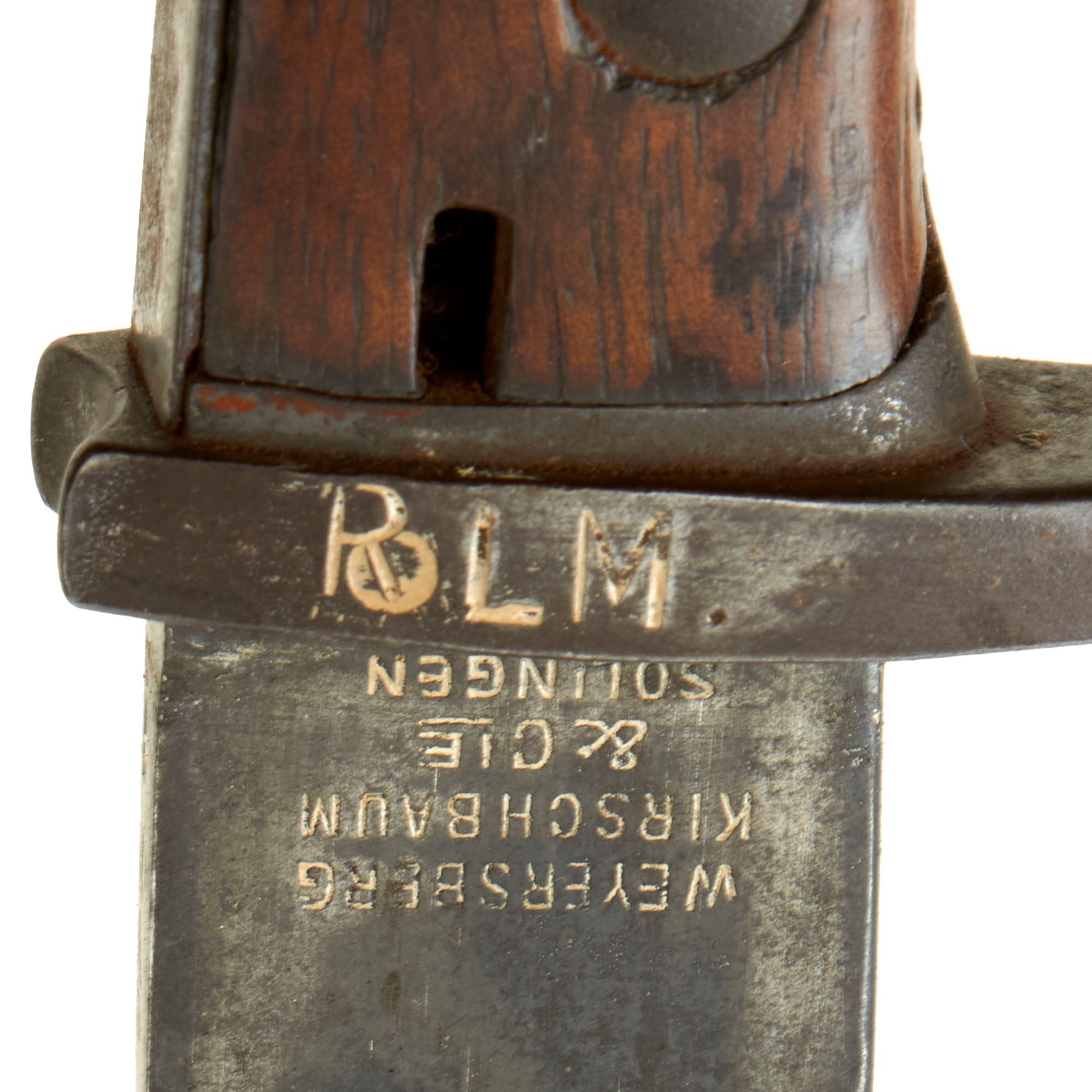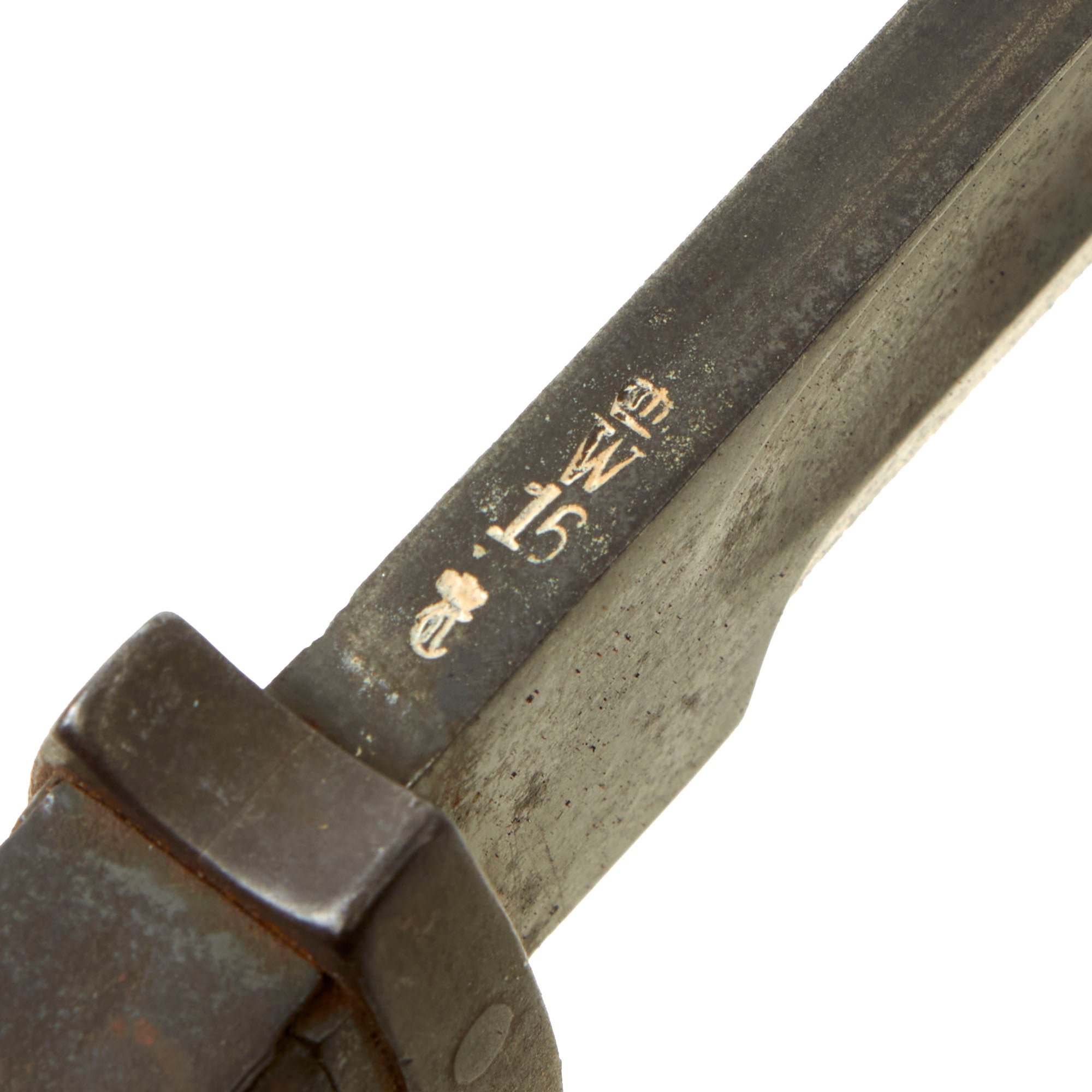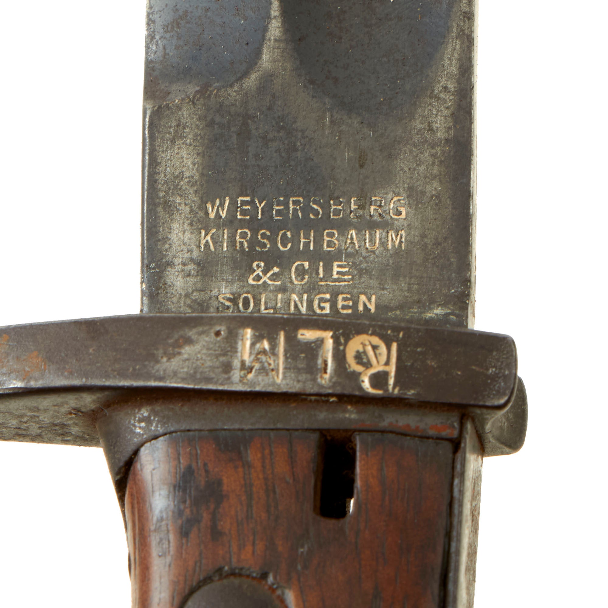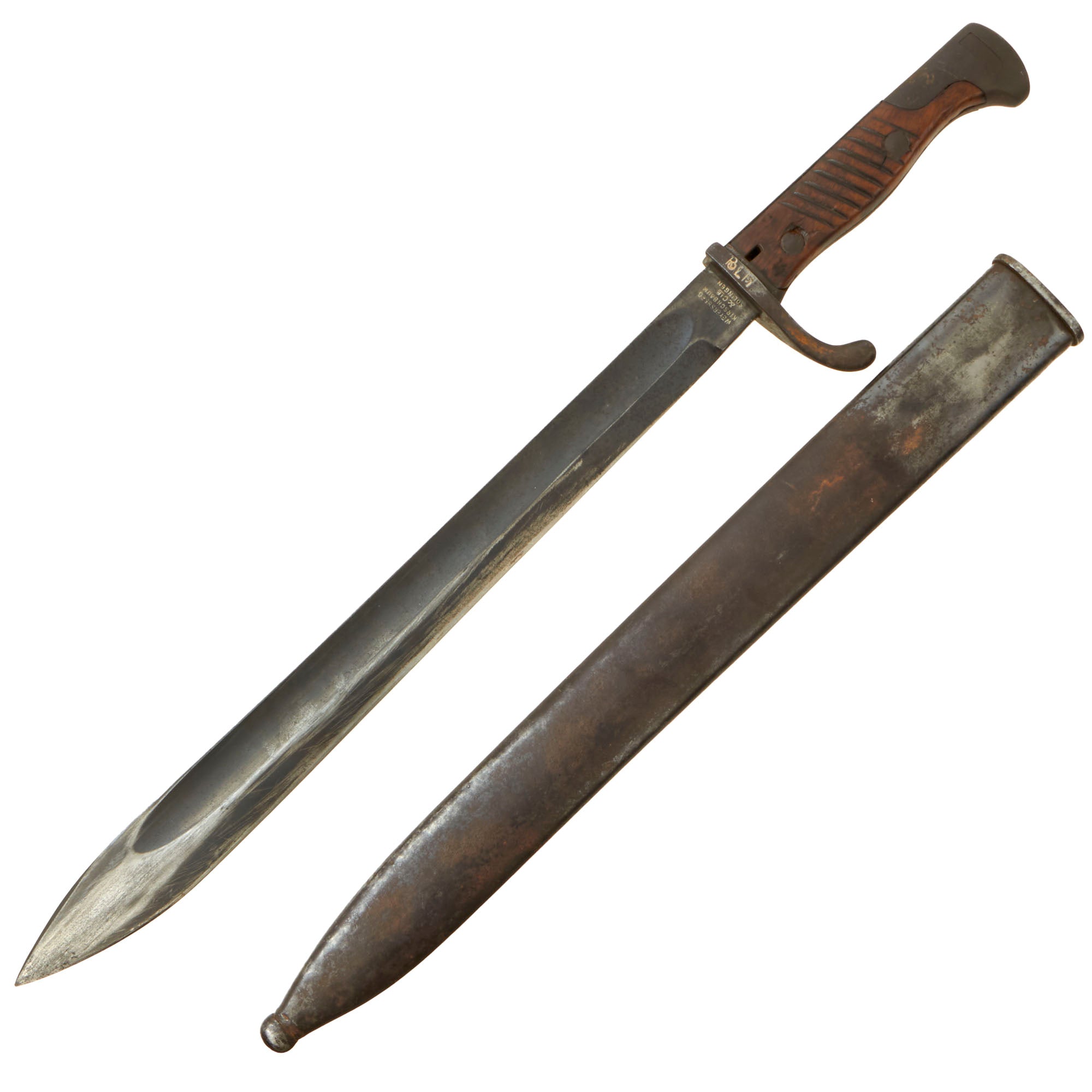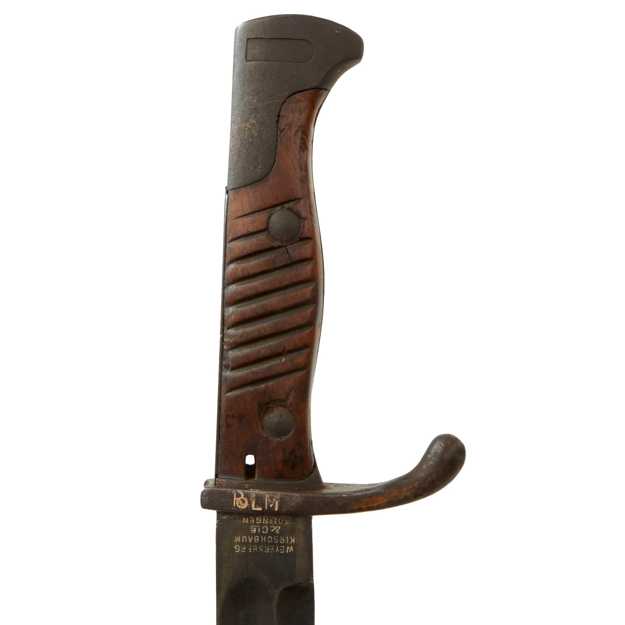The bayonet blade retains most of its postwar-applied factory darkening, and has a very nice set of original grooved wood grips, with denting and some small cracks and chips from wear. The hilt and crossguard are solid, though the finish is worn to a grayish patina from use and age. Bayonet lock is fully functional. The blade ricasso is maker marked: