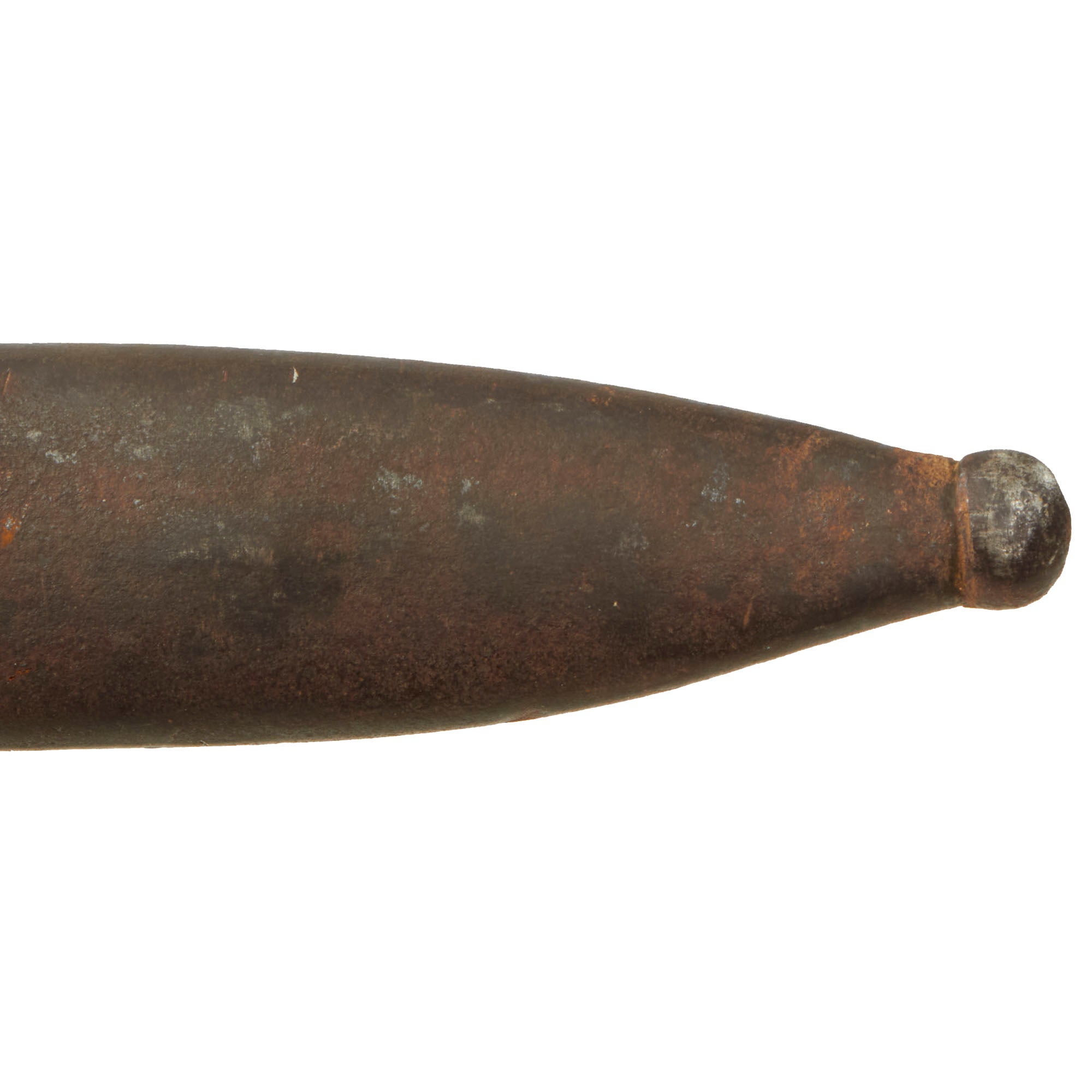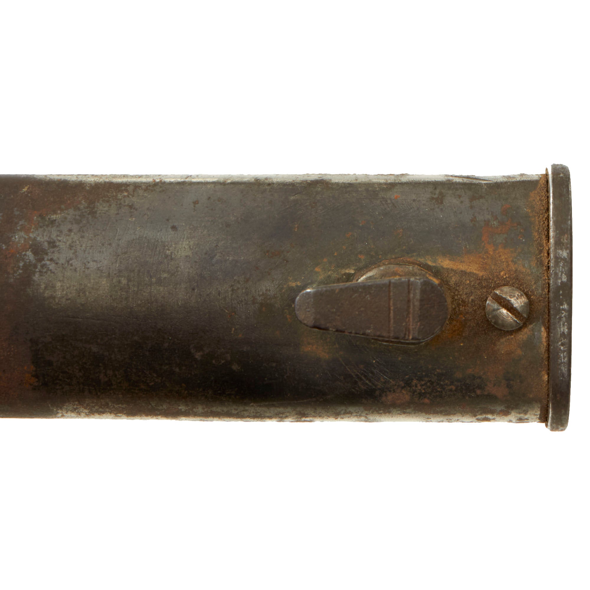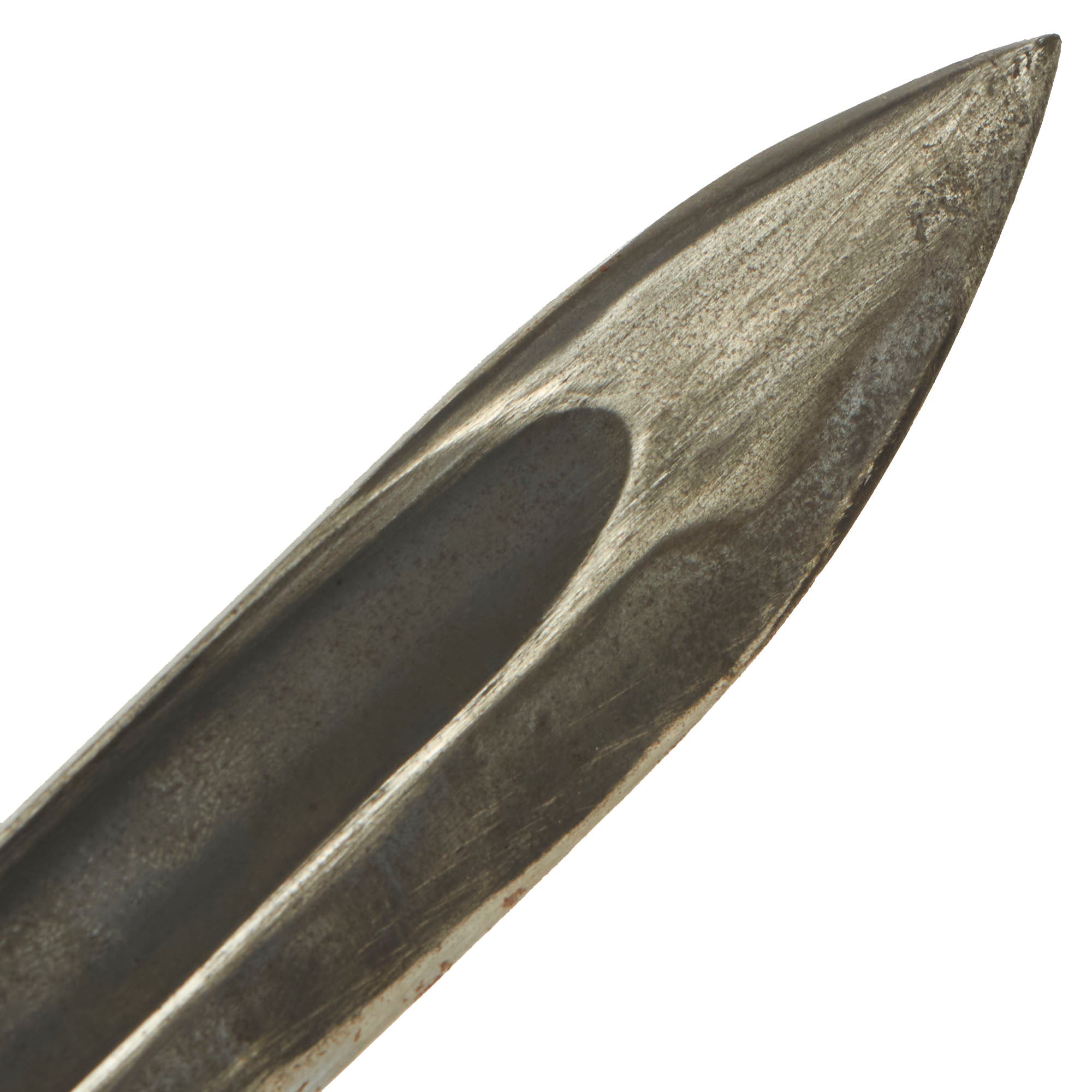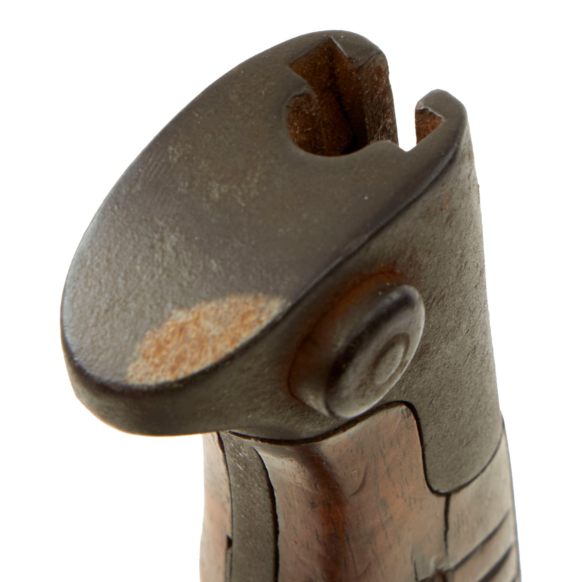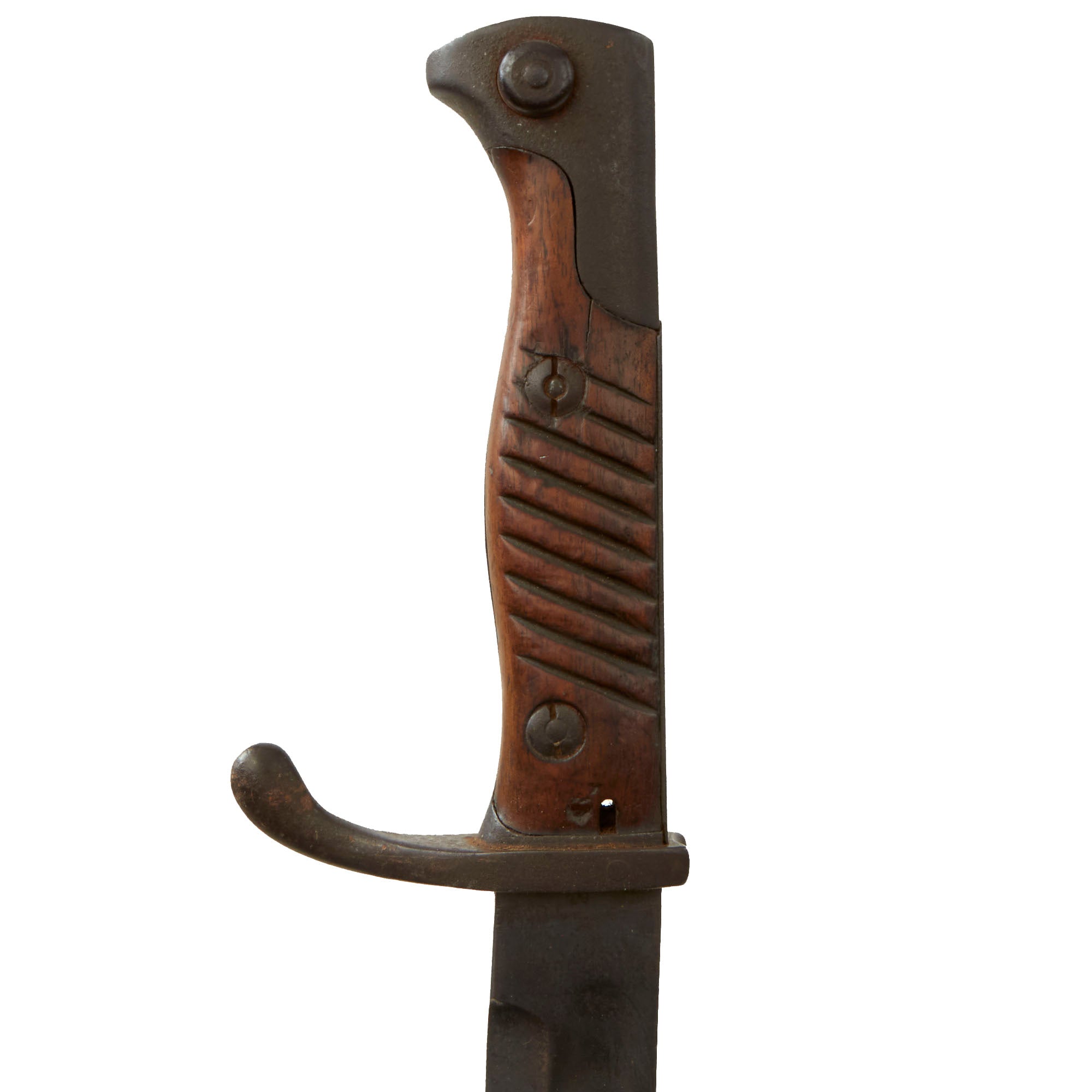 The bayonet blade retains most of its postwar-applied factory darkening, and has a very nice set of original grooved wood grips, with denting and some small cracks and chips from wear. The hilt and crossguard are solid, though the finish is worn to a grayish patina from use and age. Bayonet lock is fully functional. The blade ricasso is maker marked: