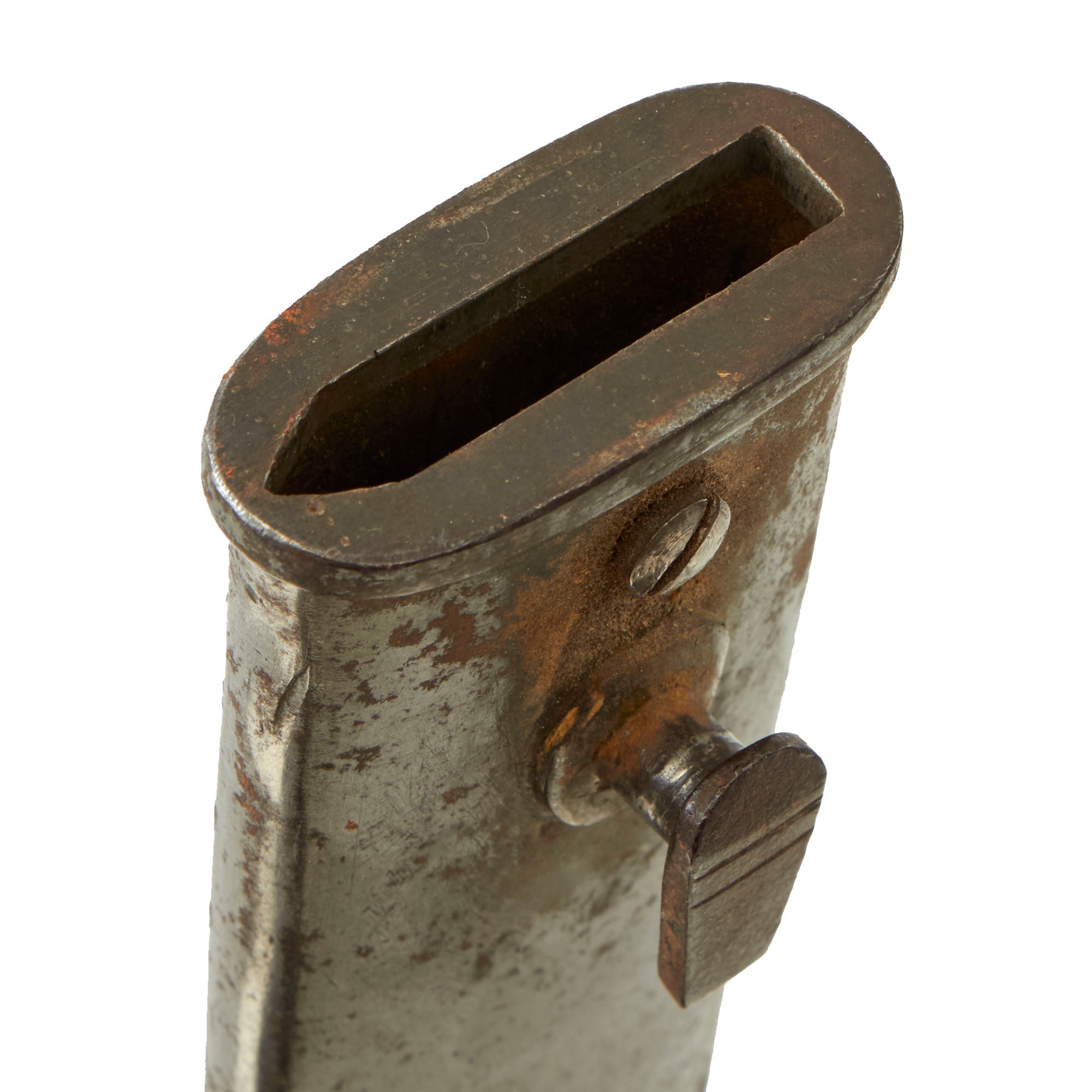 The blade is also dated on the blade's spine 16 under a proof mark of a Crown over W., for Kaiser Wilhelm II, and the year the bayonet was accepted. There are additional markings on the spine and other areas. The blade is in very good condition, with a postwar applied blue finish. The steel scabbard is in good condition, with a worn finish and extensive denting to the exterior. This does not interfere with sheathing the bayonet at all. Postwar, the bayonet was re-issued to the Reichs Air Ministry and is marked RLM on the guard, for Reichsluftfahrtministerium.