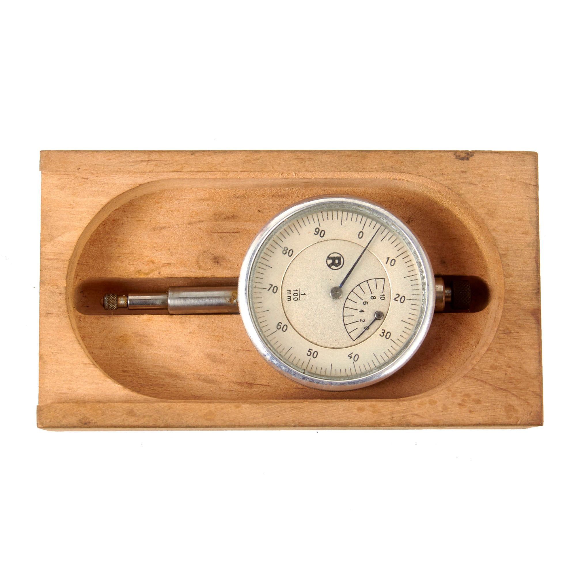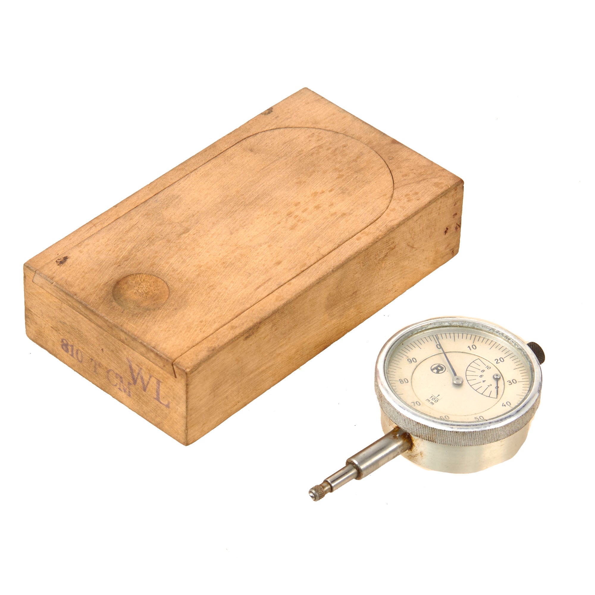 - Pressure Gauge in original wooden case. The gauge works well and is marked TRIPPELWERKE M.U.-132. It is serial numbered 88468 on the back. The dovetail style wooden case measures 5 ¼ x 3 x 1 ¼” and is marked WL 810 T CM. Appears WWII era.