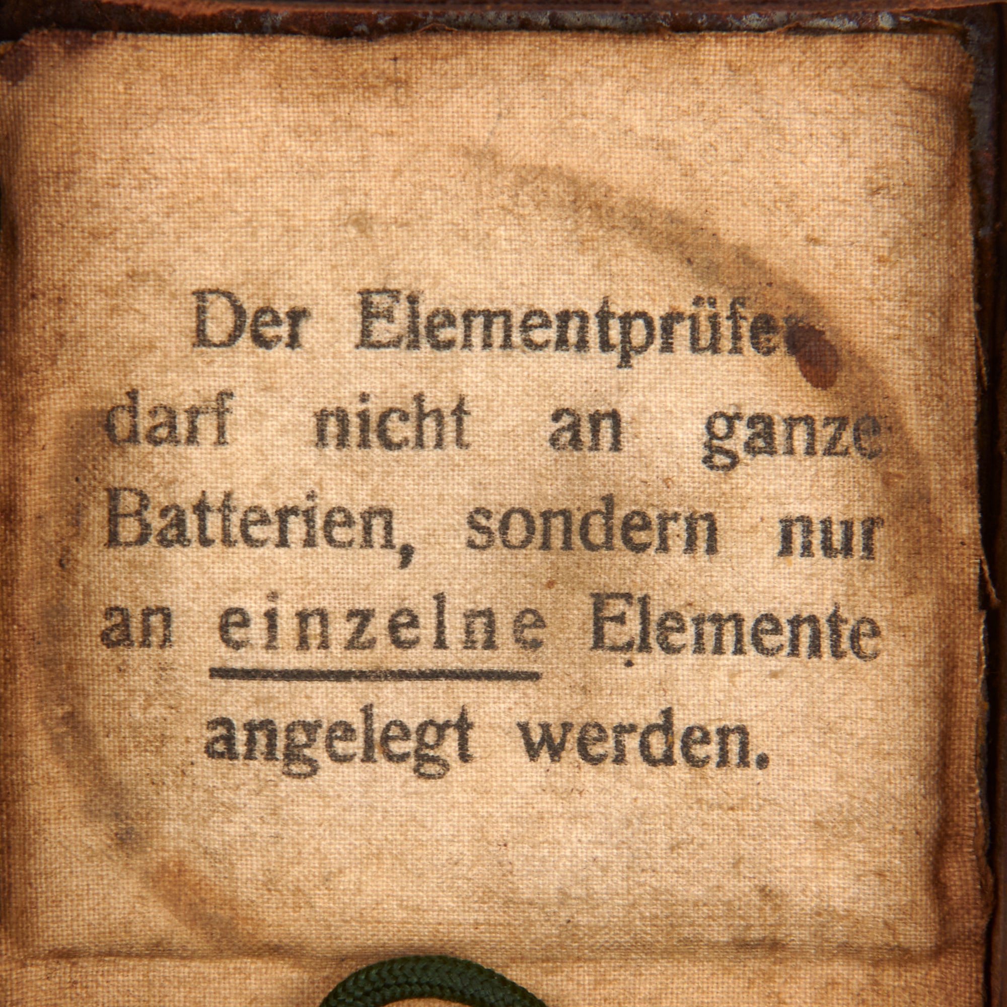 - Voltage meter by Siemens & Halske in original leather case, the wiring shows damage with some repairs but a very solid example. Instructions still intact on interior. The leather case measures 5 x 3 x 1 ½” and is marked F. COBAU BERLIN 1915. The case’s leather strap is broken.