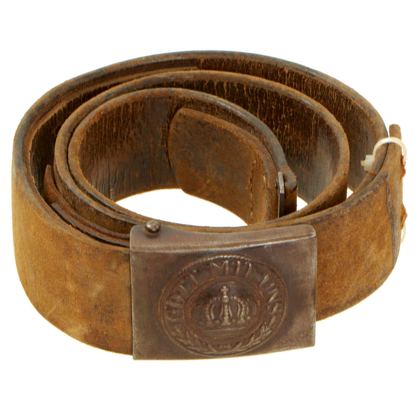 Imperial German WW1 Prussian Gott Mit Uns Belt Buckle With Belt: Makers' information is still able to be seen on the belt. The belt unfortunately is broken and held in place by zip ties. The brass stamped buckle is in great field used condition.
